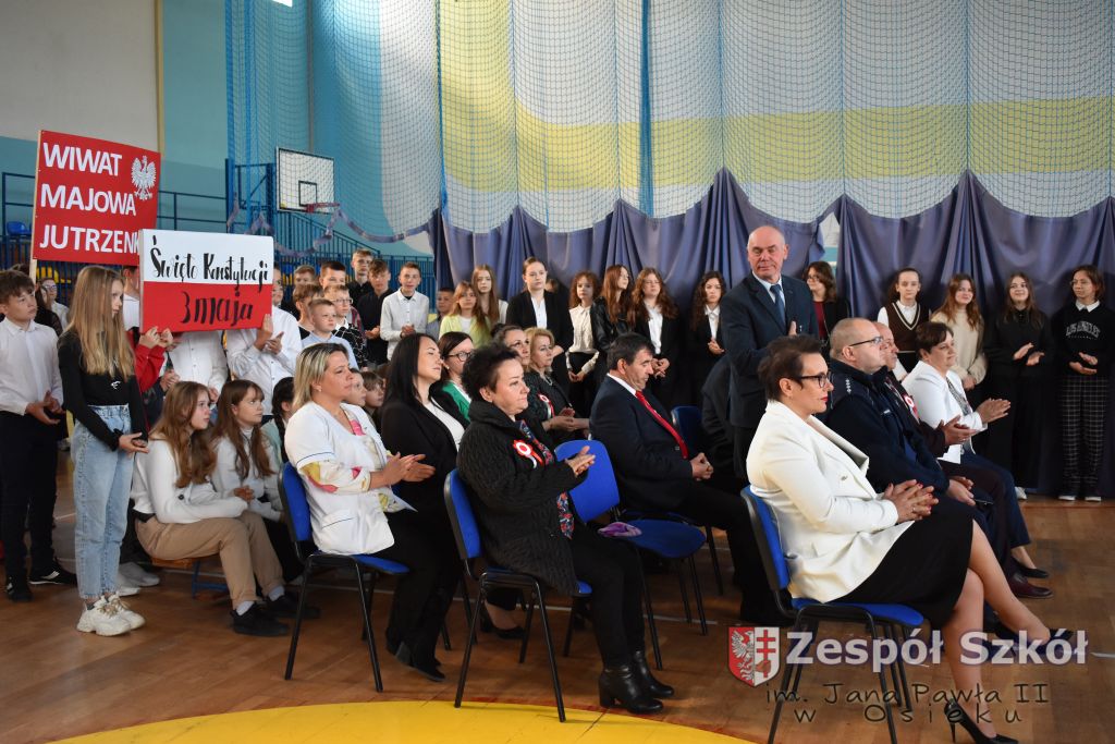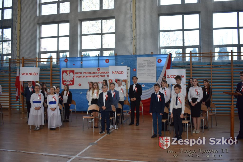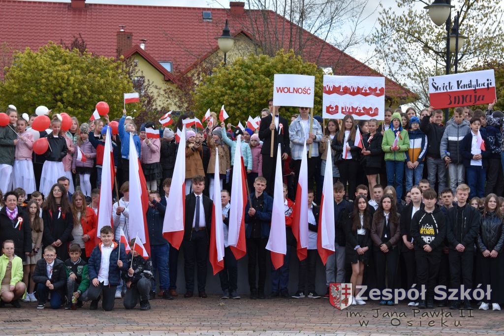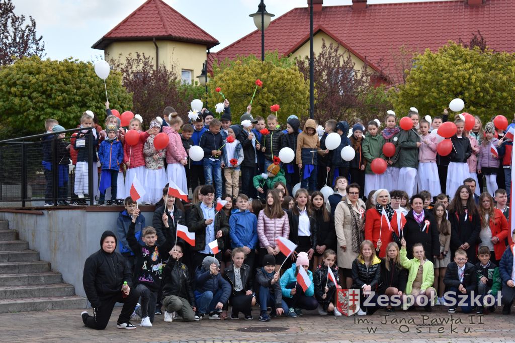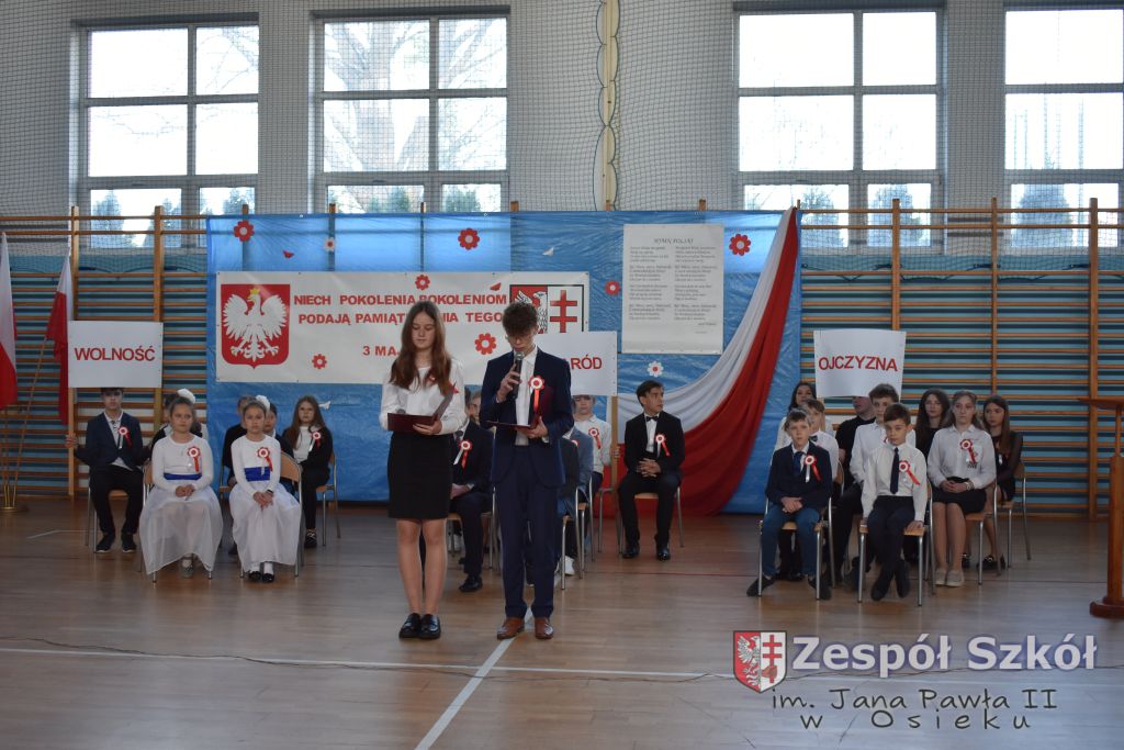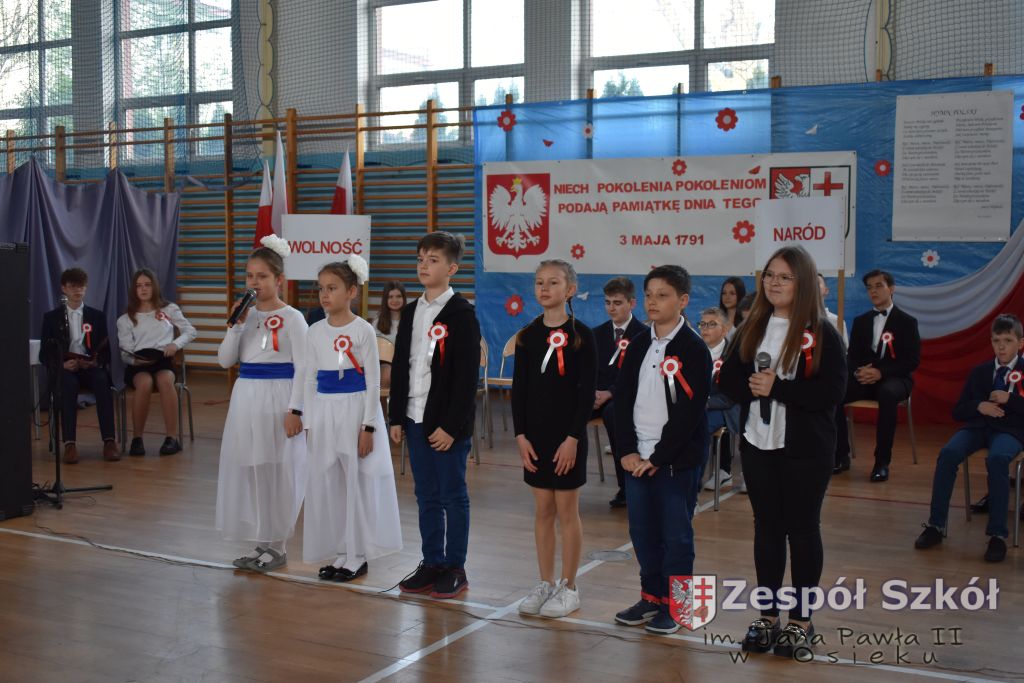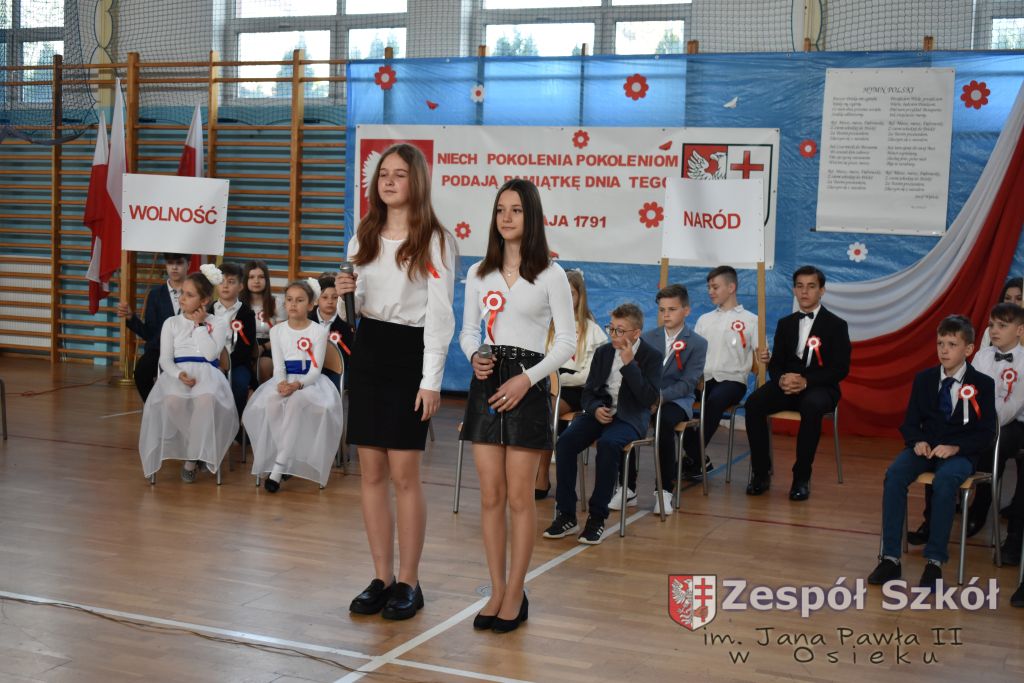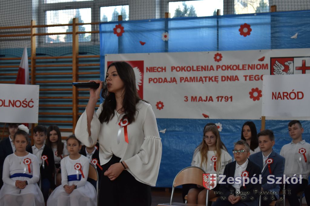 W dniu 27 kwietnia 2023 roku w naszej szkole odbyła się uroczysta akademia z okazji 232 rocznicy uchwalenia Konstytucji 3 Maja. Młodzi artyści biorący udział w akademii, która swoim charakterem nawiązywała do obrad Sejmu 4- letniego starali się w sposób jak najbardziej jasny i zrozumiały przedstawić społeczności uczniowskiej wagę i rolę uchwalonej konstytucji. Ukazali również nadzieję jaką z nowo uchwaloną konstytucją wiązali Polacy. Po zakończonej akademii odbył się ulicami Osieka uroczysty przemarsz uczniów, nauczycieli i zaproszonych gości.