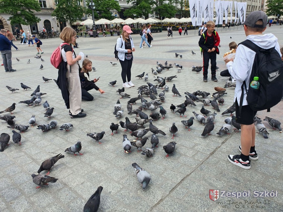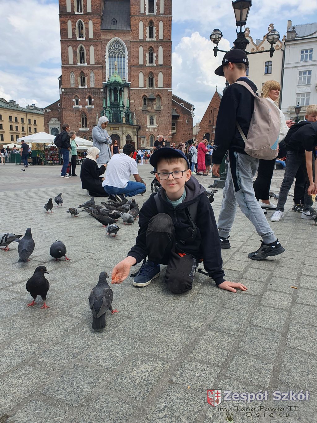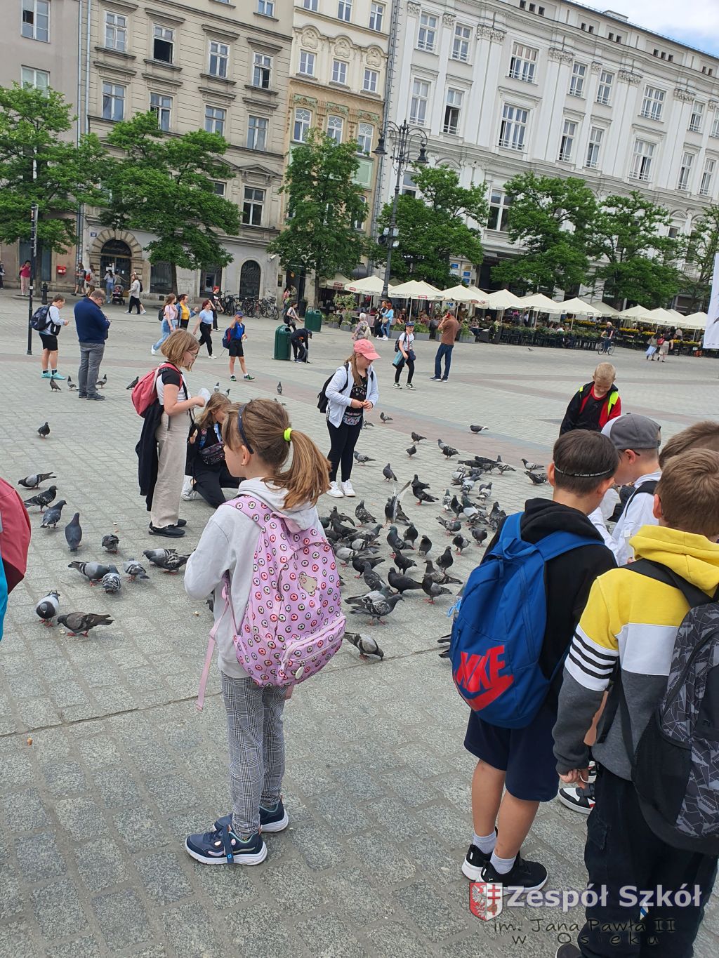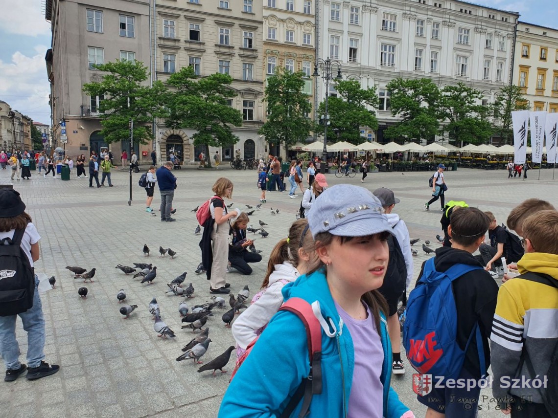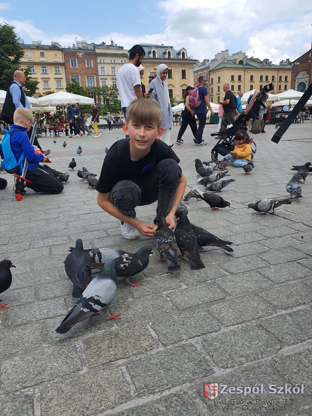 Czekaliśmy, aż trębacz zagra hejnał mariacki. Usłyszeliśmy legendę o przerwanym hejnale, którą opowiedział nam uczeń klasy IVa, Filip Mikus. Pan przewodnik powiedział, że jeśli trębacz nam odmacha, ma to oznaczać nasz powrót do Krakowa. Wszystko wskazuje na to, że odwiedzimy jeszcze to piękne miasto. Wraz z przewodnikiem odwiedziliśmy jeszcze kilka innych zabytkowych miejsc, m.in. Muzeum Uniwersytetu Jagiellońskiego, Zamek Królewski na Wawelu, starą jamę smoka wawelskiego oraz współczesnego ziejącego ogniem smoka. Dowiedzieliśmy się także więcej o Janie Pawle II oraz o krakowskich gołębiach.