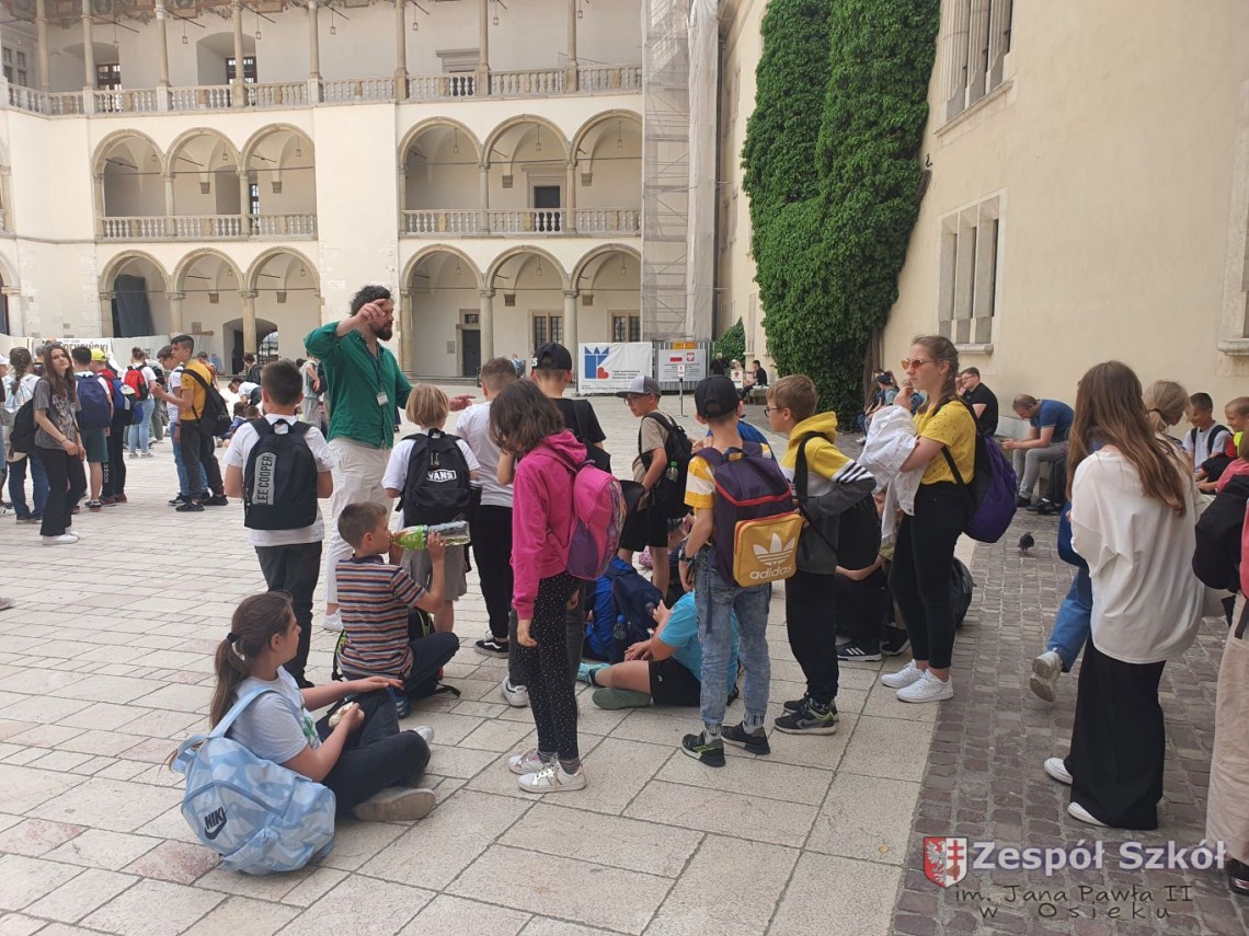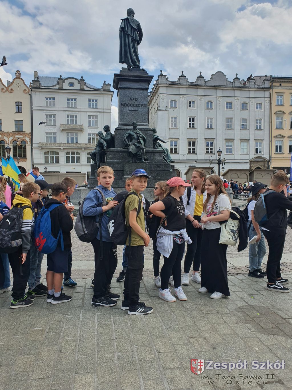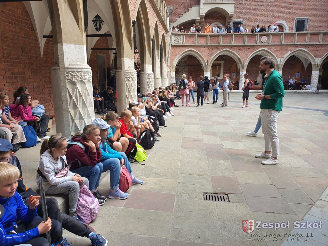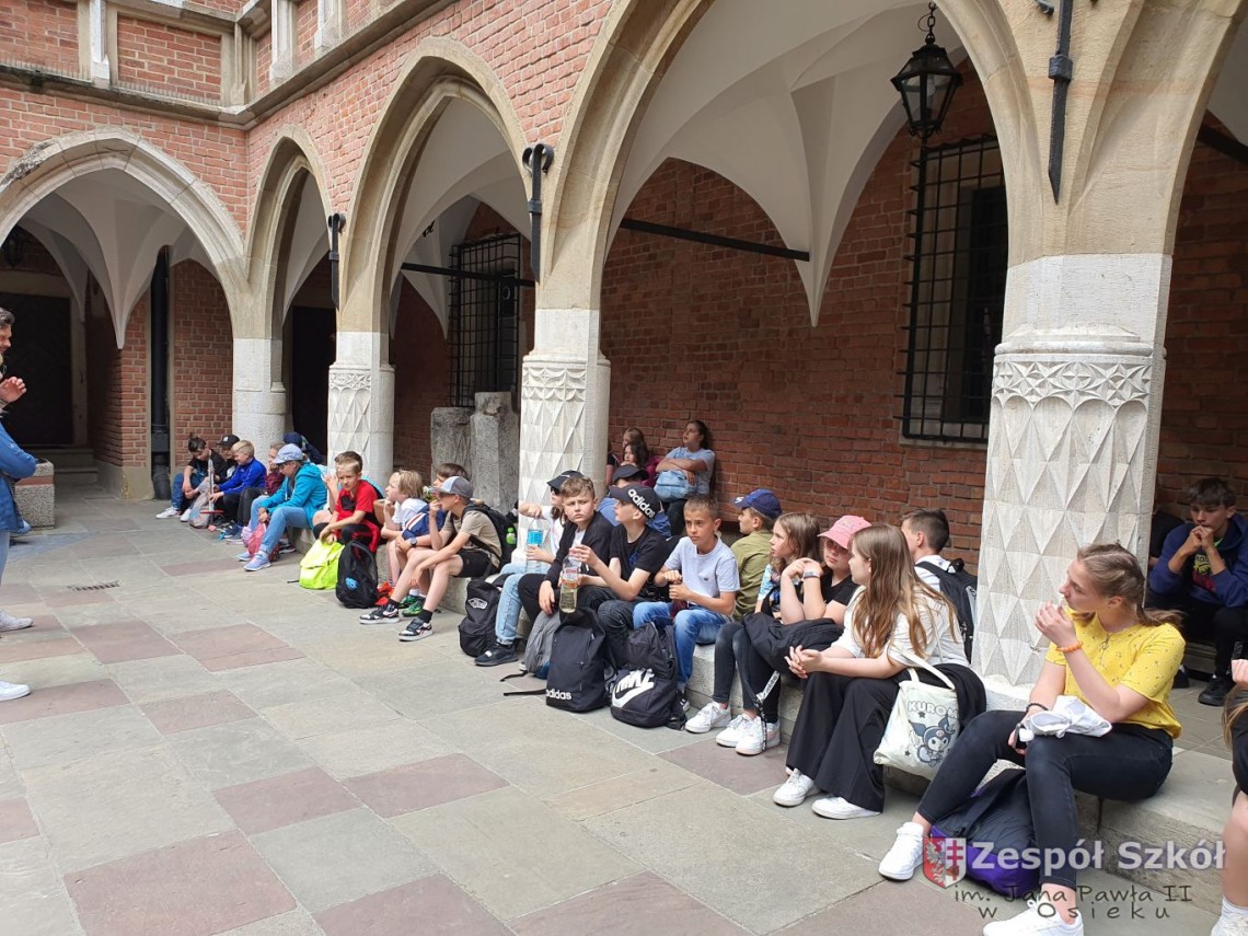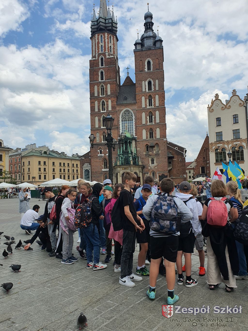 Czekaliśmy, aż trębacz zagra hejnał mariacki. Usłyszeliśmy legendę o przerwanym hejnale, którą opowiedział nam uczeń klasy IVa, Filip Mikus. Pan przewodnik powiedział, że jeśli trębacz nam odmacha, ma to oznaczać nasz powrót do Krakowa. Wszystko wskazuje na to, że odwiedzimy jeszcze to piękne miasto. Wraz z przewodnikiem odwiedziliśmy jeszcze kilka innych zabytkowych miejsc, m.in. Muzeum Uniwersytetu Jagiellońskiego, Zamek Królewski na Wawelu, starą jamę smoka wawelskiego oraz współczesnego ziejącego ogniem smoka. Dowiedzieliśmy się także więcej o Janie Pawle II oraz o krakowskich gołębiach.