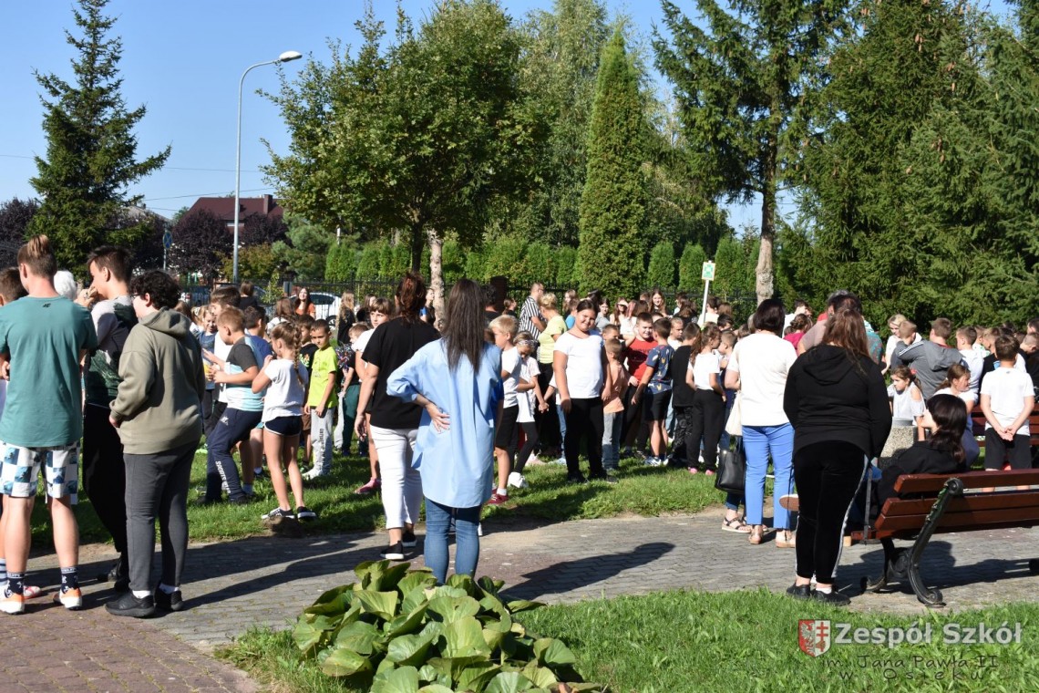 Wszyscy zareagowali na alarm pożarowy w prawidłowy sposób oraz postępowali zgodnie z wyznaczonym przydziałem obowiązków. Uczniowie zachowywali się spokojnie i poruszali szybko. Pod opieką nauczycieli opuścili pomieszczenia oraz wyruszyli na miejsca zbiórki dla ewakuowanych osób. Dokładnie sprawdzony został stan wszystkich pomieszczeń szkoły po ich opuszczeniu.