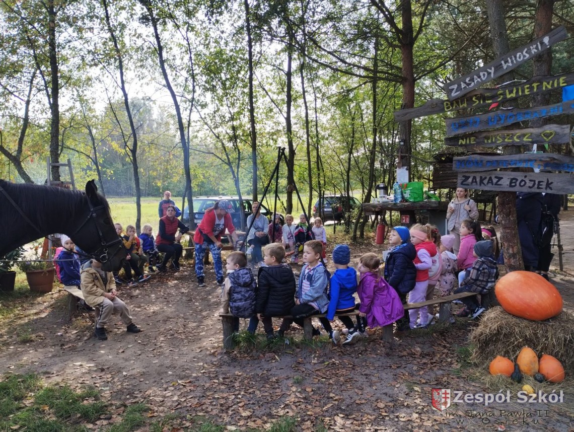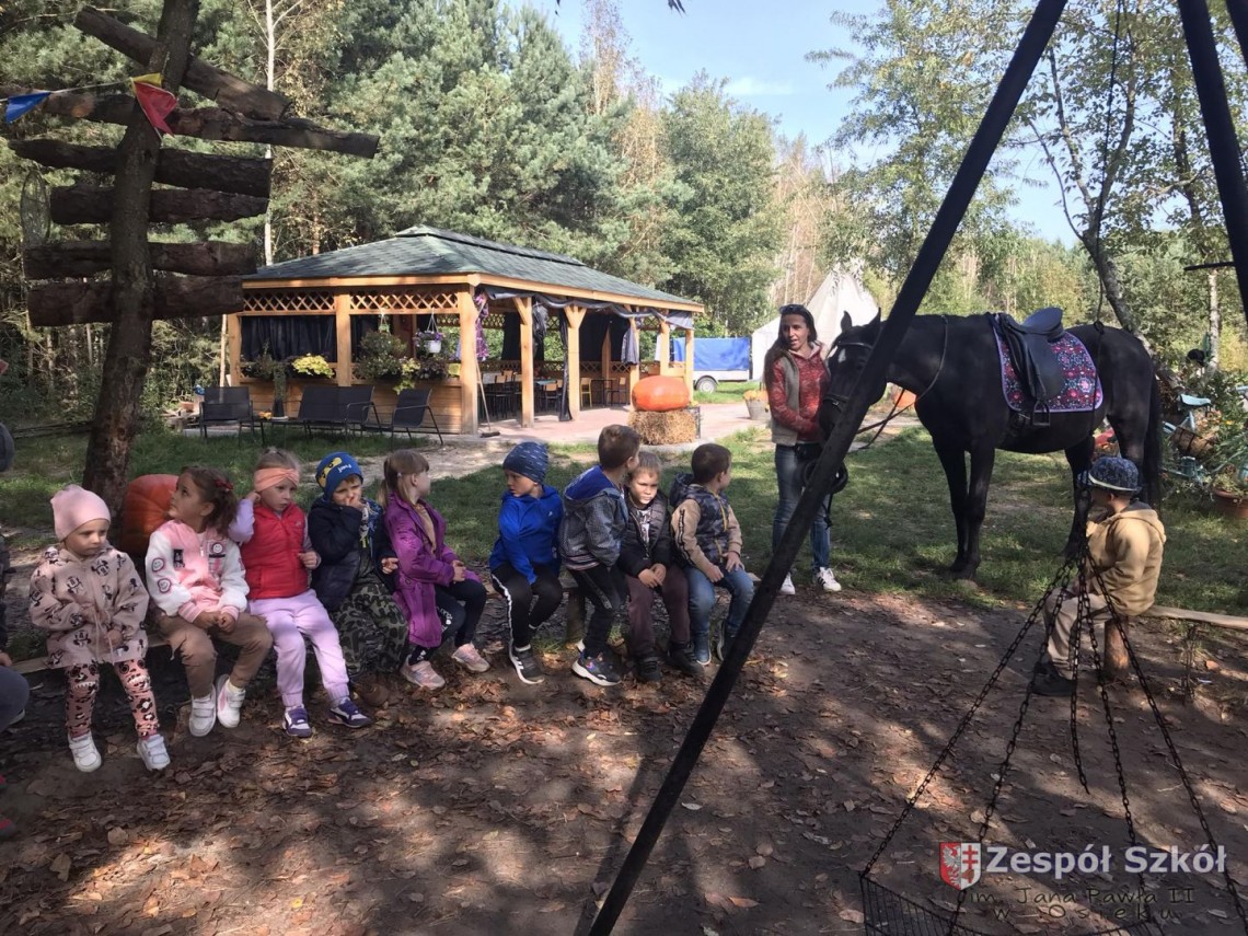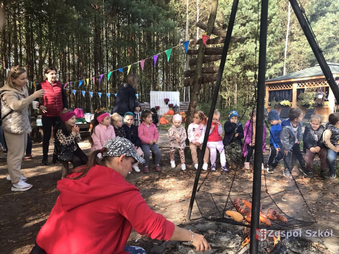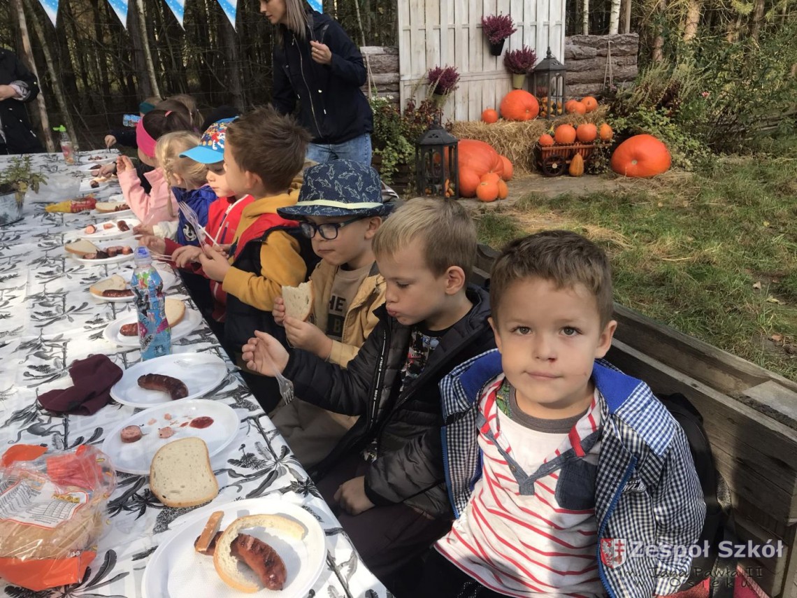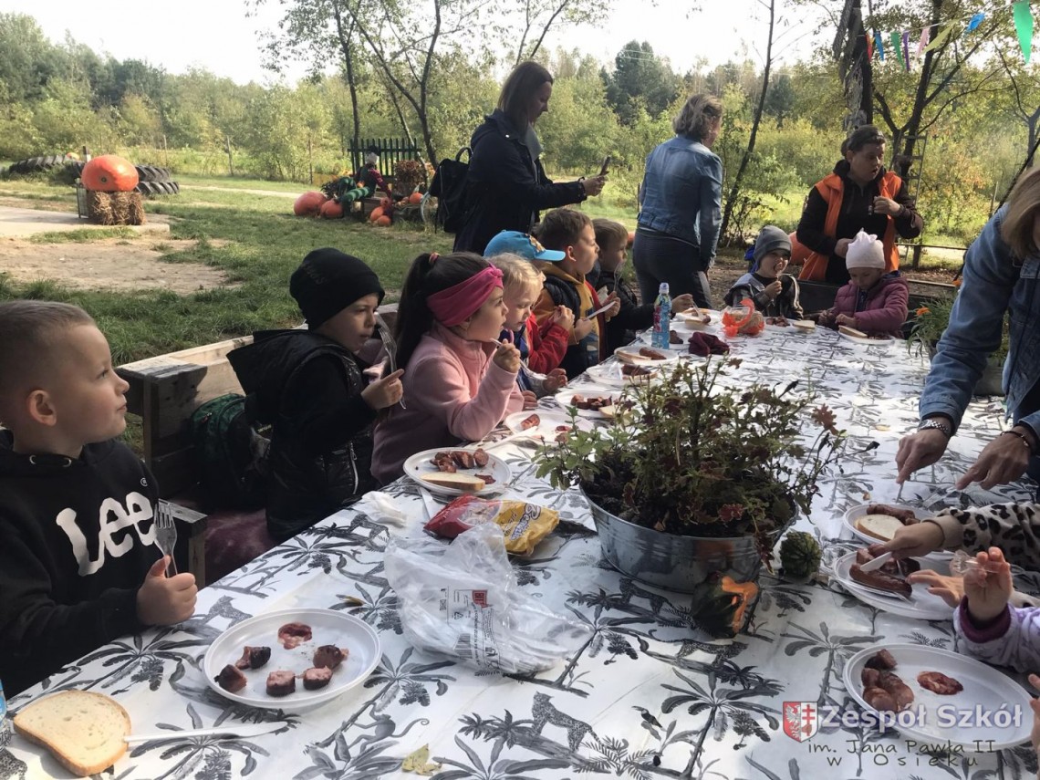 5 października przedszkolaki z grup 4 i 5 latków miały okazję zagościć w uroczej, Dyniowej Wiosce w Stalach. Na dzieci czekało tam dużo atrakcji: udział w warsztatach kreatywnych- wykonanie własnej ecotorby, gra terenowa, przejażdżka na koniu i mnóstwo zabaw na świeżym powietrzu. Jedną z atrakcji było ognisko i pieczenie kiełbasek. Po tak długim pobycie na świeżym powietrzu dzieci wcinały, aż miło, nawet z dokładkami! Było SUPER!