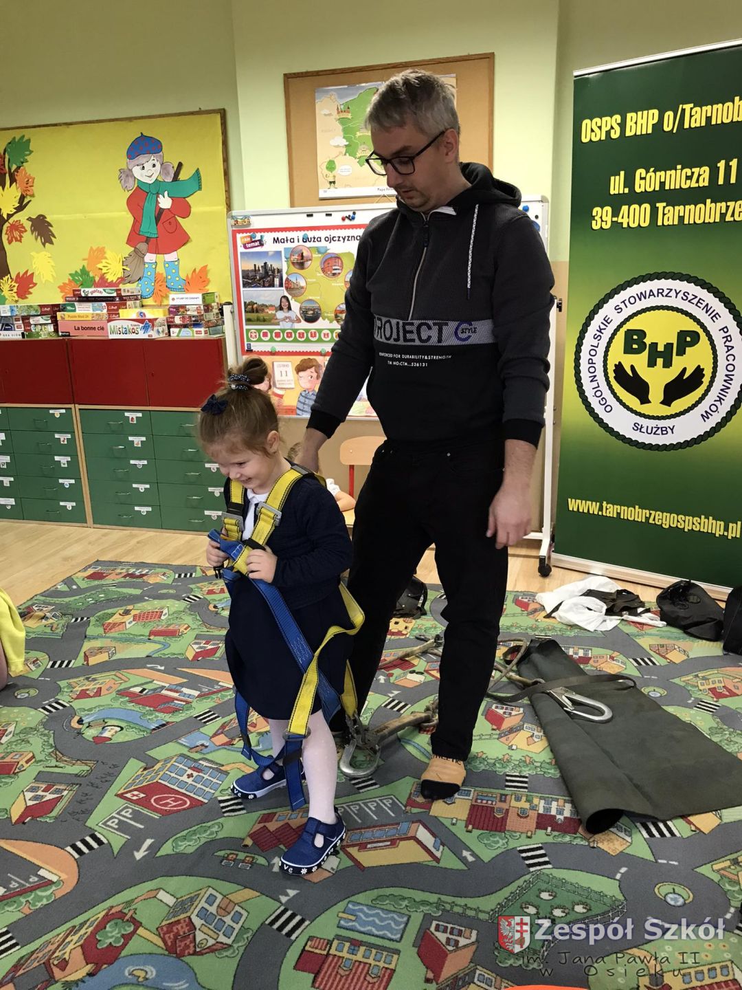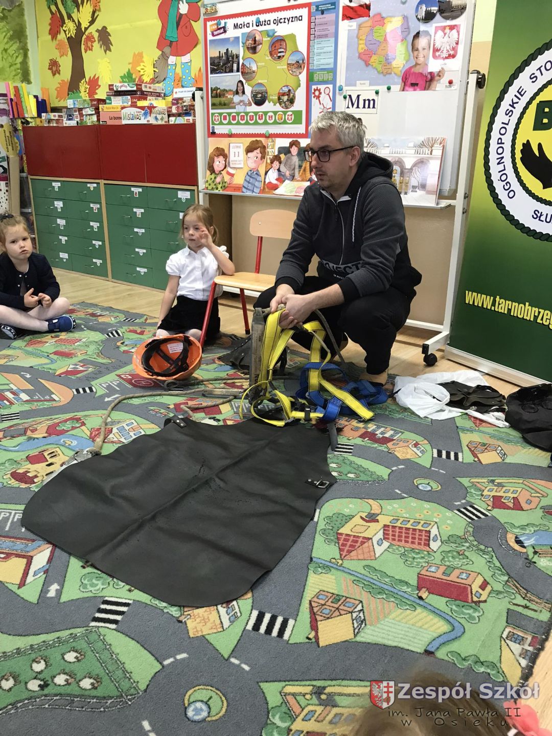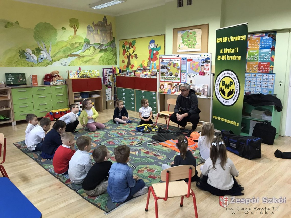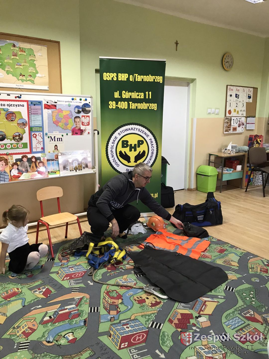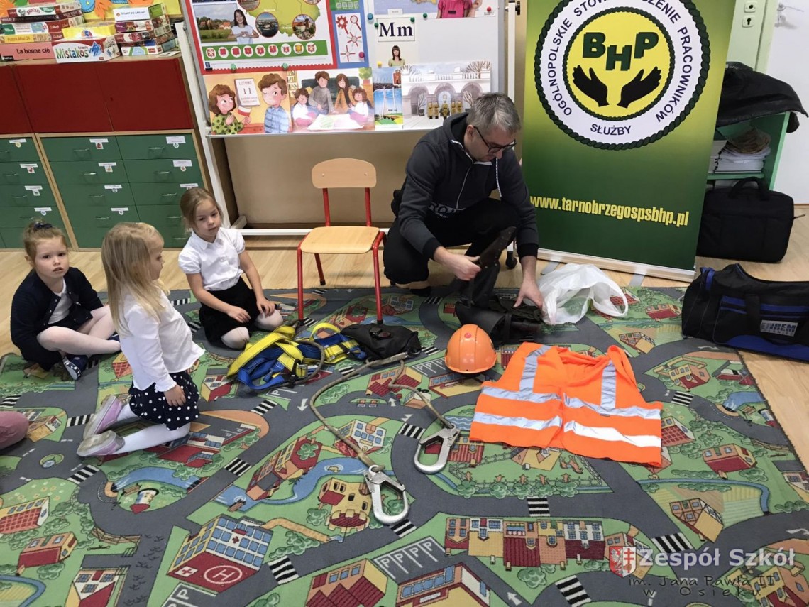 Gość opowiedział o bezpieczeństwie podczas wykonywania różnego typu prac, zaprezentował specjalne ubrania ochronne, które dzieci mogły przymierzyć. Przypomniał dzieciom numery alarmowe i pokazał kolejne etapy udzielania pierwszej pomocy.