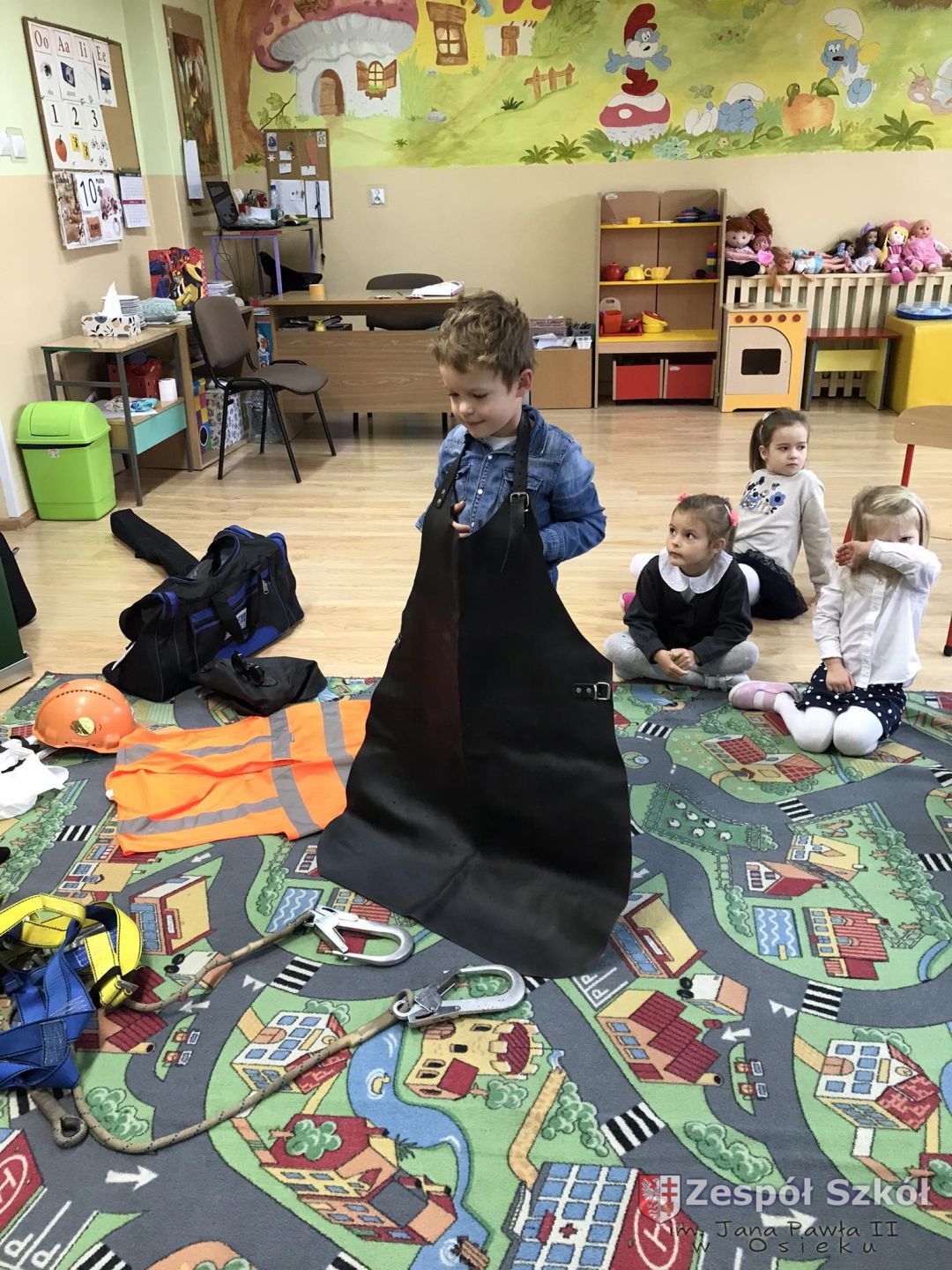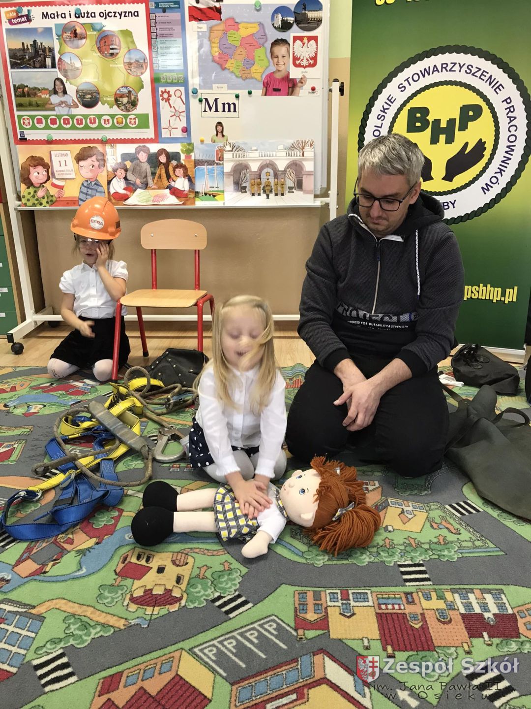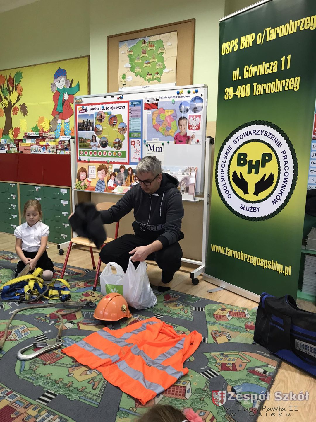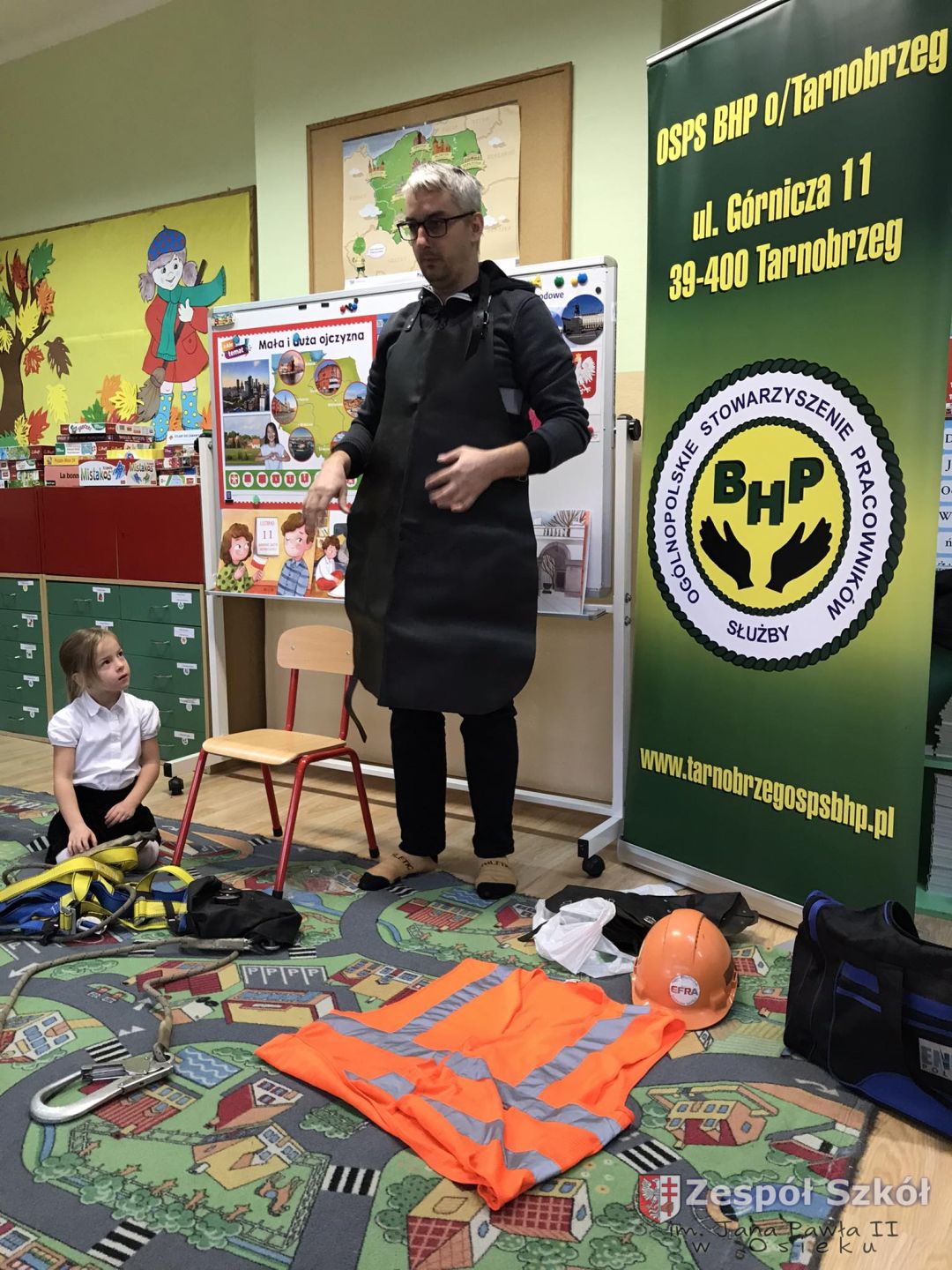 Gość opowiedział o bezpieczeństwie podczas wykonywania różnego typu prac, zaprezentował specjalne ubrania ochronne, które dzieci mogły przymierzyć. Przypomniał dzieciom numery alarmowe i pokazał kolejne etapy udzielania pierwszej pomocy.