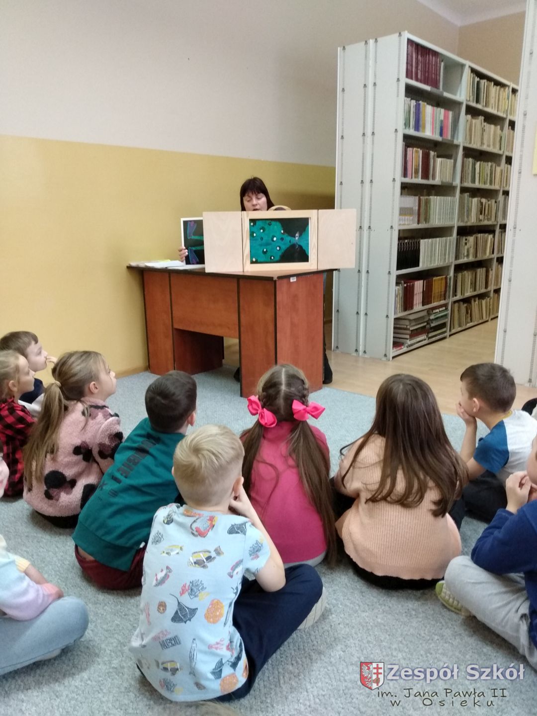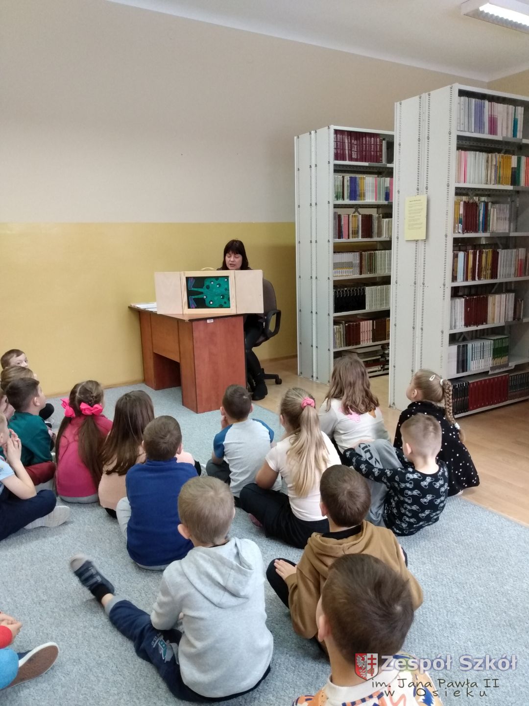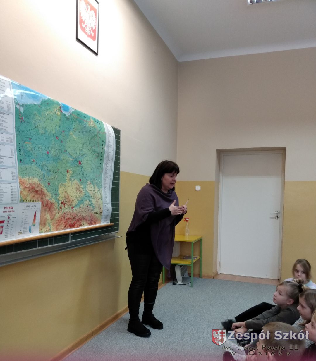 16 stycznia br. uczniowie klas pierwszych i drugiej uczestniczyli w zajęciach edukacyjnych przeprowadzonych przez panią Dorotę Wójcik – pracownika Pedagogicznej Biblioteki Wojewódzkiej w Kielcach Filia w Staszowie, która za pomocą teatrzyku kamishibai przedstawiła im „Bajkę o Wiśle” autorstwa Magdaleny Zarębskiej. Oglądając kolejne ilustracje wsuwane do drewnianego butai dzieci odbyły wycieczkę z nurtem największej polskiej rzeki, od jej źródeł – Czarnej i Białej Wisełki wypływających z Beskidu Śląskiego, aż do ujścia w Zatoce Gdańskiej, skąd wpada do Morza Bałtyckiego.