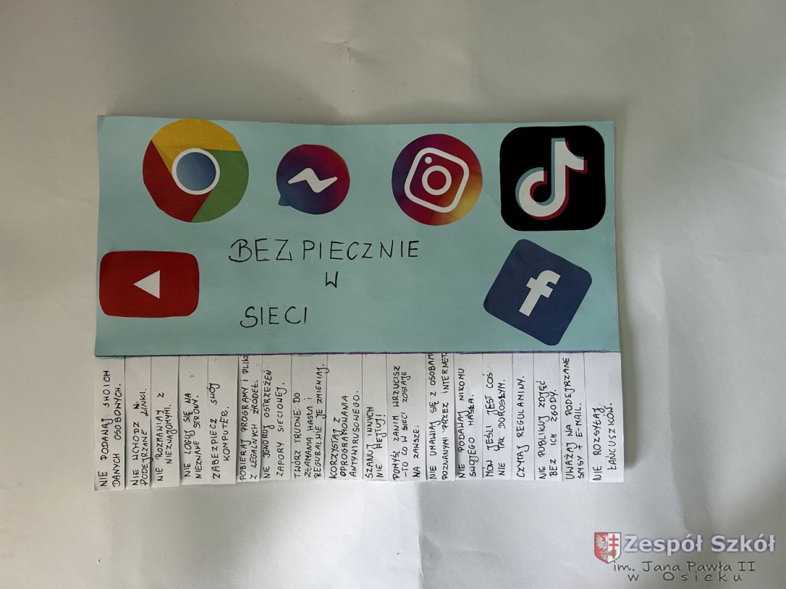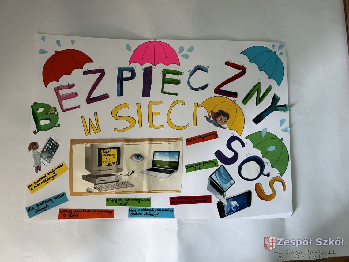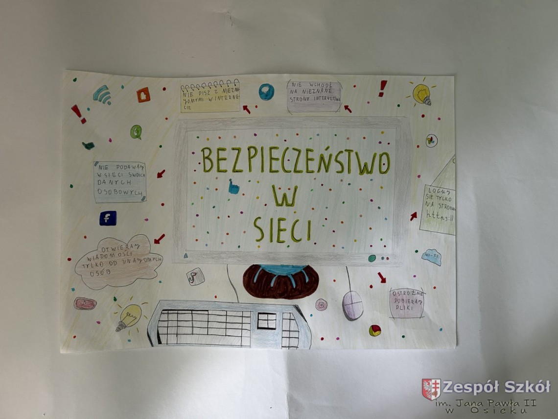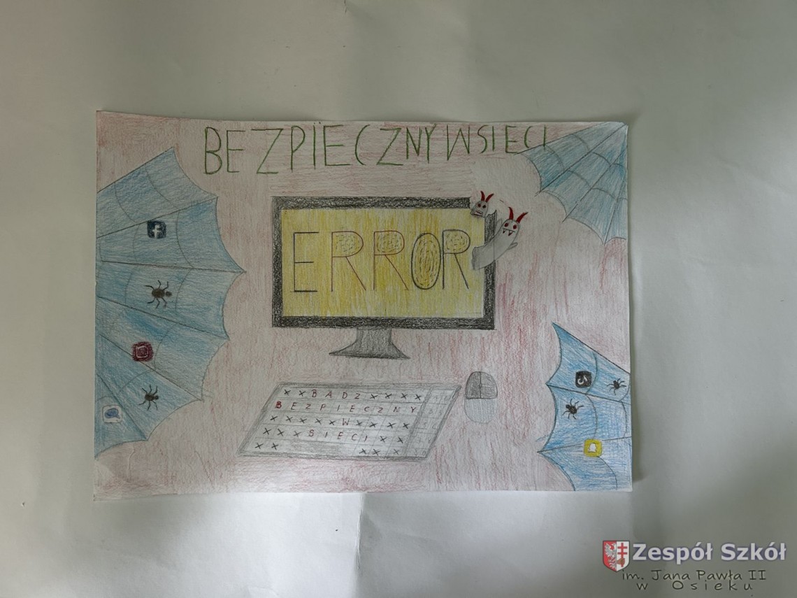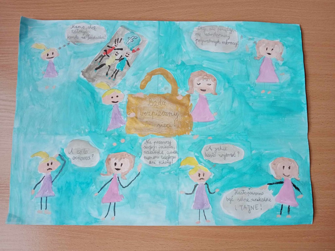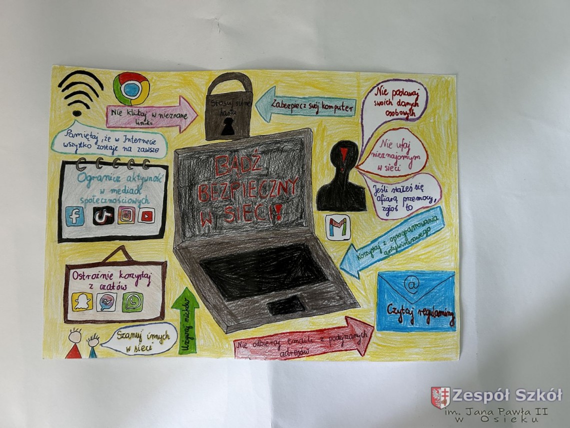 Szkolny Konkurs „Bądź bezpieczny w sieci!” został przeprowadzony w ramach obchodów Międzynarodowego Dnia Bezpiecznego Internetu. Wzięli w nim udział uczniowie klas I – III (pierwsza kategoria), klas IV – VI (druga kategoria) i klas VII – VIII (trzecia kategoria), przygotowując prace plastyczne lub memy promujące zasady bezpiecznego korzystania z Internetu.