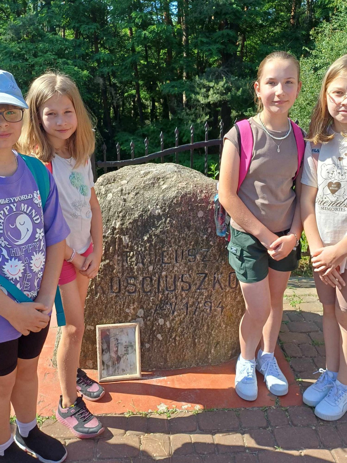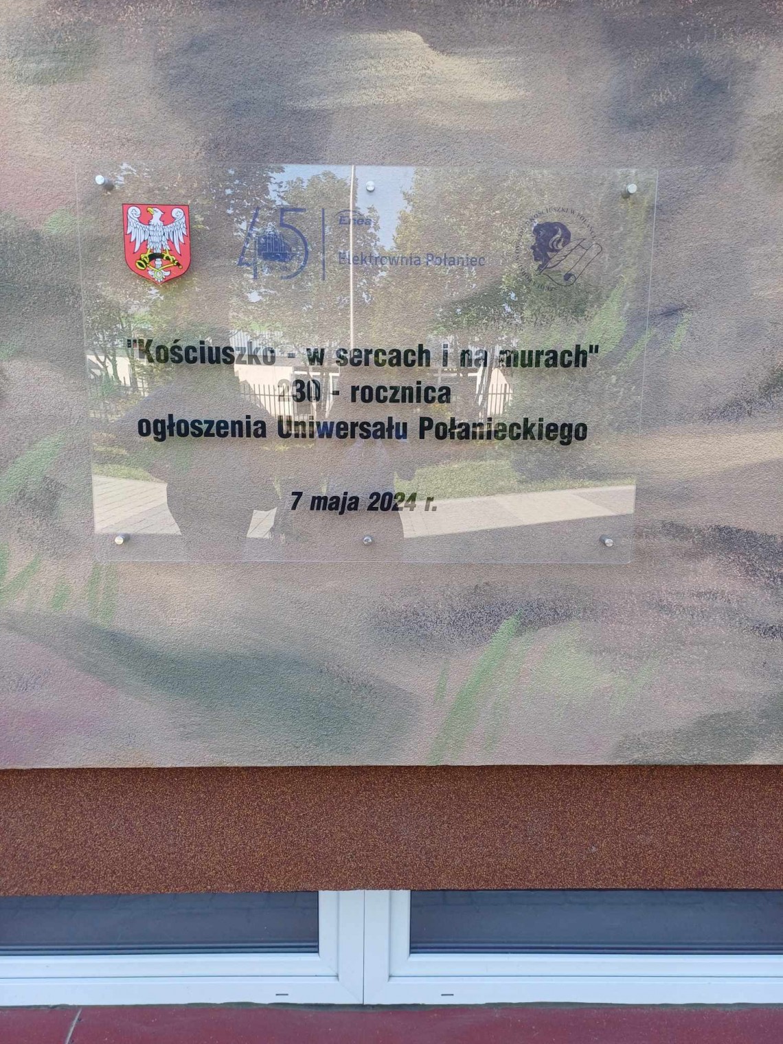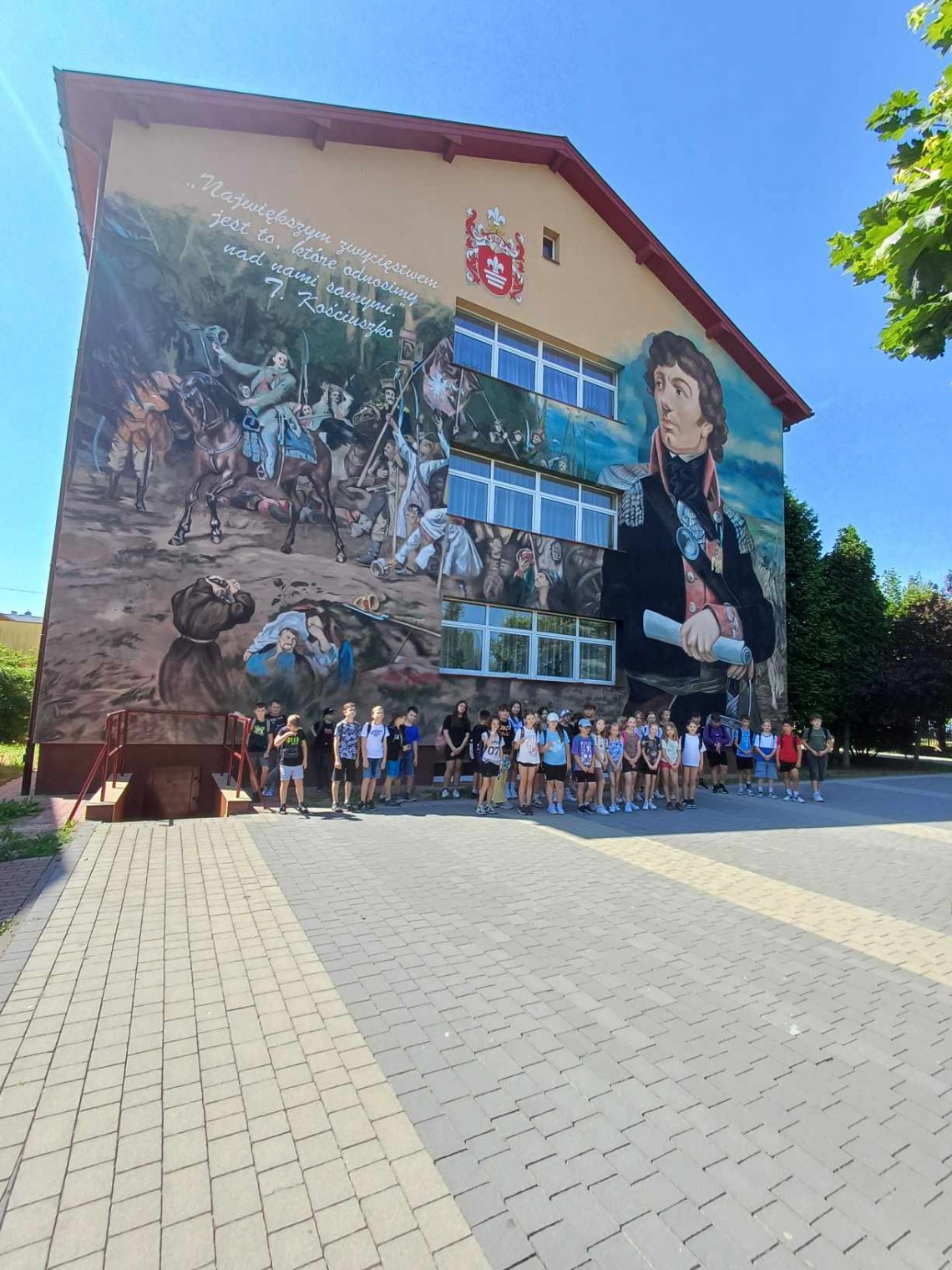 Następnie udaliśmy się przed budynek Publicznej Szkoły Podstawowej im. Tadeusza Kościuszki, aby podziwiać piękny mural poświęcony patronowi szkoły, upamiętniający 230. rocznicę ogłoszenia Uniwersału Połanieckiego, czyli historycznego dokumentu wydanego przez Tadeusza Kościuszkę w 1794 roku. Mural stworzyli absolwenci Akademii Sztuk Pięknych w Warszawie, a ich praca jest imponująca! Możemy na nim dostrzec wyłaniające się sceny z epoki, postacie związane z Uniwersałem Połanieckim i Insurekcją Kościuszkowską , a także symbole patriotyzmu i walki o wolność. Odsłonięcie muralu odbyło się 5 maja 2024r.