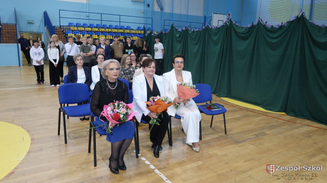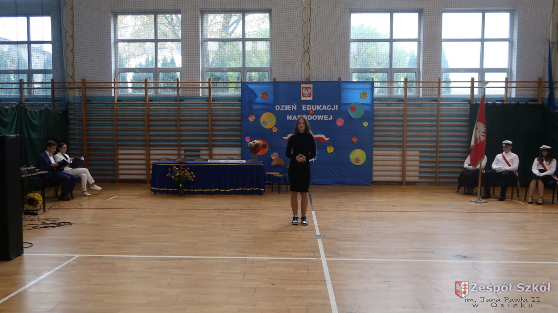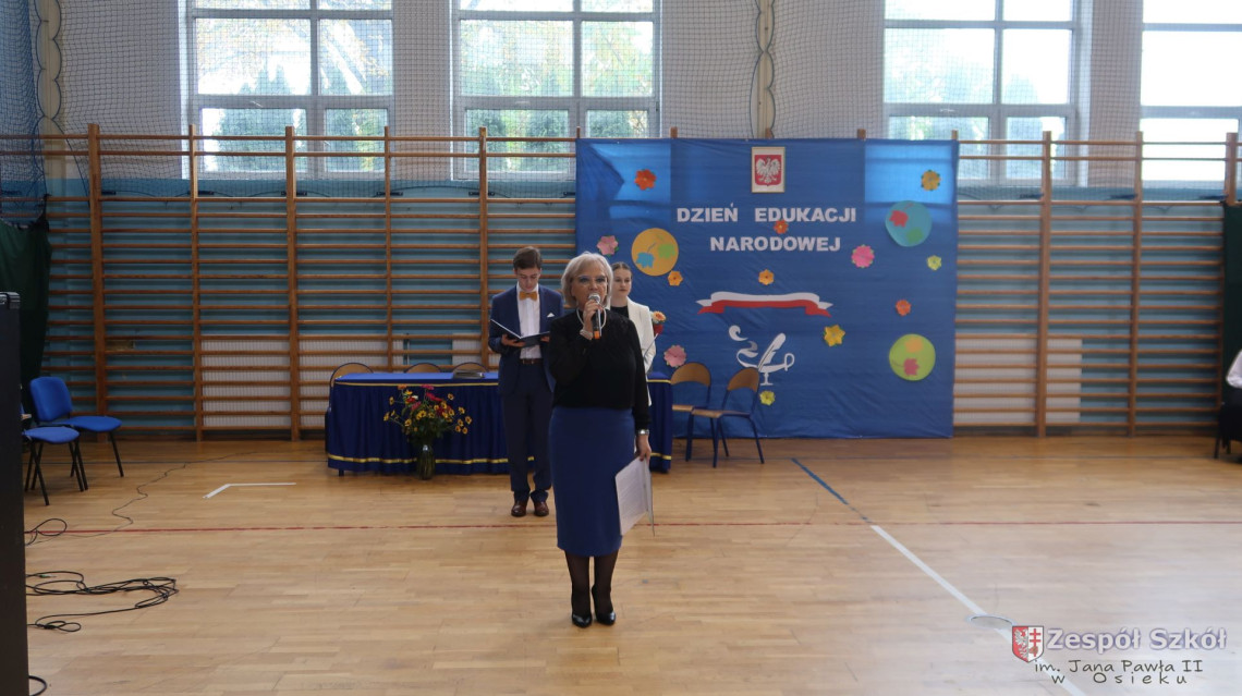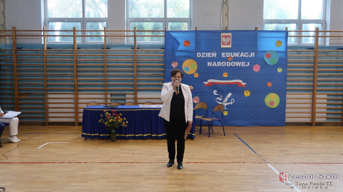 Akademię rozpoczęła przemówieniem dyrektor Zespołu Szkół im. Jana Pawła II w Osieku pani Małgorzata Kunowska, która serdecznie powitała wszystkich zebranych na tej uroczystości. Pani dyrektor złożyła życzenia nauczycielom i pracownikom szkoły oraz wręczyła Nagrody Dyrektora.