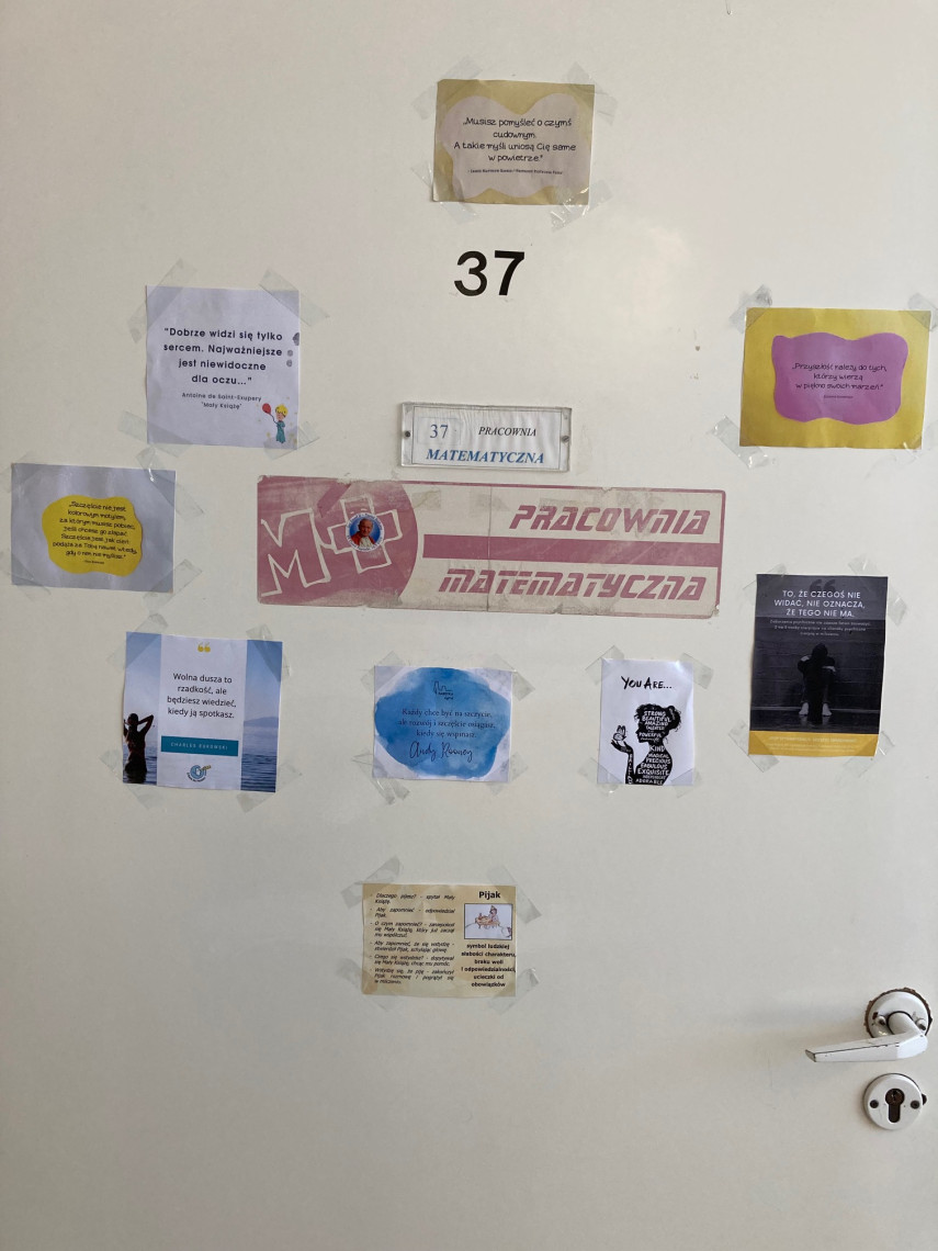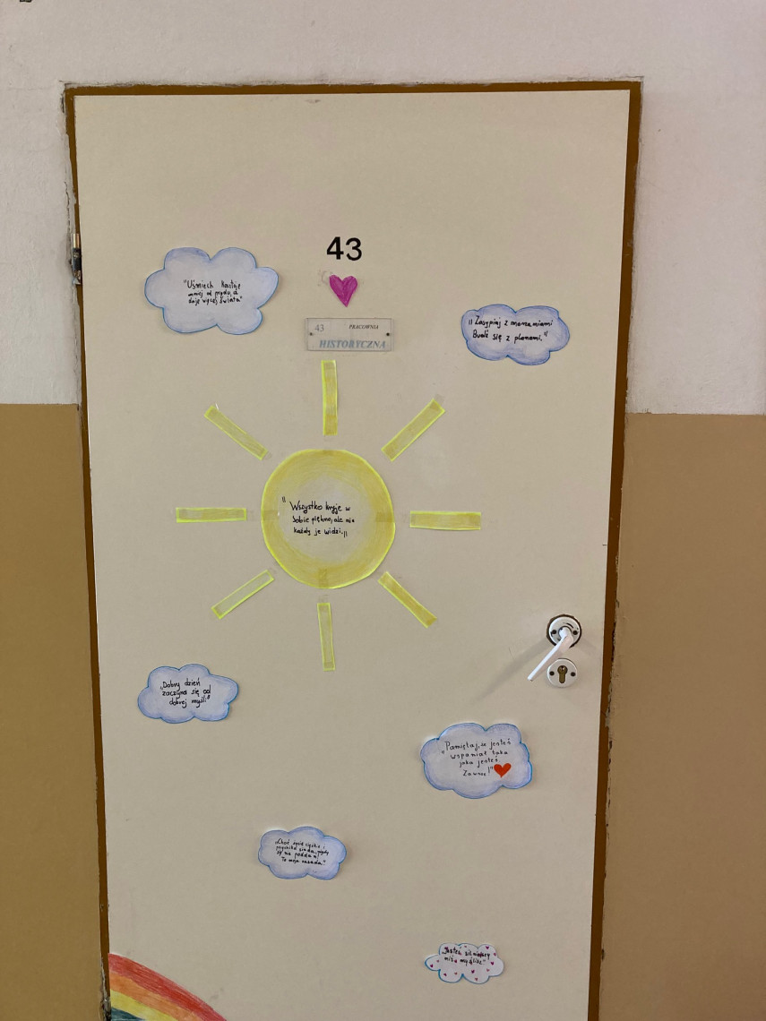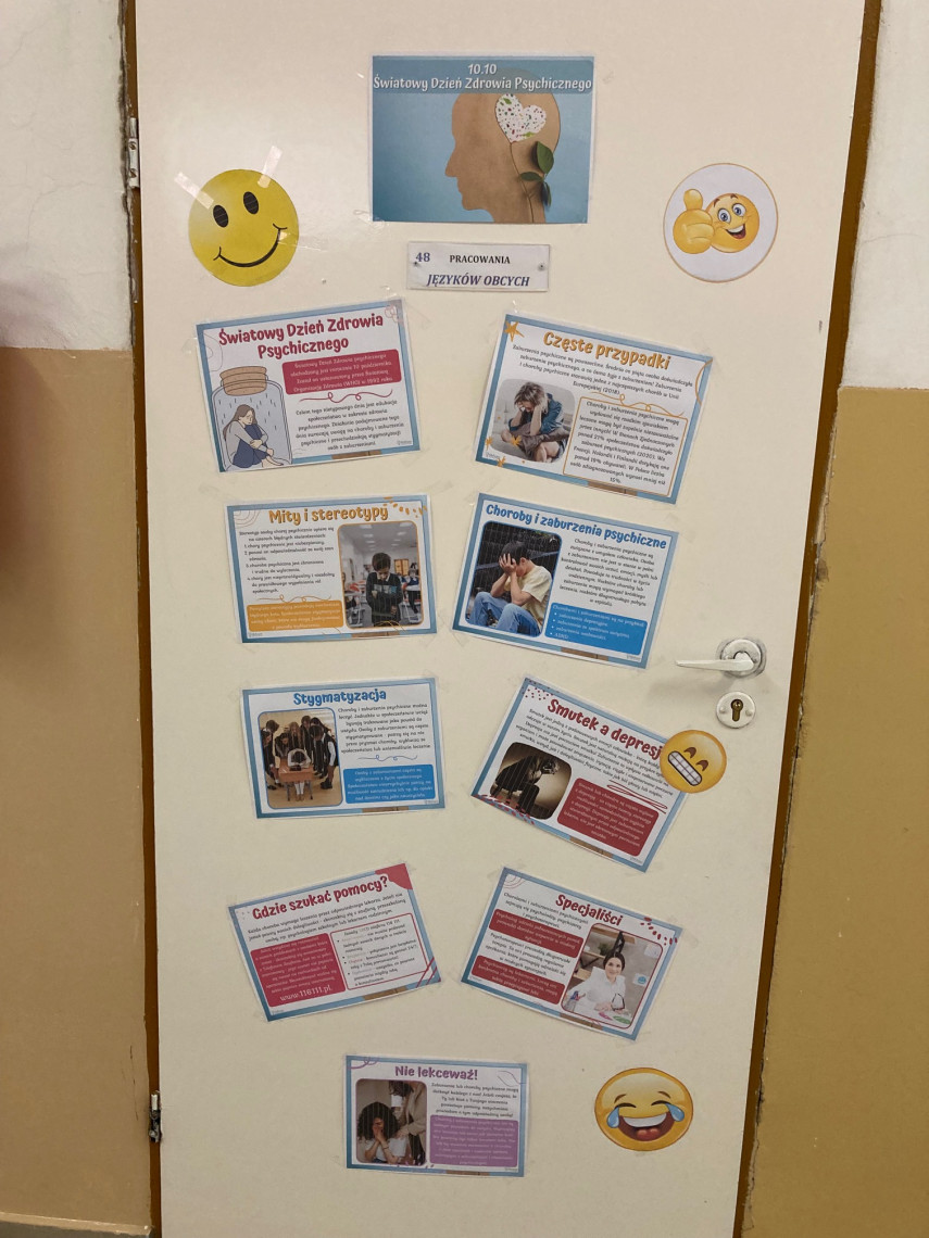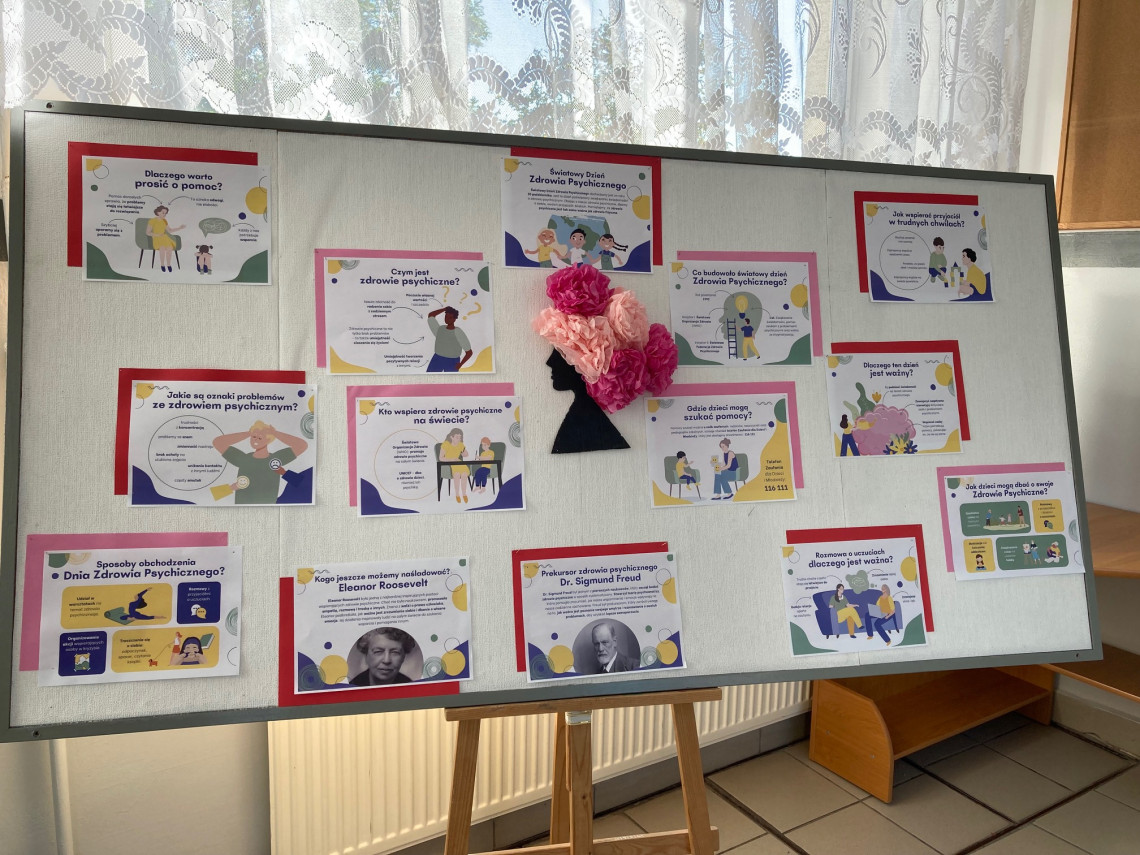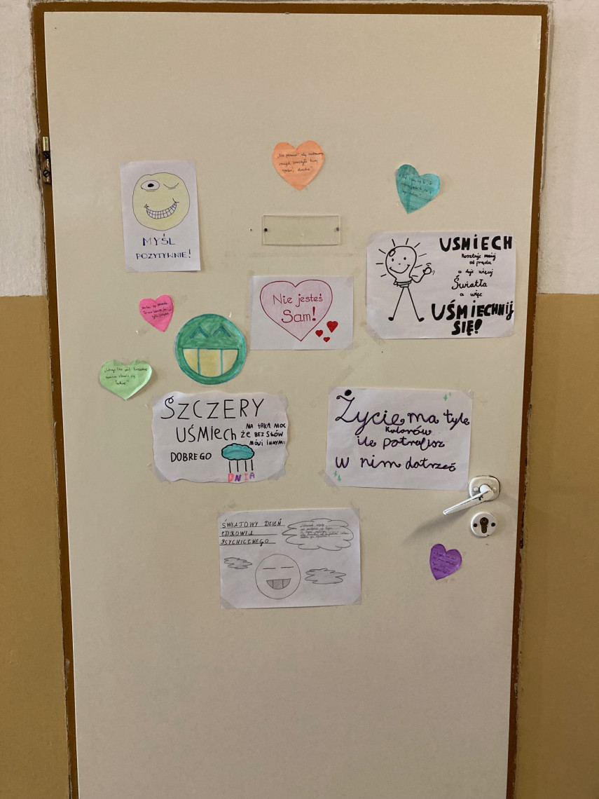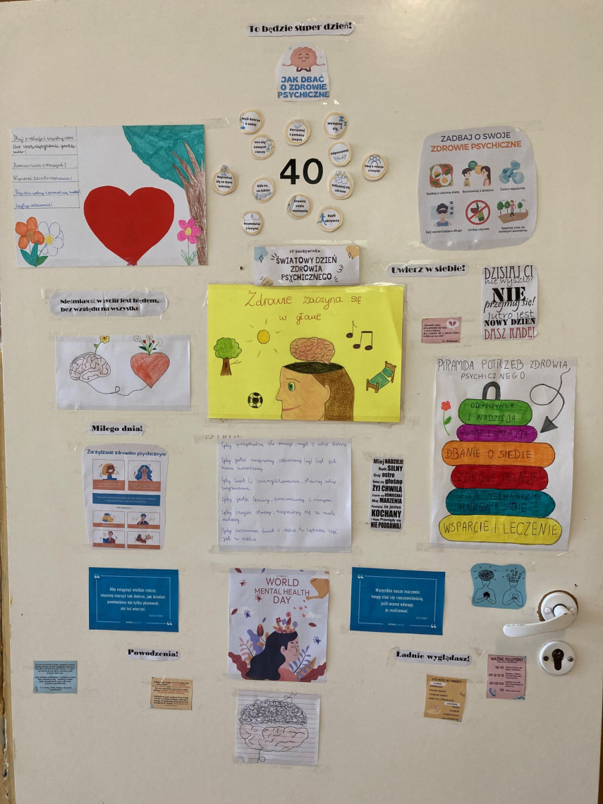 Przygotowana została gazetka informacyjna w korytarzu szkolnym na temat profilaktyki zdrowia psychicznego, a także wiadomości z numerami telefonów zaufania, gdzie osoby potrzebujące wparcia mogą szukać pomocy. Zorganizowano również ogólnoszkolną akcję plakatową z pozytywnymi myślami na drzwiach do sal lekcyjnych. Umieszczono na nich cytaty, myśli, ilustracje wspierające uczniów.