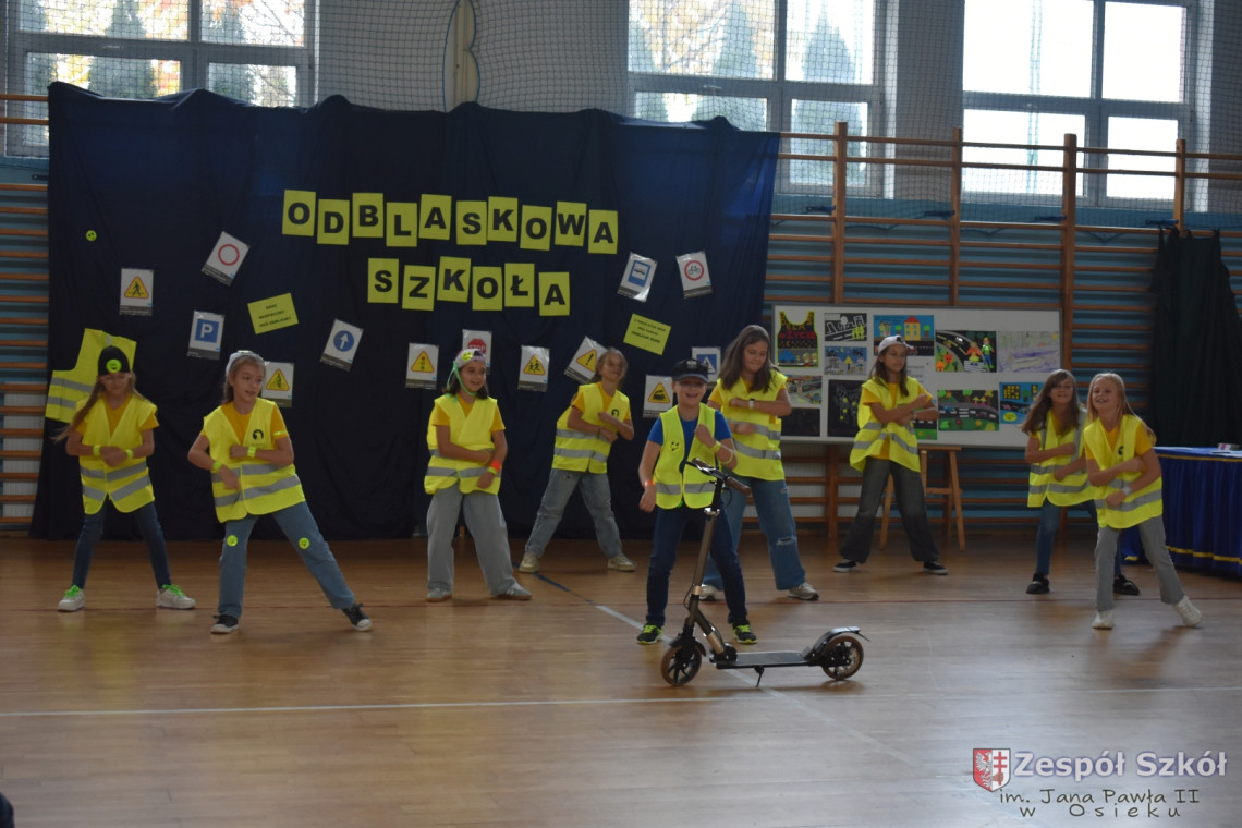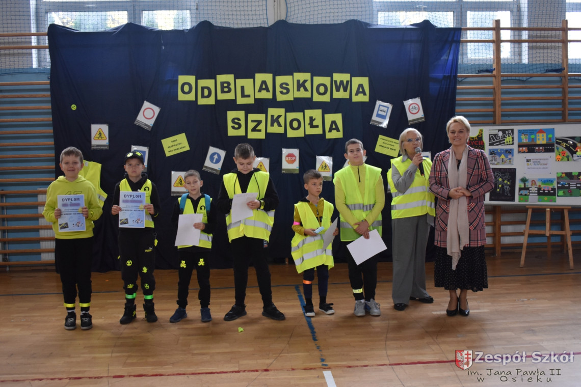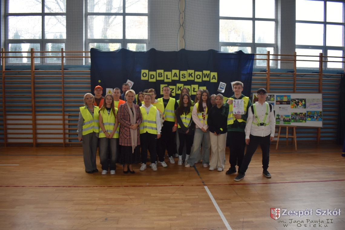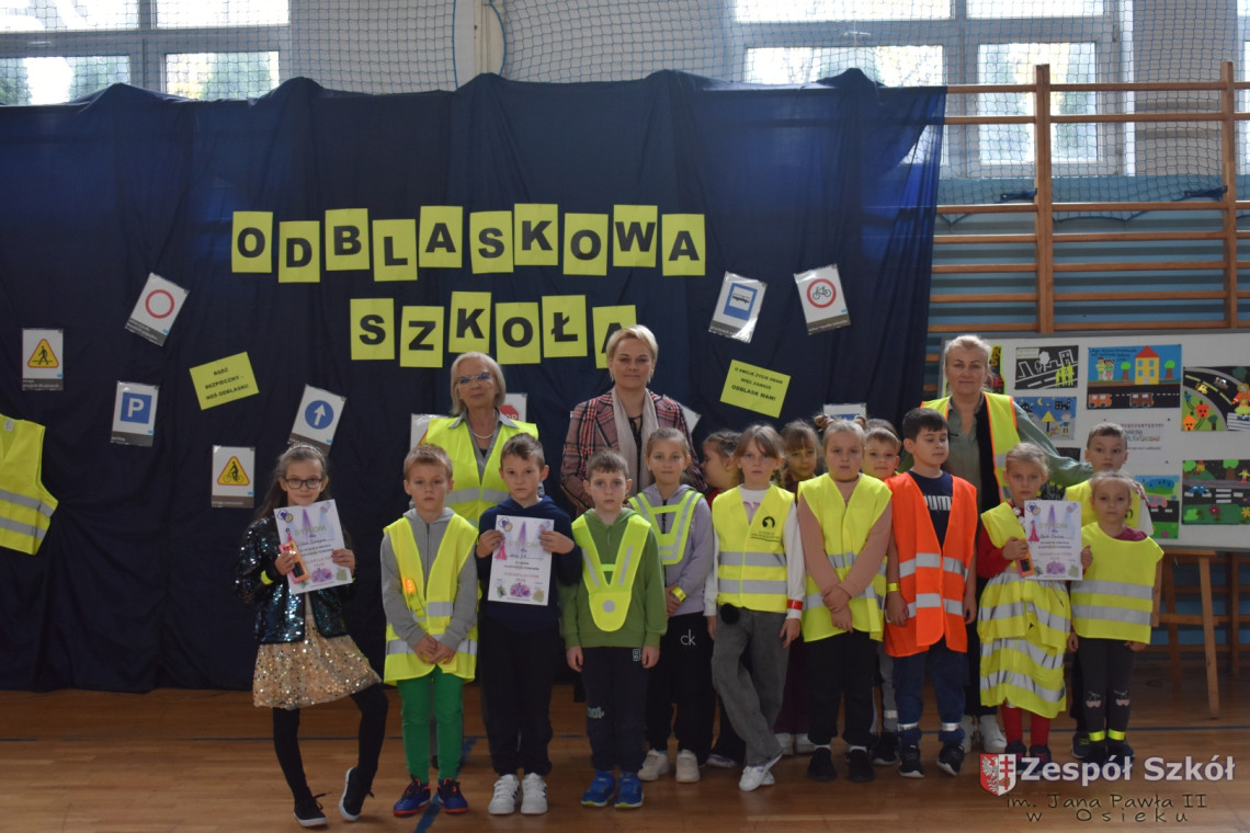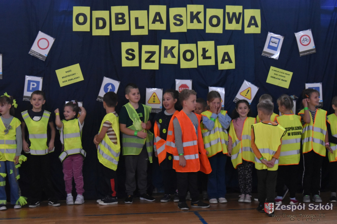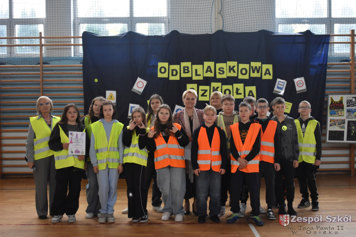 Dnia 29 października 2024r. w Zespole Szkół im. Jana Pawła II w Osieku odbył się apel pod hasłem: „Bądź bezpieczny – noś odblaski”. Uczniowie klas I - VIII spotkali się , aby wspólnie zakończyć i podsumować tegoroczną akcję ODBLASKOWA SZKOŁA. Wraz z początkiem roku szkolnego uczniowie klas młodszych pod opieką wychowawców udali się poza teren szkoły, gdzie mieli możliwość zastosowania w praktyce poznanych zasad bezpiecznego poruszania się po drogach. Dzieci ponadto wykonały: makiety sytuacji drogowych, znaki drogowe oraz plakaty promujące noszenie odblasków i kamizelek odblaskowych.
