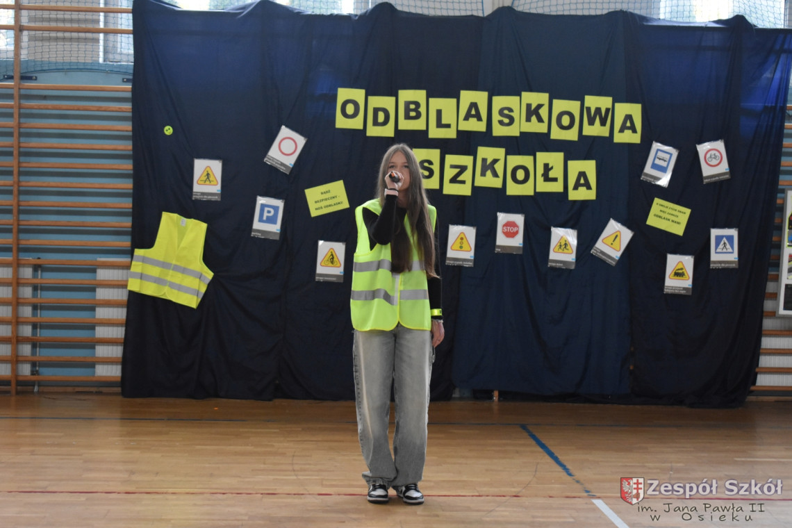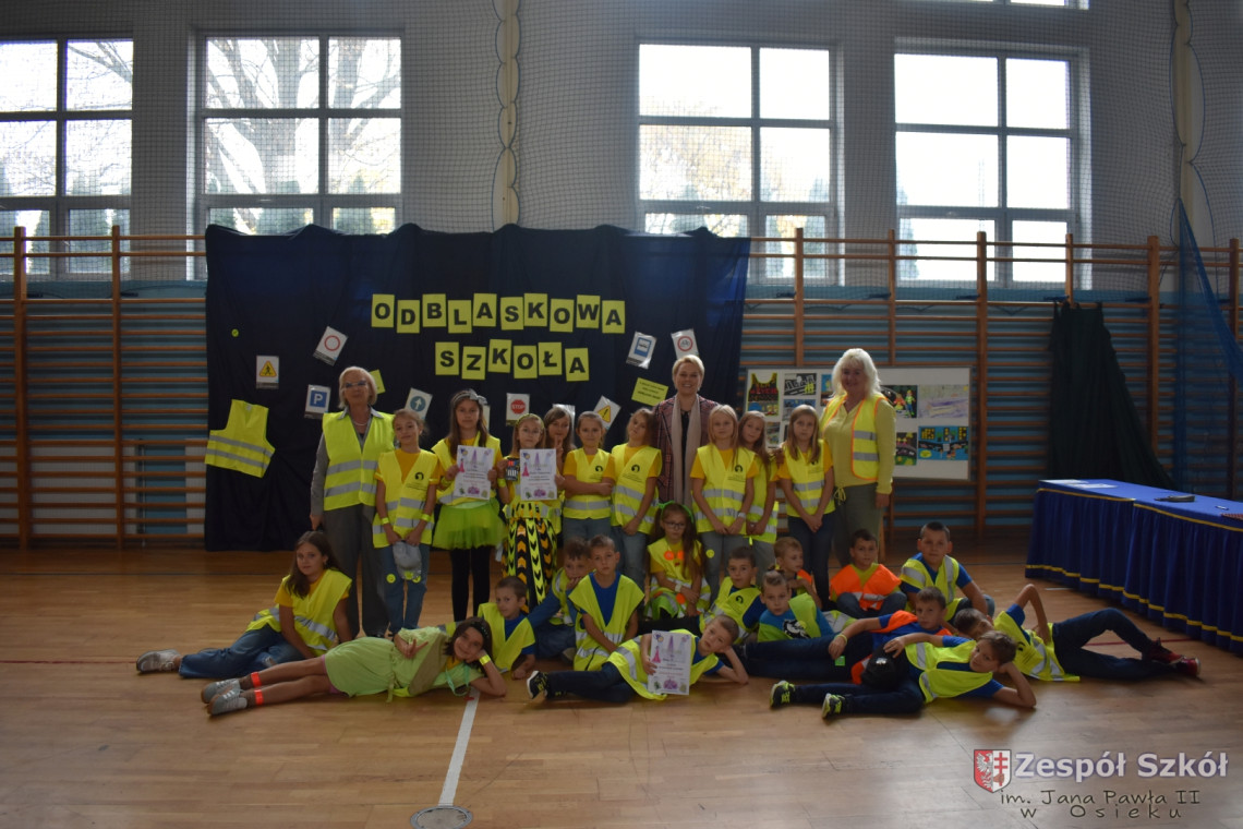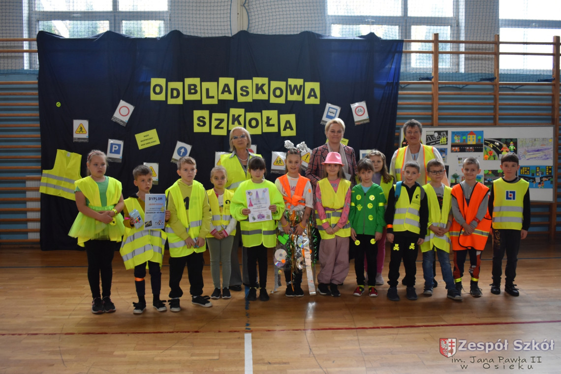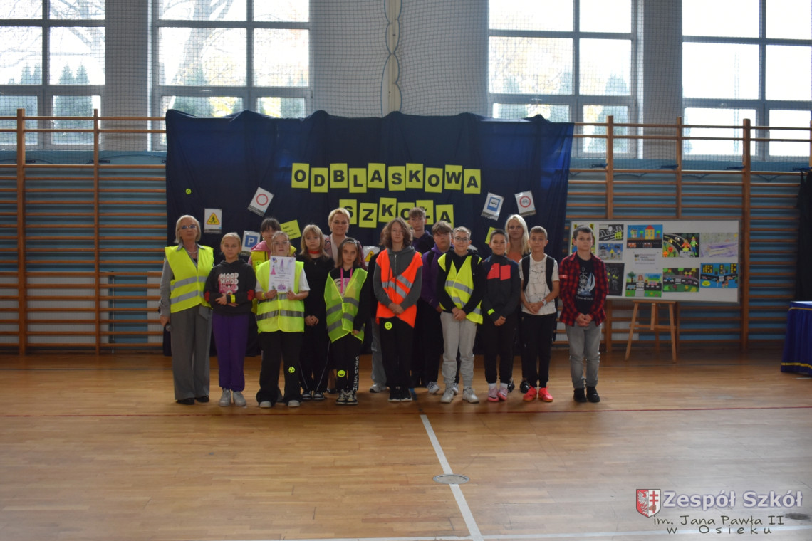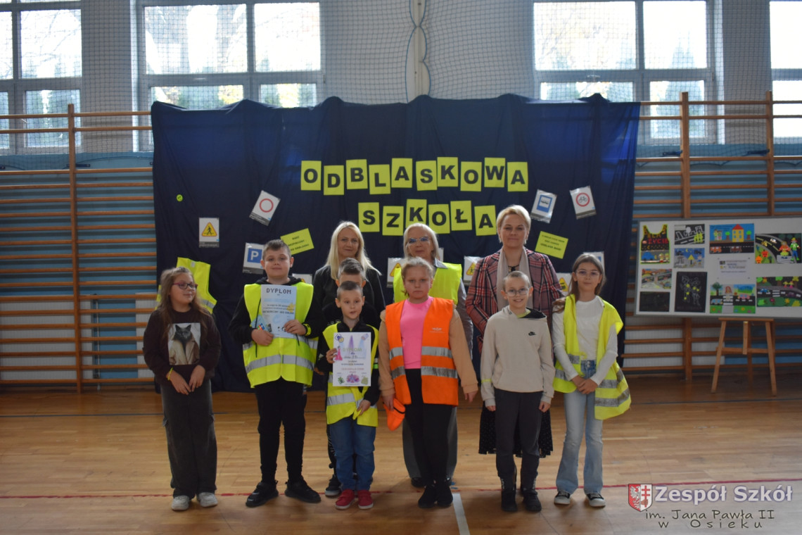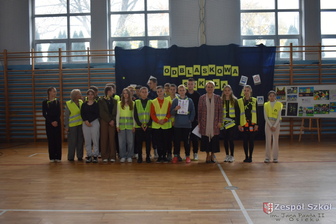 Dnia 29 października 2024r. w Zespole Szkół im. Jana Pawła II w Osieku odbył się apel pod hasłem: „Bądź bezpieczny – noś odblaski”. Uczniowie klas I - VIII spotkali się , aby wspólnie zakończyć i podsumować tegoroczną akcję ODBLASKOWA SZKOŁA. Wraz z początkiem roku szkolnego uczniowie klas młodszych pod opieką wychowawców udali się poza teren szkoły, gdzie mieli możliwość zastosowania w praktyce poznanych zasad bezpiecznego poruszania się po drogach. Dzieci ponadto wykonały: makiety sytuacji drogowych, znaki drogowe oraz plakaty promujące noszenie odblasków i kamizelek odblaskowych.