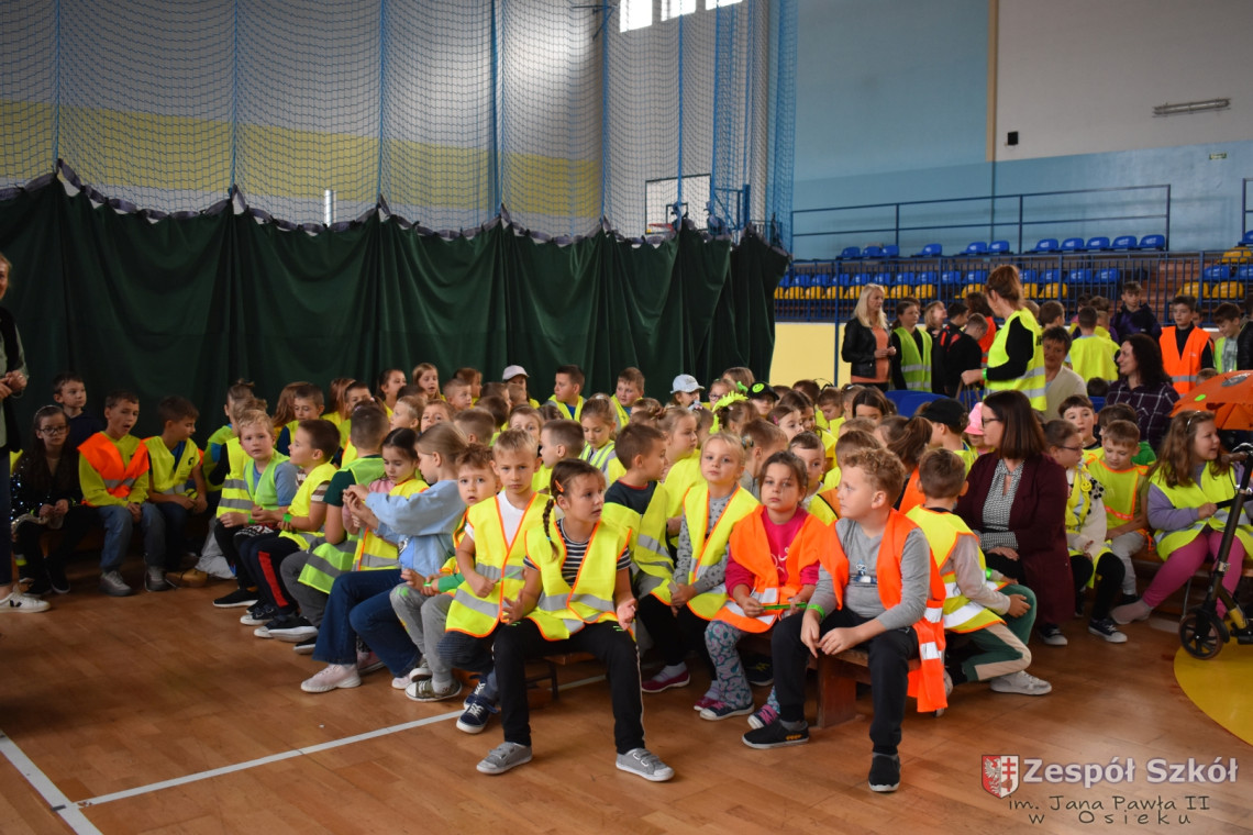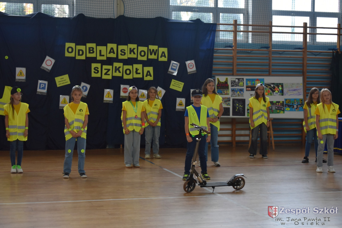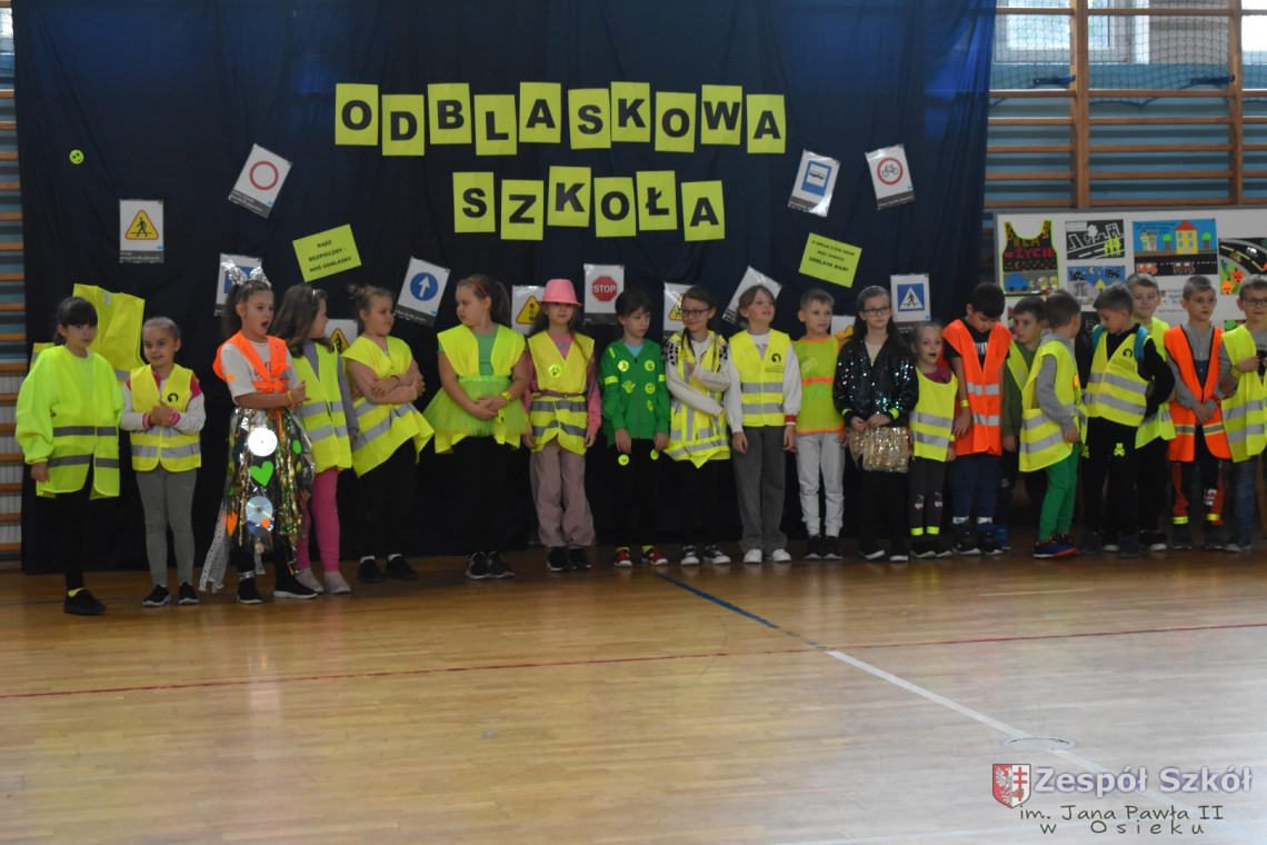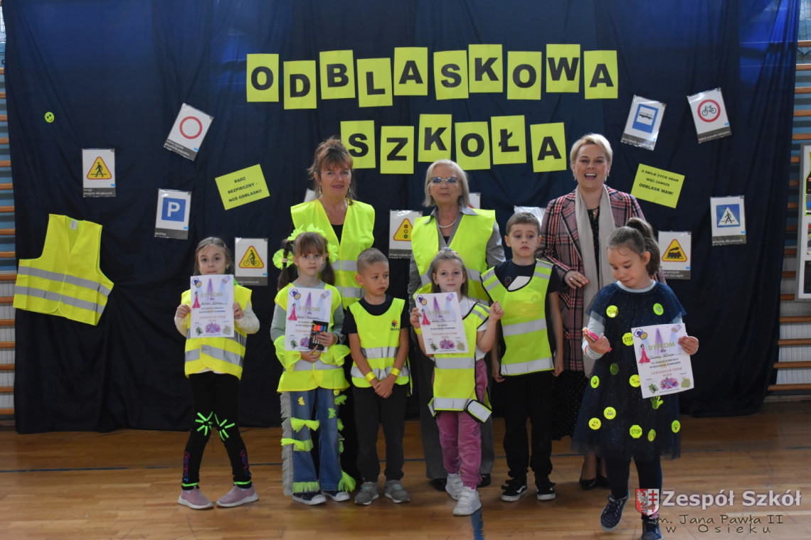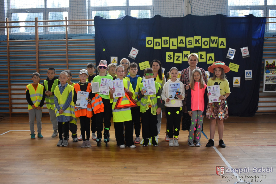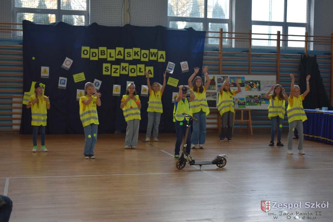 Dnia 29 października 2024r. w Zespole Szkół im. Jana Pawła II w Osieku odbył się apel pod hasłem: „Bądź bezpieczny – noś odblaski”. Uczniowie klas I - VIII spotkali się , aby wspólnie zakończyć i podsumować tegoroczną akcję ODBLASKOWA SZKOŁA. Wraz z początkiem roku szkolnego uczniowie klas młodszych pod opieką wychowawców udali się poza teren szkoły, gdzie mieli możliwość zastosowania w praktyce poznanych zasad bezpiecznego poruszania się po drogach. Dzieci ponadto wykonały: makiety sytuacji drogowych, znaki drogowe oraz plakaty promujące noszenie odblasków i kamizelek odblaskowych.