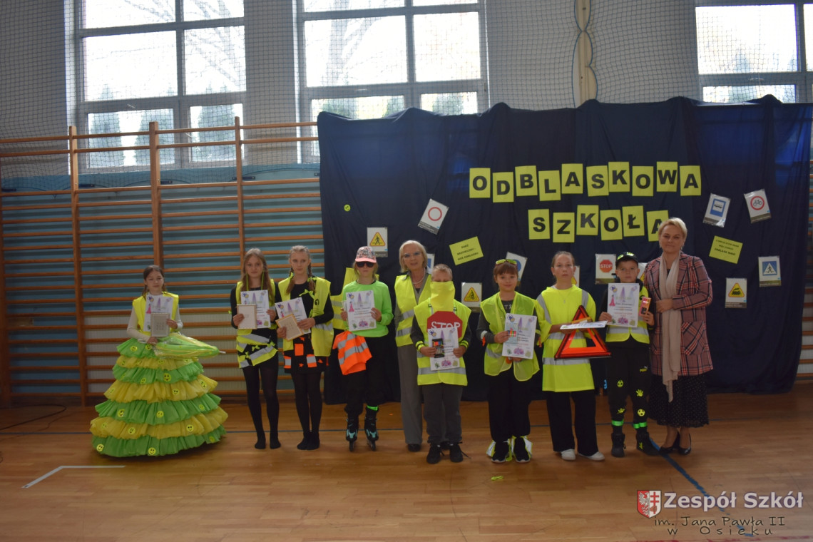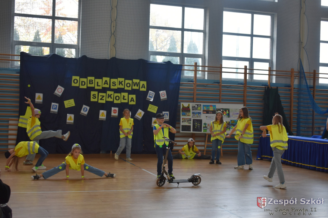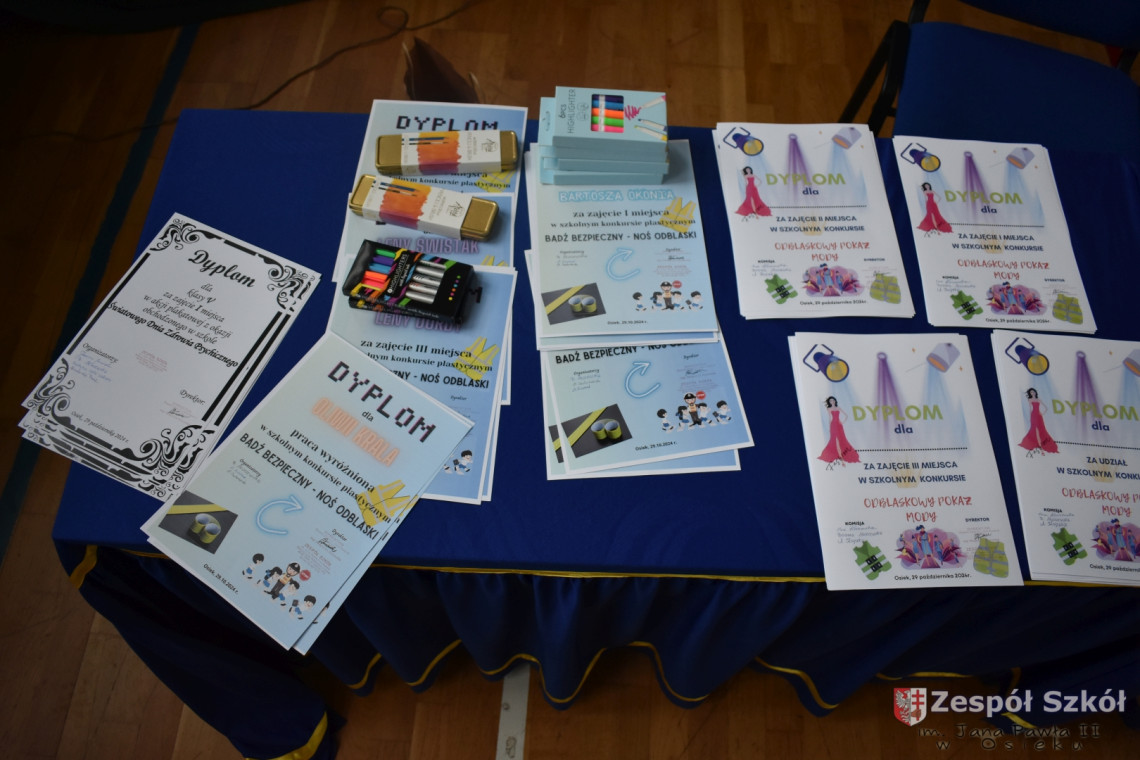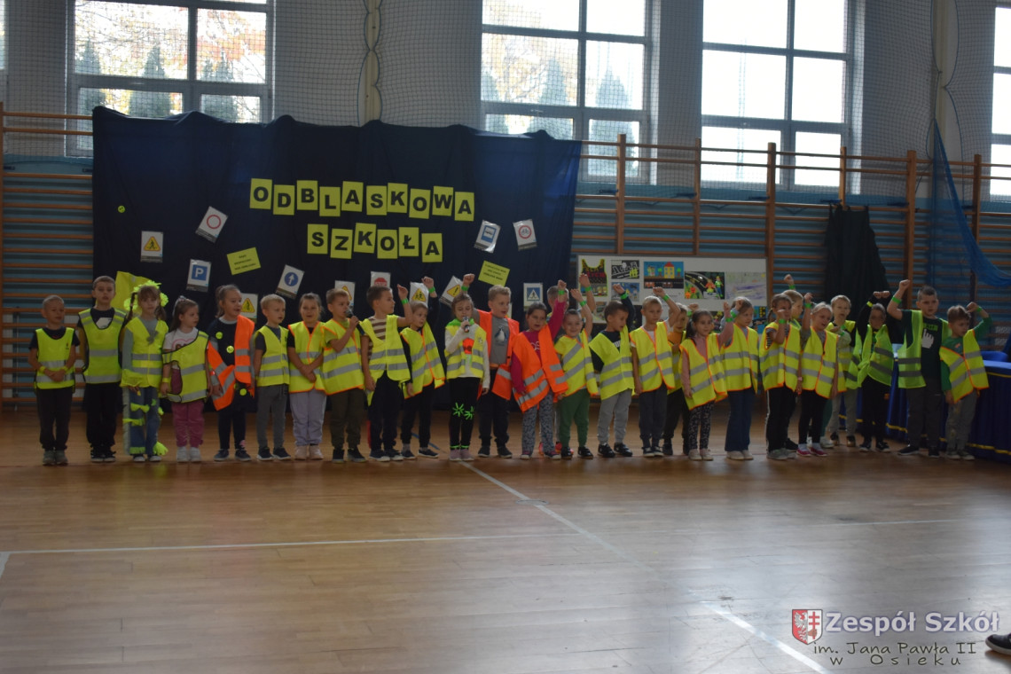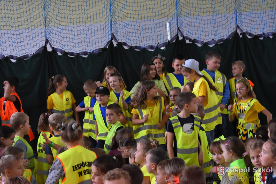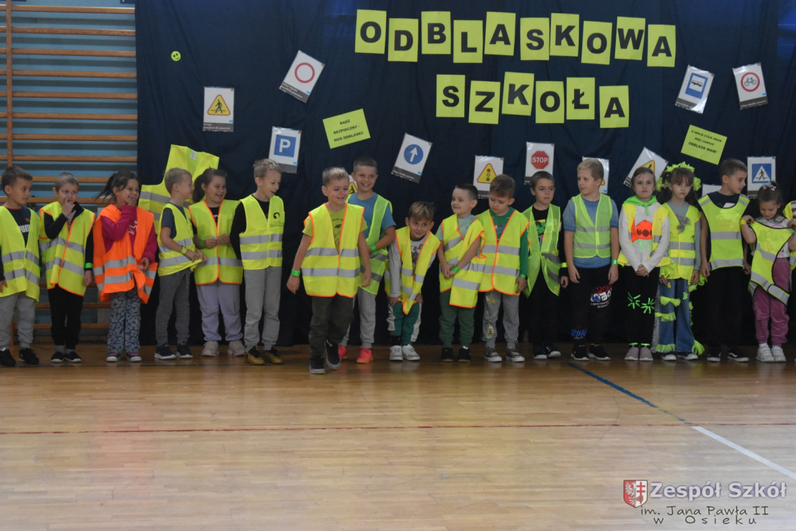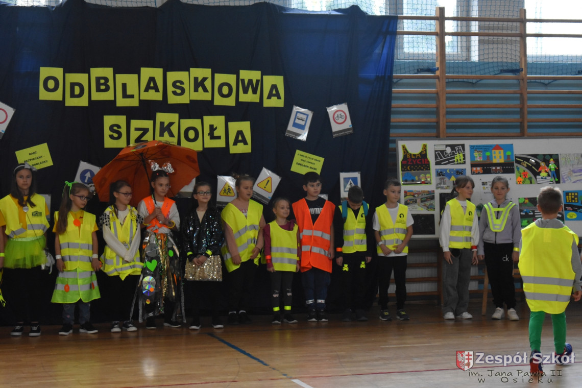 Dnia 29 października 2024r. w Zespole Szkół im. Jana Pawła II w Osieku odbył się apel pod hasłem: „Bądź bezpieczny – noś odblaski”. Uczniowie klas I - VIII spotkali się , aby wspólnie zakończyć i podsumować tegoroczną akcję ODBLASKOWA SZKOŁA. Wraz z początkiem roku szkolnego uczniowie klas młodszych pod opieką wychowawców udali się poza teren szkoły, gdzie mieli możliwość zastosowania w praktyce poznanych zasad bezpiecznego poruszania się po drogach. Dzieci ponadto wykonały: makiety sytuacji drogowych, znaki drogowe oraz plakaty promujące noszenie odblasków i kamizelek odblaskowych.