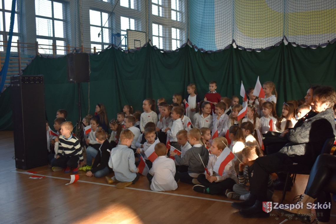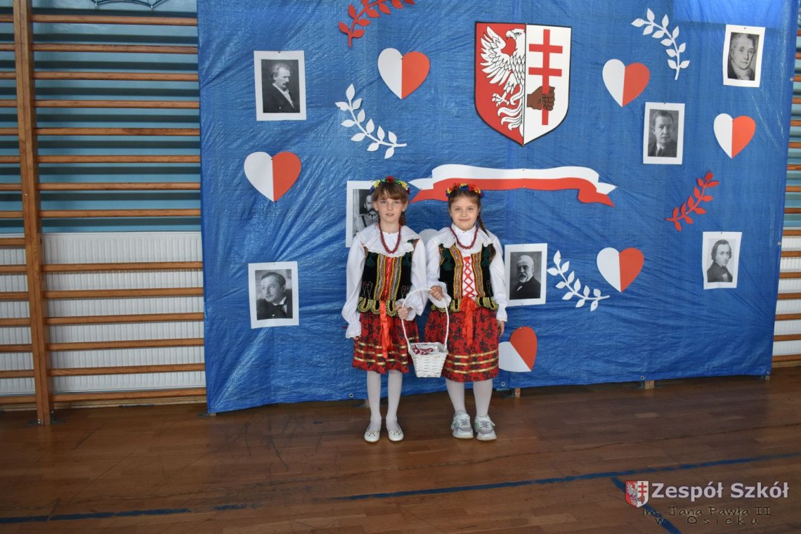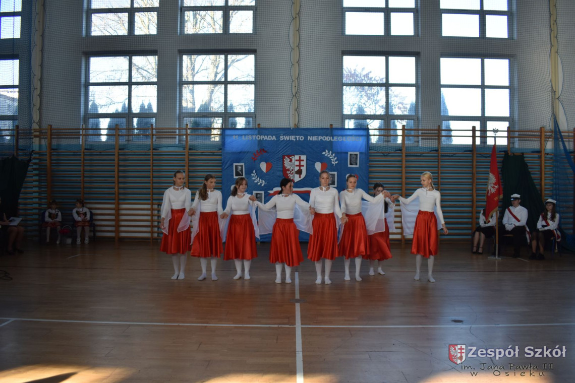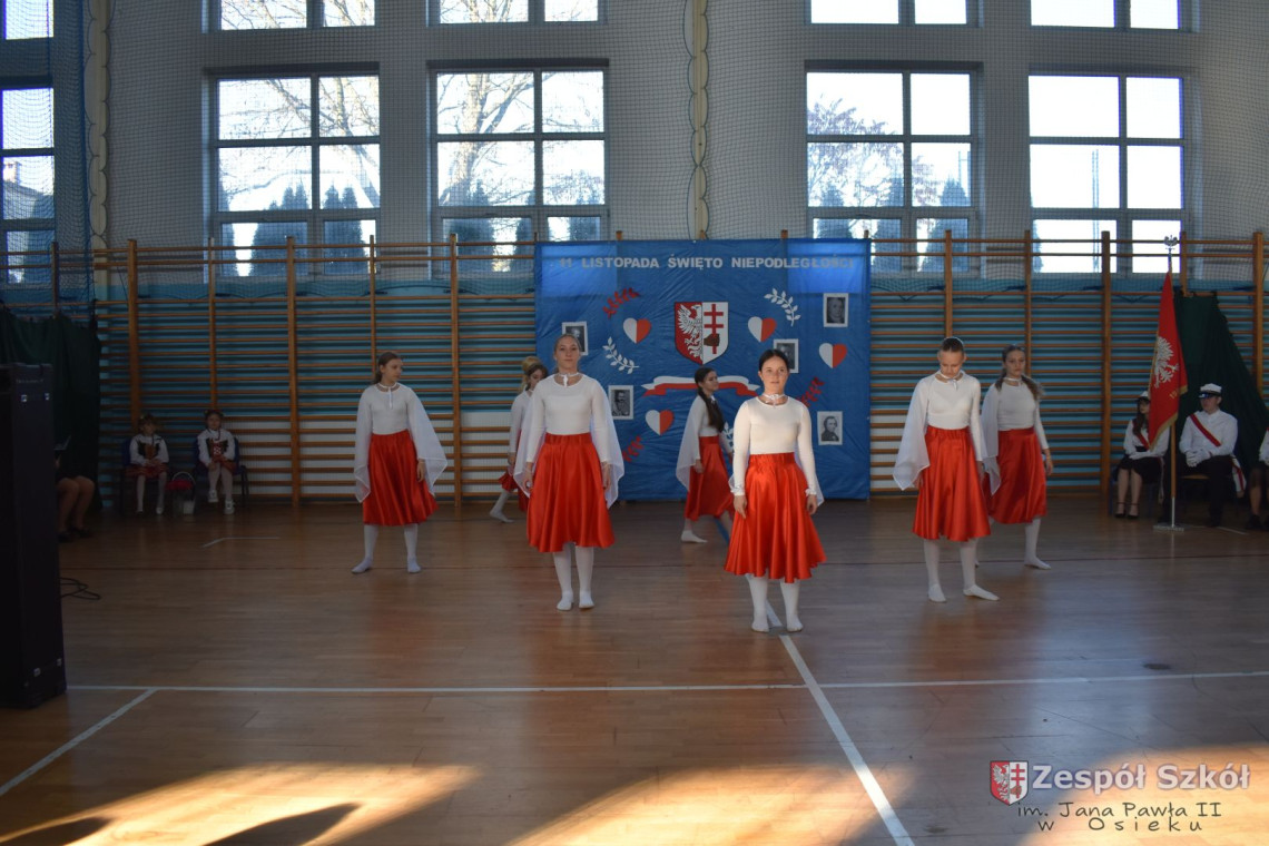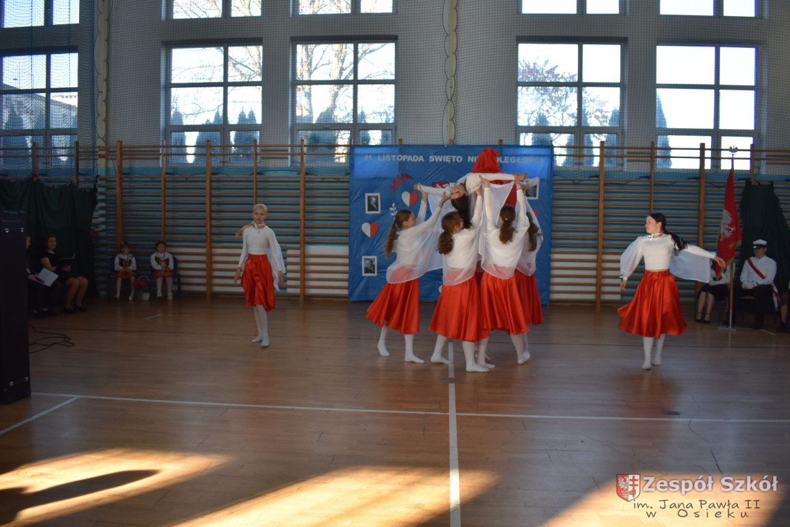 Dopełnieniem padających ze sceny słów były wykonane przez młodych wokalistów pieśni patriotyczne, wśród których szczególnego znaczenia nabrały: „Pierwsza Brygada”, „Pierwsza kadrowa”, liryczna „Matko o twarzy jak polska ziemia”, czy znany wszystkim utwór „Rozkwitały pąki białych róż”. Układ choreograficzny przygotowany przez uczennice klasy VII uzupełnił uroczystość i dodał jej podniosłego charakteru, a scenografia podkreśliła chwile przełomowe dla ojczyzny.