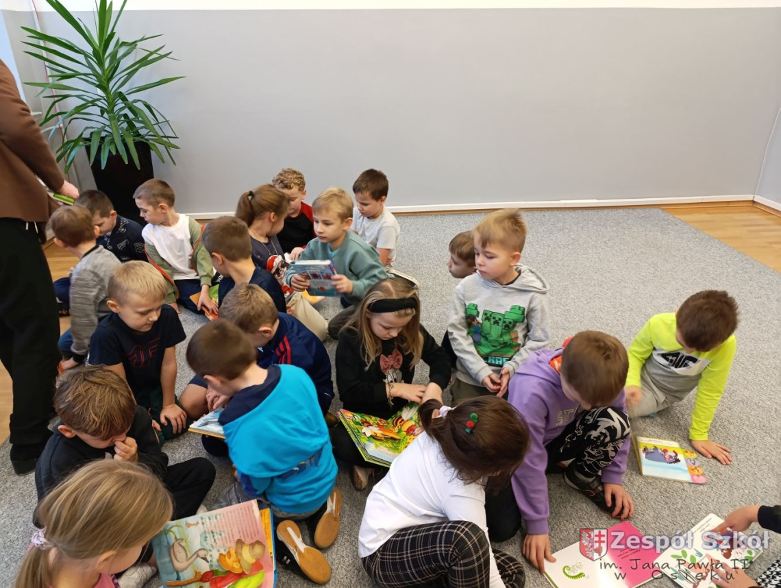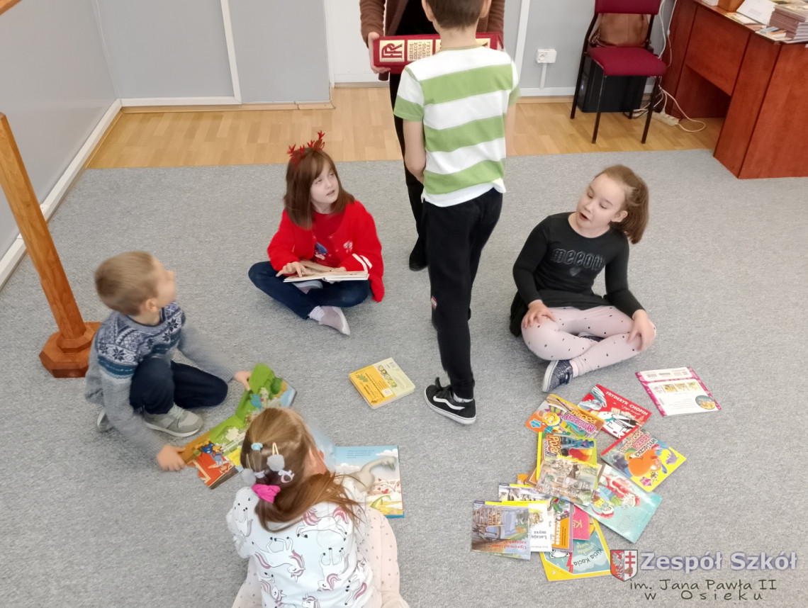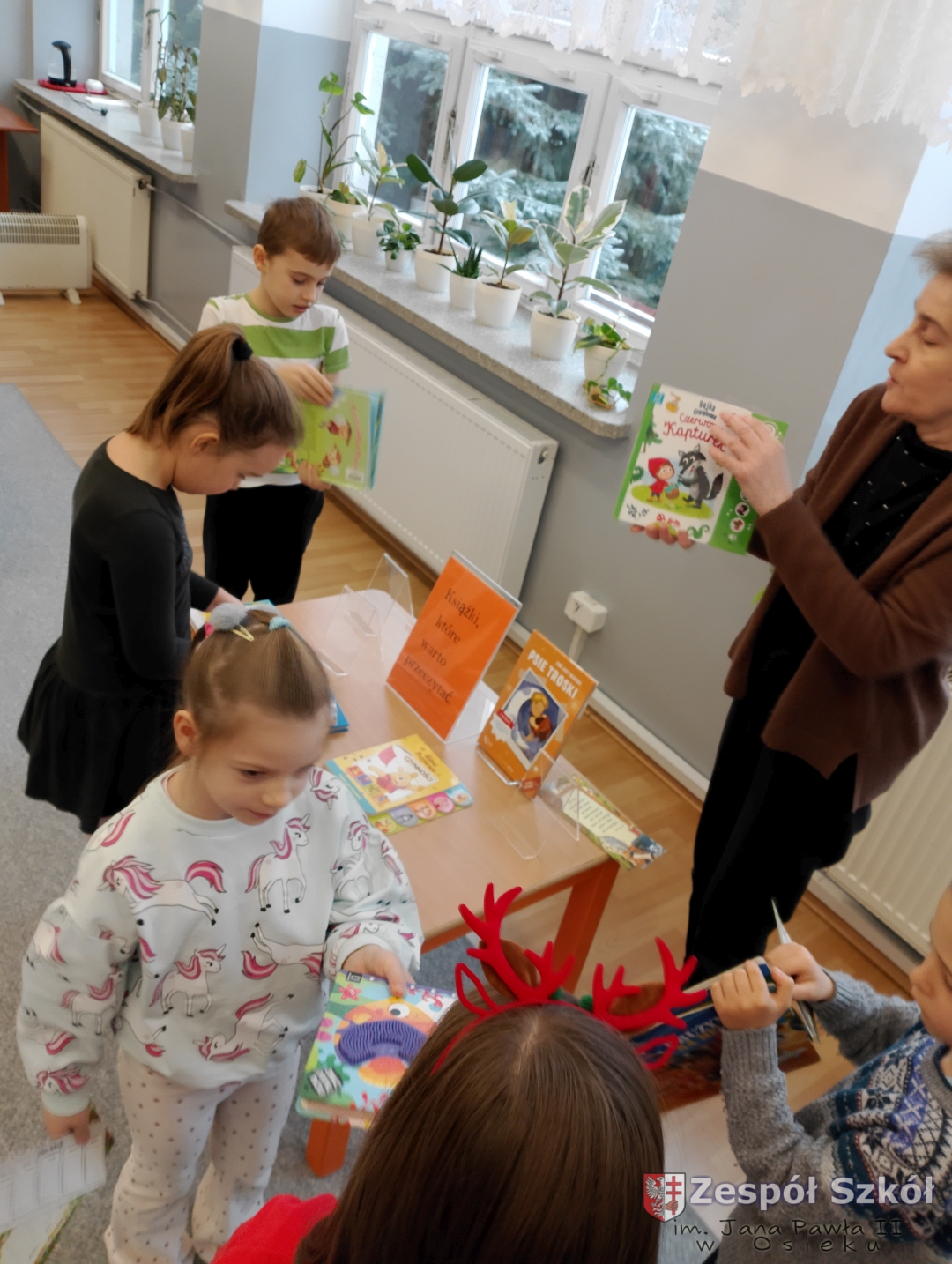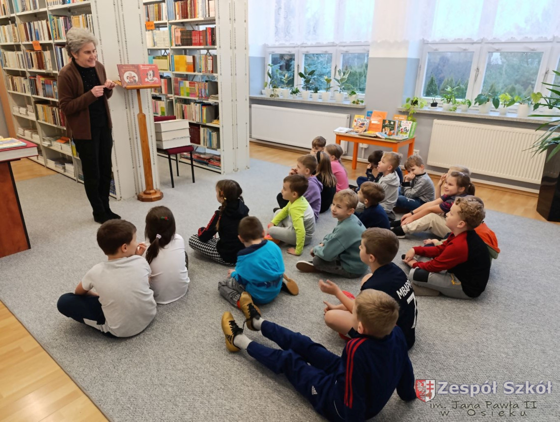 W dniach 10 i 11 grudnia 2024 r. uczniowie klas pierwszych uczestniczyli w zajęciach bibliotecznych, gdzie mogli poznać zasady obowiązujące w szkolnej bibliotece. Dzieci dowiedziały się jak samodzielnie wypożyczać i oddawać książki oraz jak o nie dbać. Każdy pierwszoklasista otrzymał wyprawkę czytelnika zawierającą książkę „Wnuczka antykwariusza” autorstwa Emilii Dziubak i zakładki do książki, a dla rodziców broszurę informacyjną „Kochasz czytaj razem z dzieckiem”.