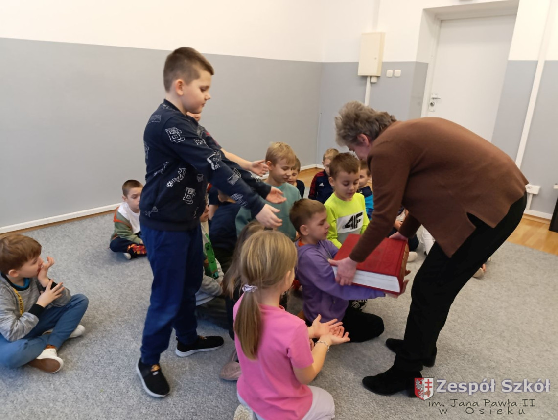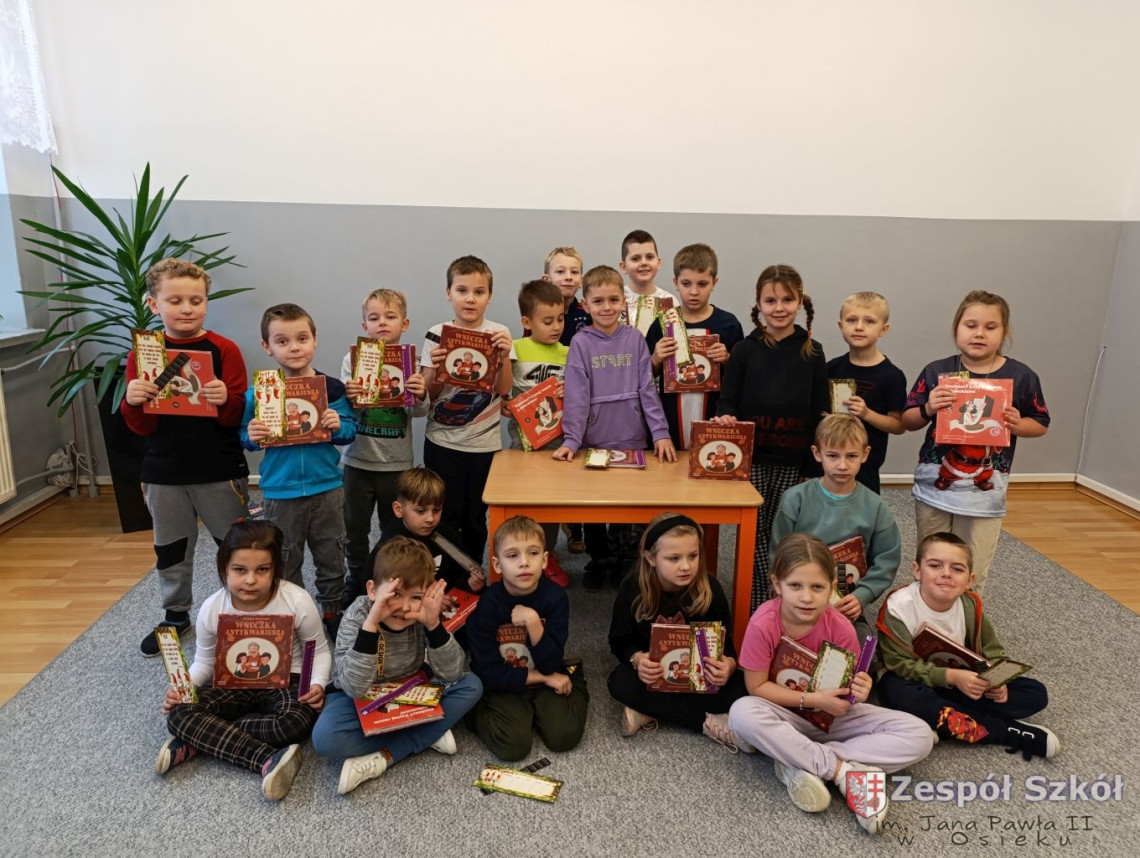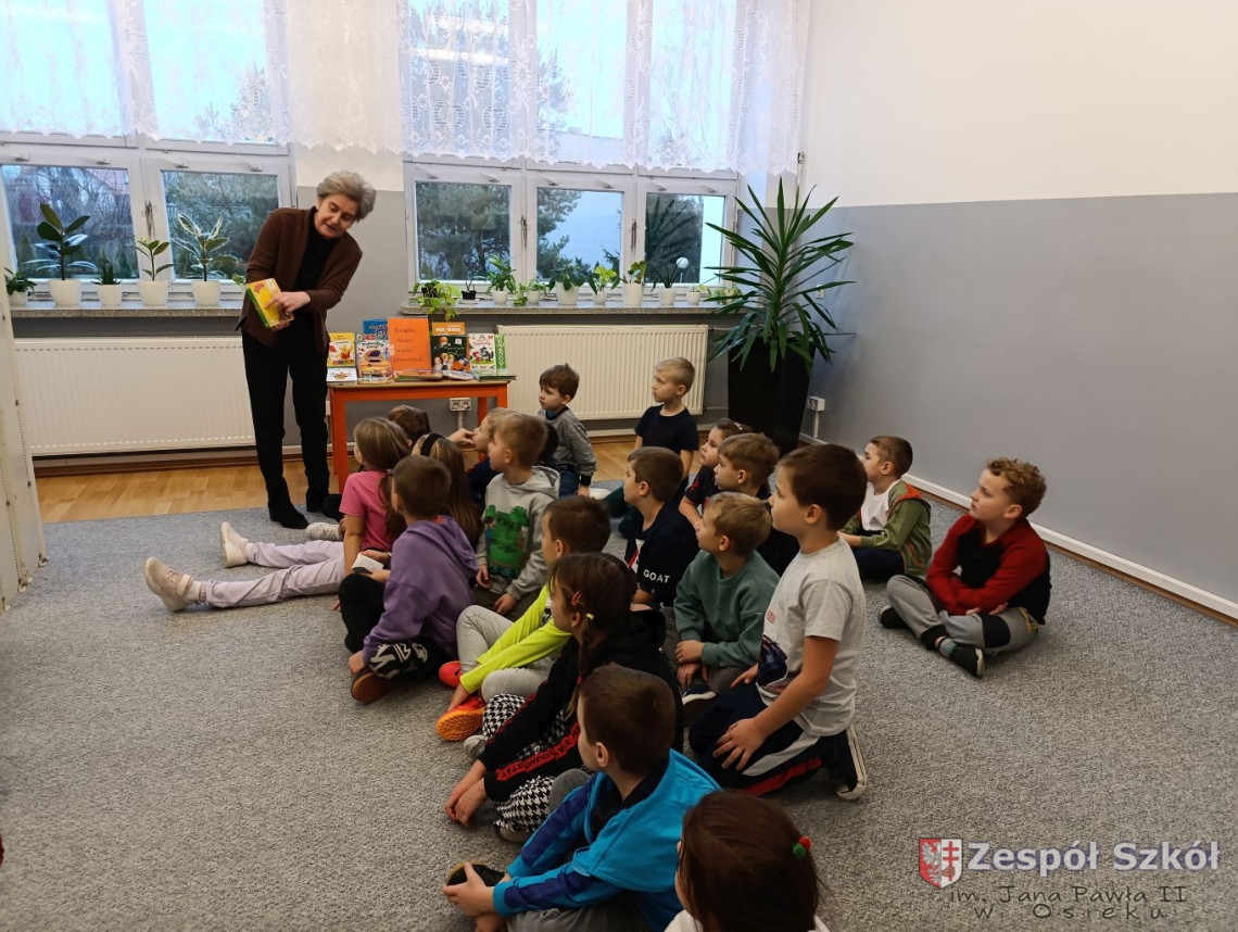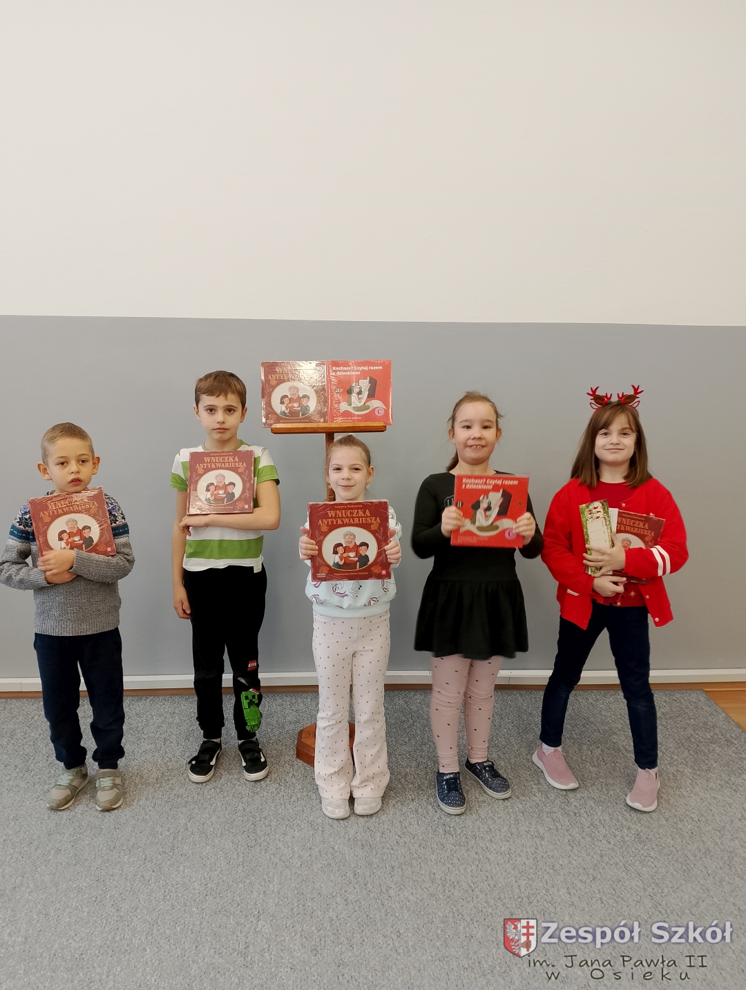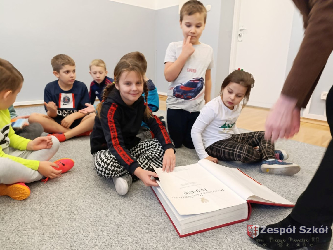 W dniach 10 i 11 grudnia 2024 r. uczniowie klas pierwszych uczestniczyli w zajęciach bibliotecznych, gdzie mogli poznać zasady obowiązujące w szkolnej bibliotece. Dzieci dowiedziały się jak samodzielnie wypożyczać i oddawać książki oraz jak o nie dbać. Każdy pierwszoklasista otrzymał wyprawkę czytelnika zawierającą książkę „Wnuczka antykwariusza” autorstwa Emilii Dziubak i zakładki do książki, a dla rodziców broszurę informacyjną „Kochasz czytaj razem z dzieckiem”.
