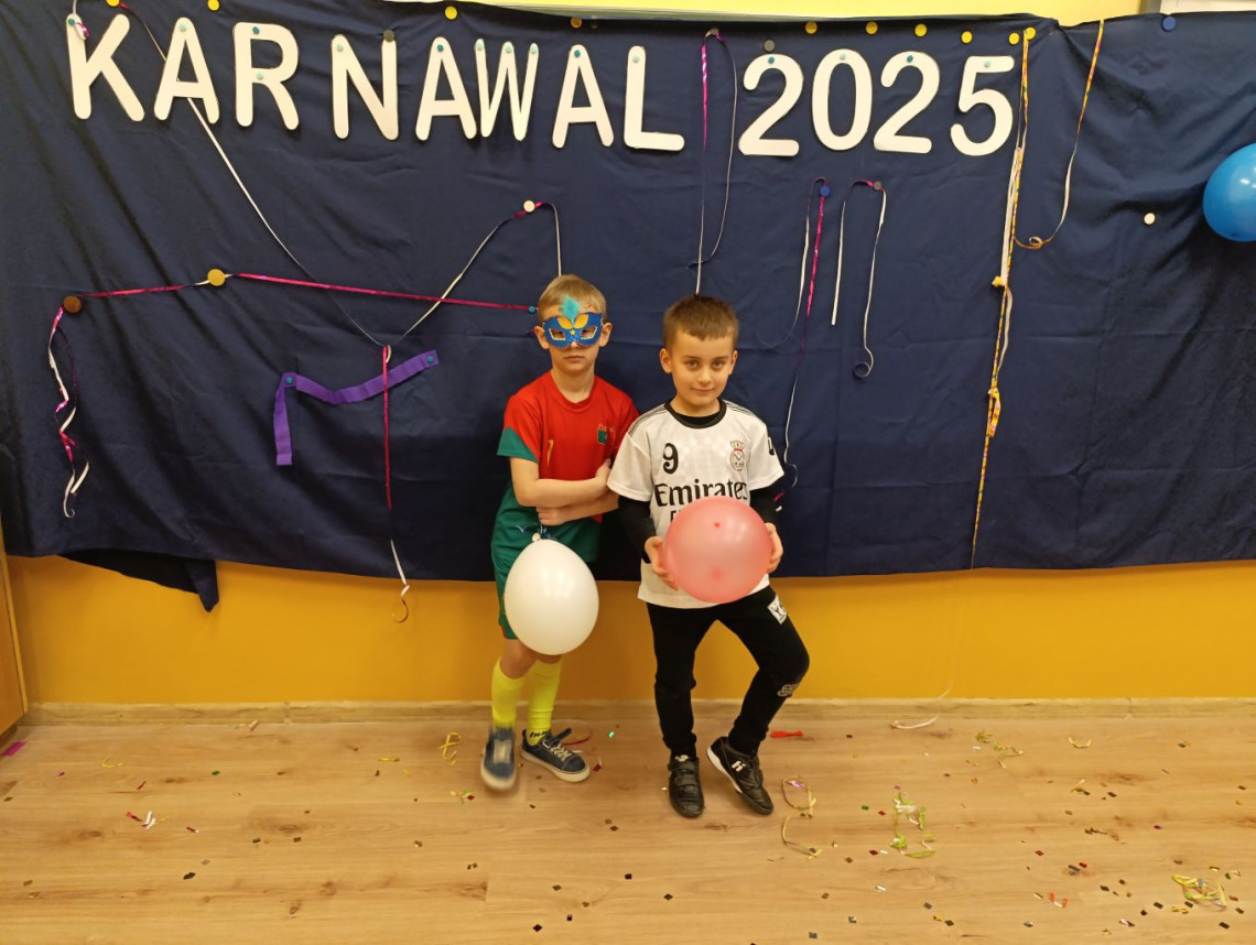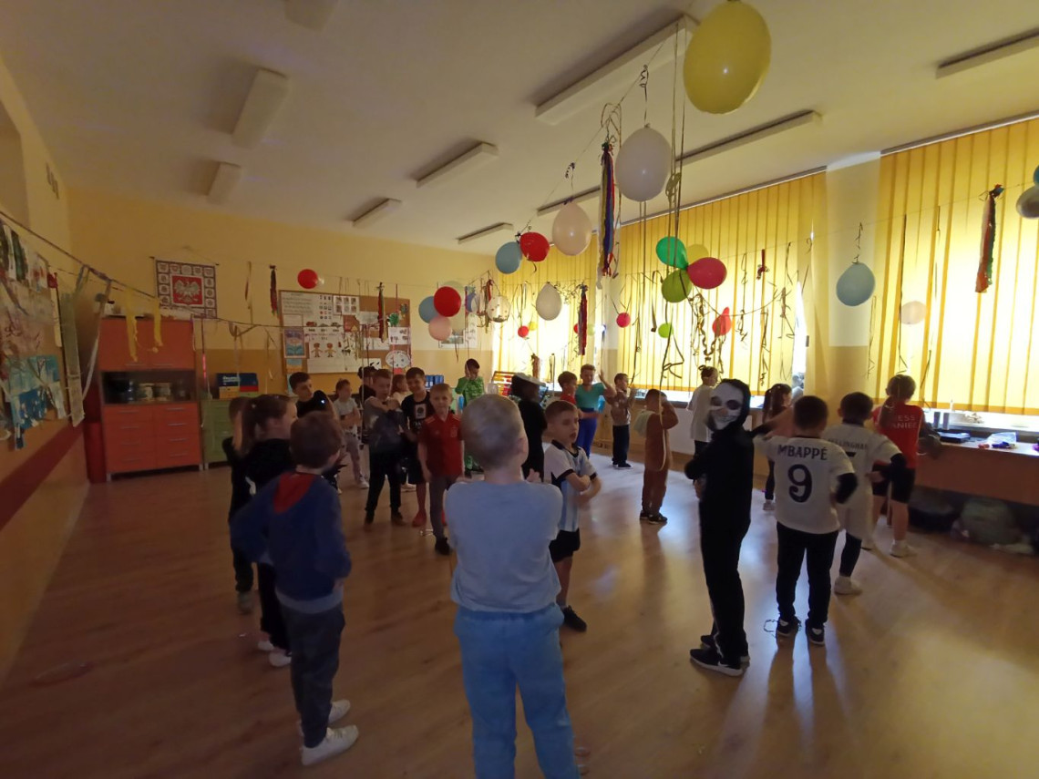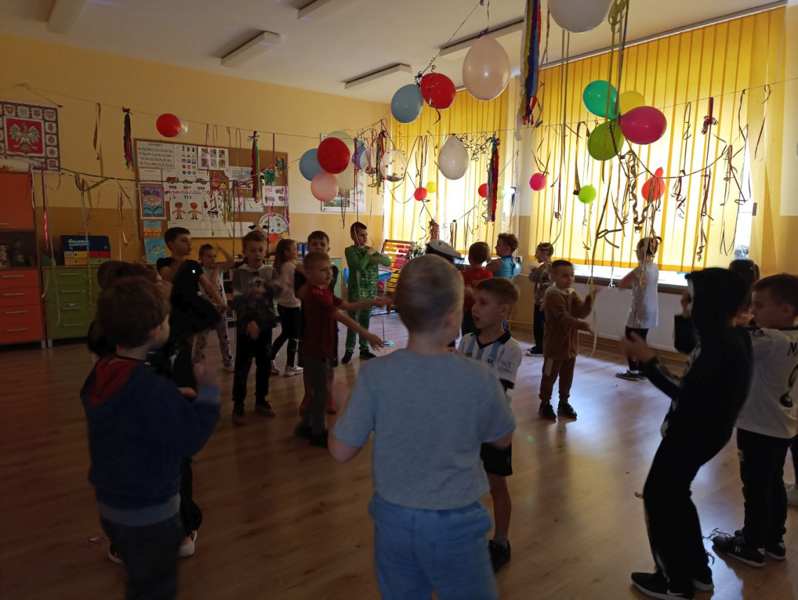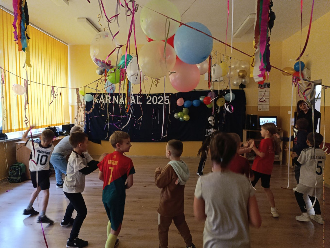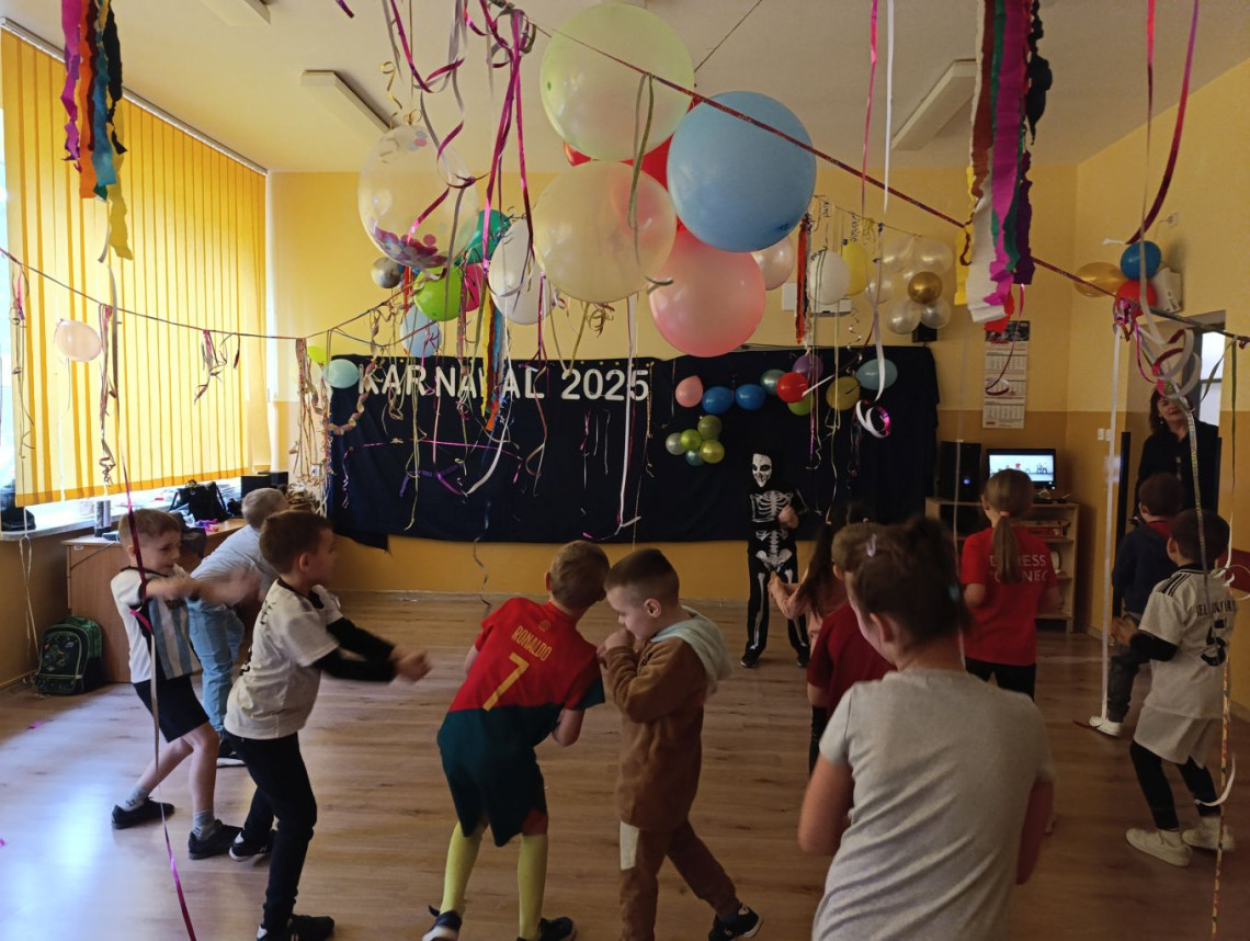 28 lutego 2025r. w naszej szkole odbył się bal karnawałowy w klasach pierwszych. Ten dzień był długo wyczekiwany przez uczniów, a sala lekcyjna w tym wyjątkowym dniu zamieniła się w piękną salę balową. Nauczyciele, uczniowie i rodzice wcześniej przyozdobili salę serpentynami, łańcuchami i balonami, co sprawiło że nabrała zjawiskowego wyglądu i wprowadziła wszystkich w wesoły nastrój. Uczniowie przebrani w piękne i kolorowe stroje bawili się wyśmienicie przy dźwiękach muzyki. W czasie przerwy dzieci miały czas na słodki poczęstunek przygotowany przez rodziców. Była to również wspaniała okazja do integracji uczniów klas pierwszych i zrobienia pamiątkowych zdjęć. Zabawa była super i na pewno długo pozostanie w naszej pamięci.