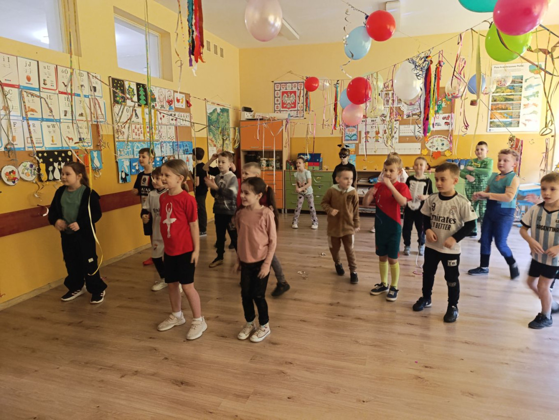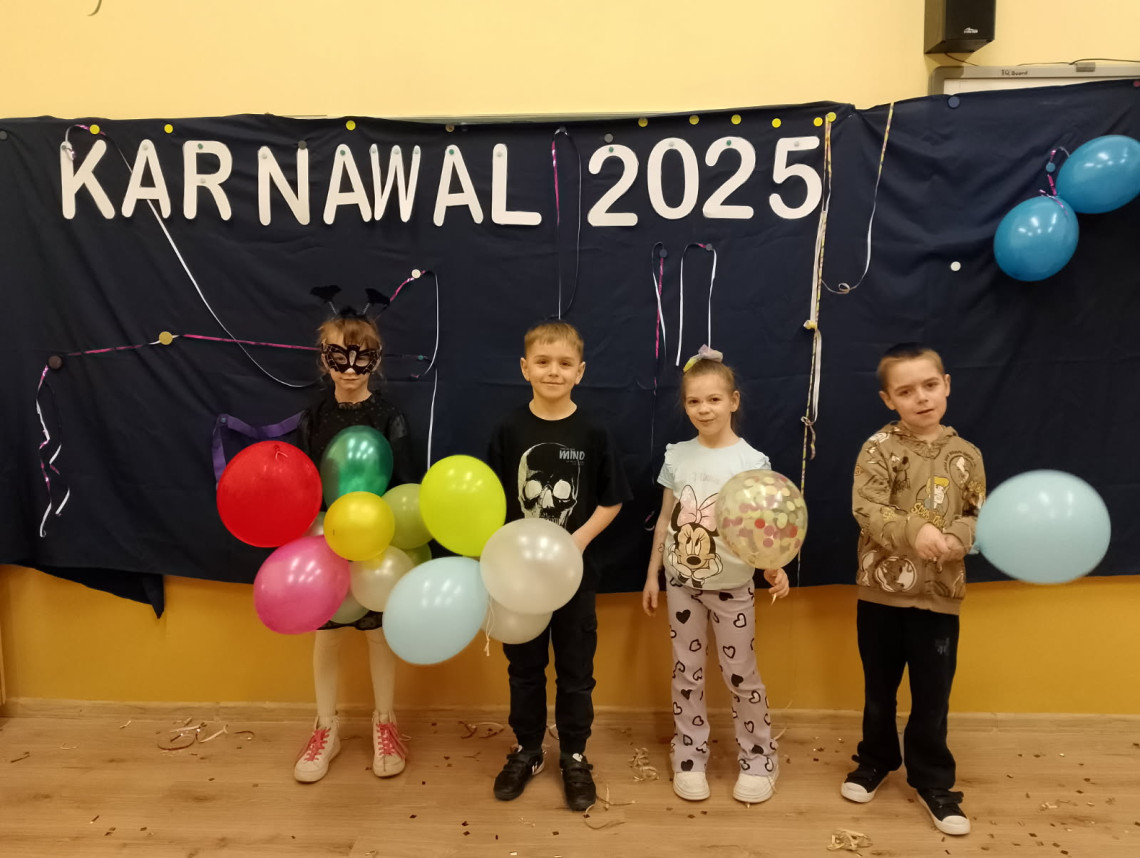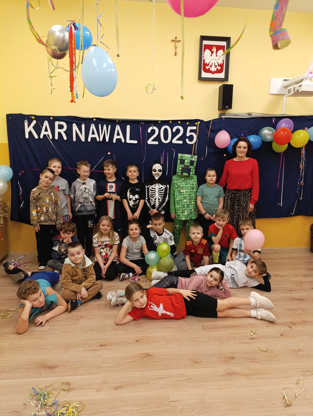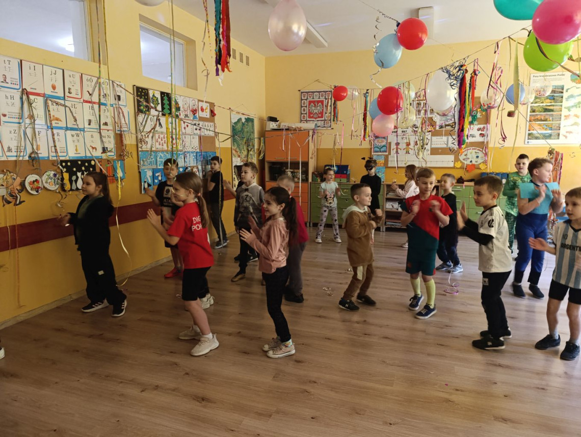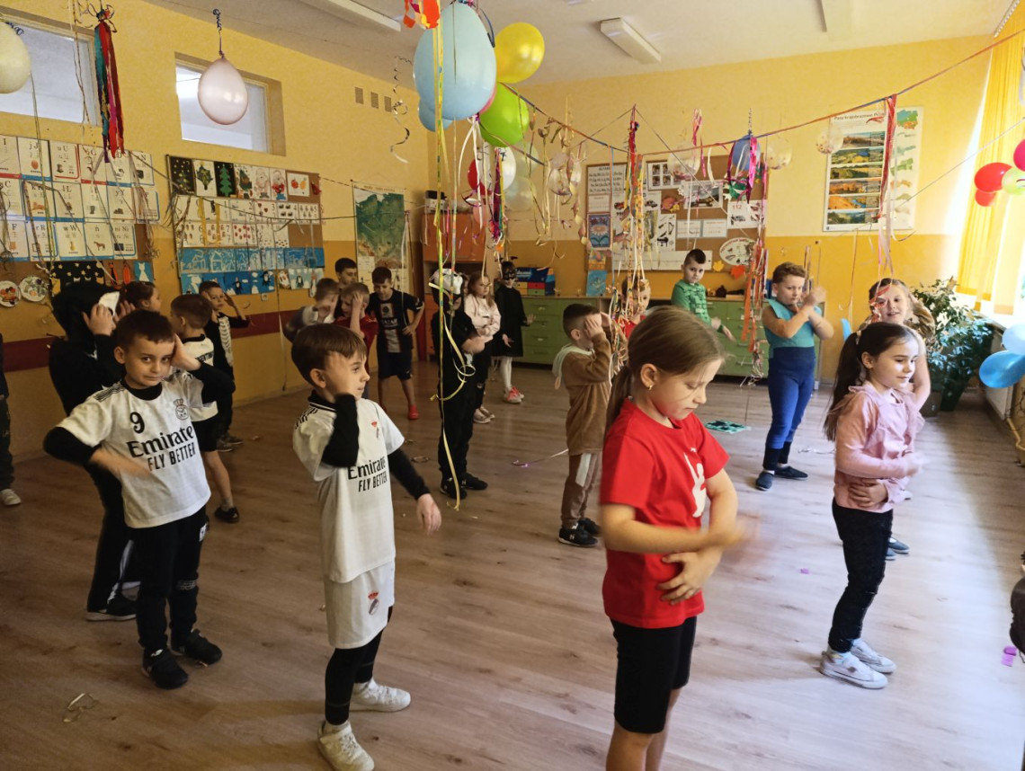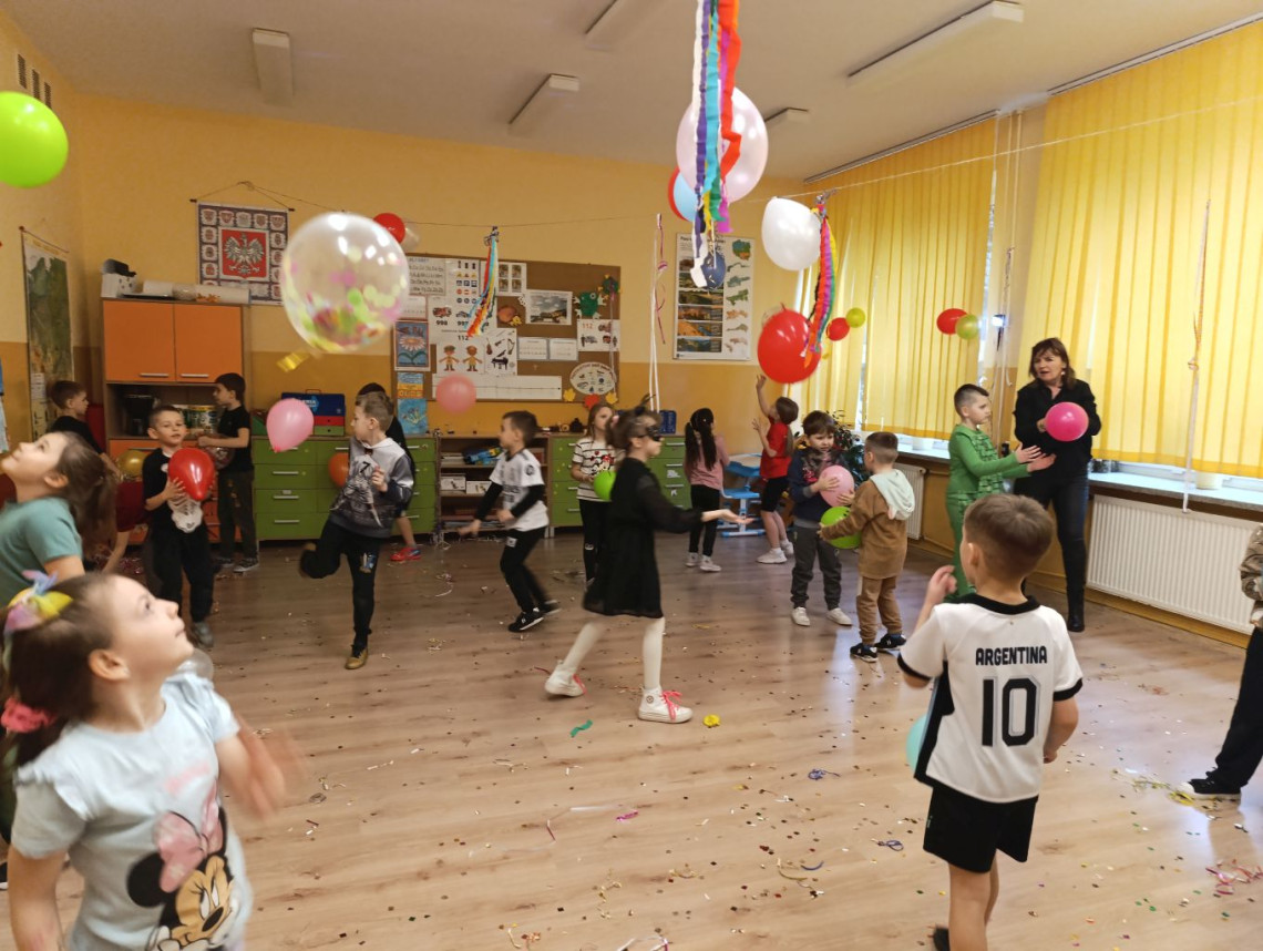 28 lutego 2025r. w naszej szkole odbył się bal karnawałowy w klasach pierwszych. Ten dzień był długo wyczekiwany przez uczniów, a sala lekcyjna w tym wyjątkowym dniu zamieniła się w piękną salę balową. Nauczyciele, uczniowie i rodzice wcześniej przyozdobili salę serpentynami, łańcuchami i balonami, co sprawiło że nabrała zjawiskowego wyglądu i wprowadziła wszystkich w wesoły nastrój. Uczniowie przebrani w piękne i kolorowe stroje bawili się wyśmienicie przy dźwiękach muzyki. W czasie przerwy dzieci miały czas na słodki poczęstunek przygotowany przez rodziców. Była to również wspaniała okazja do integracji uczniów klas pierwszych i zrobienia pamiątkowych zdjęć. Zabawa była super i na pewno długo pozostanie w naszej pamięci.