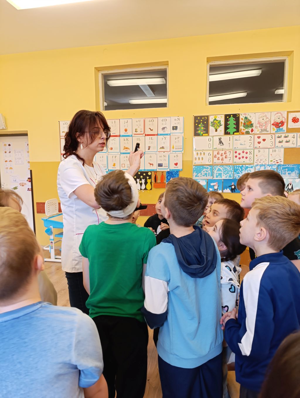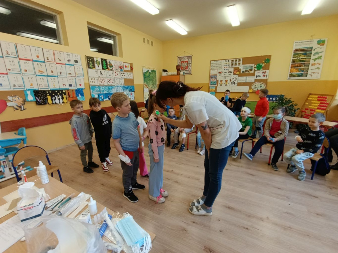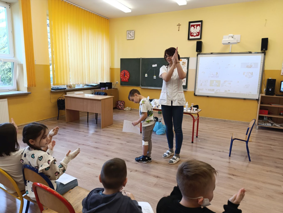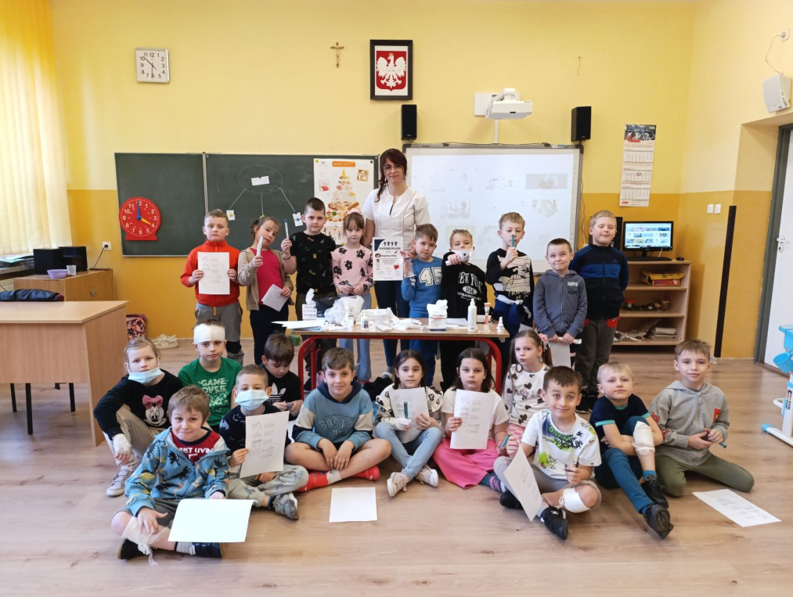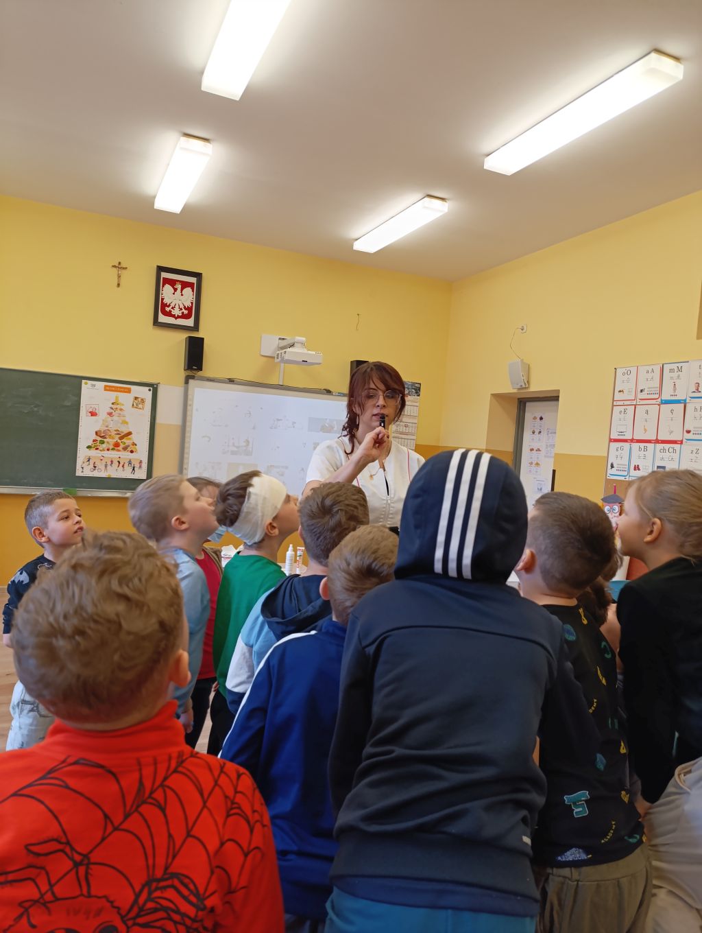W dniu 10 marca 2025 r. uczniowie z klas pierwszych w ramach realizacji innowacji uczestniczyli w spotkaniu z pielęgniarką panią Magdaleną Mikus. Celem spotkania było przybliżenie dzieciom zawodu pielęgniarki jak również uświadomienie konieczności dbania o swoje zdrowie. Pielęgniarka opowiadając o swojej pracy demonstrowała dzieciom różne akcesoria medyczne: bandaże, plasterki, termometr, ciśnieniomierz, glukometr itp. Jednak największą frajdą dla dzieci było mierzenie temperatury i ciśnienia przez pielęgniarkę, naklejanie plasterków i wzajemne bandażowanie kolegów i koleżanek. Na zakończenie spotkania wszyscy uczniowie pozowali do pamiątkowego zdjęcia, otrzymali kolorowankę z numerami alarmowymi i naklejkę – DZIELNY PACJENT. Spotkanie to przyniosło wszystkim mnóstwo emocji i pozytywnych wrażeń.