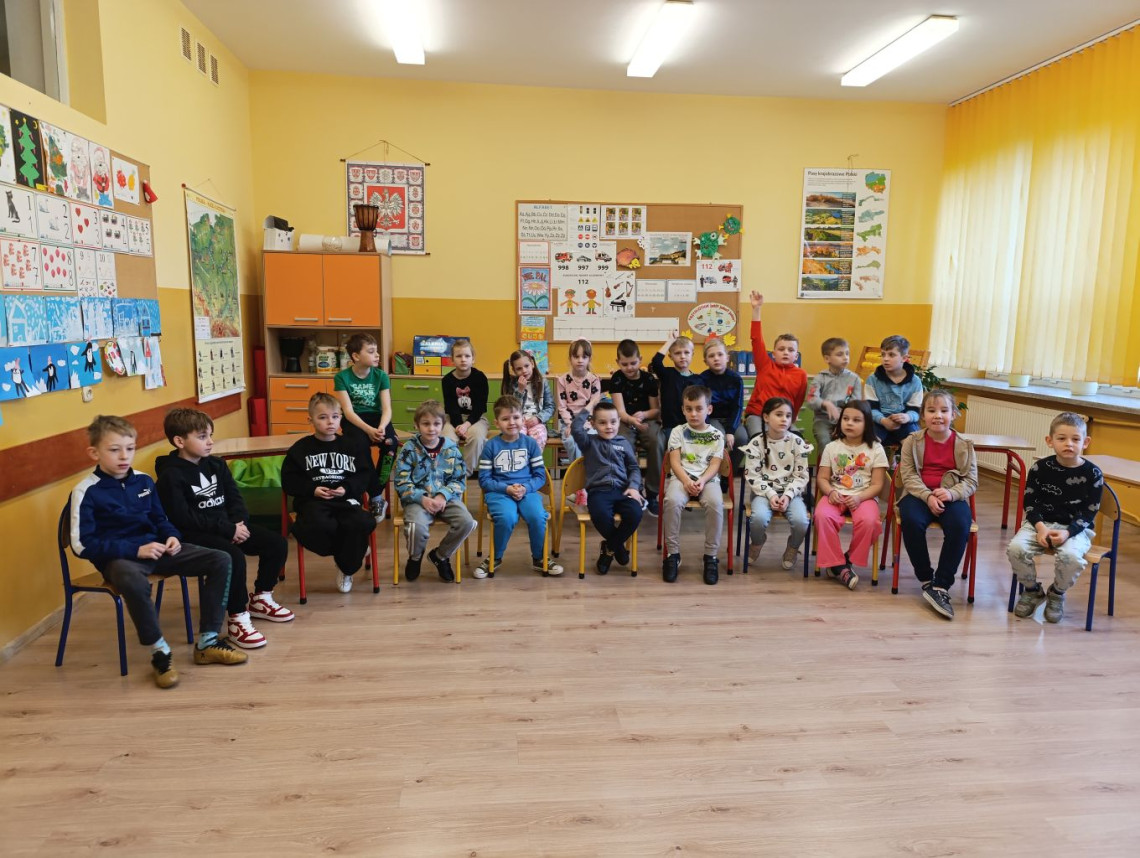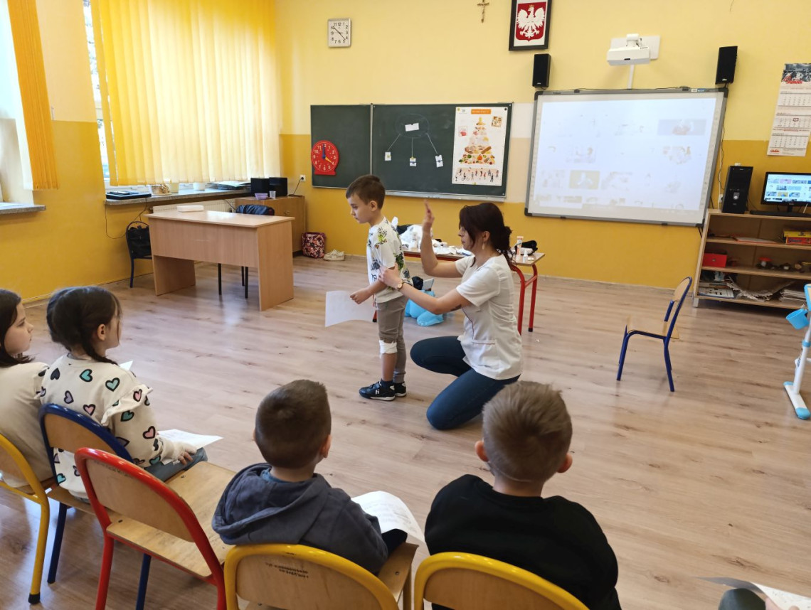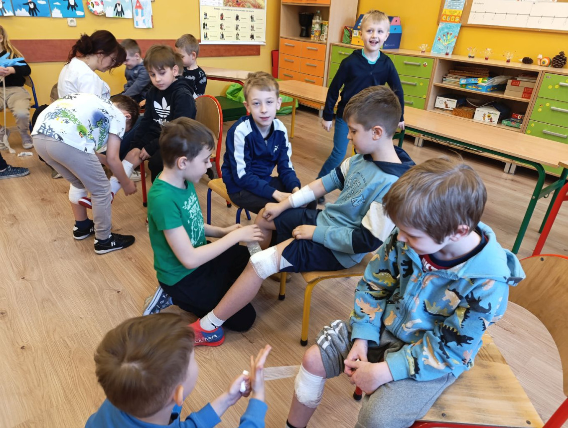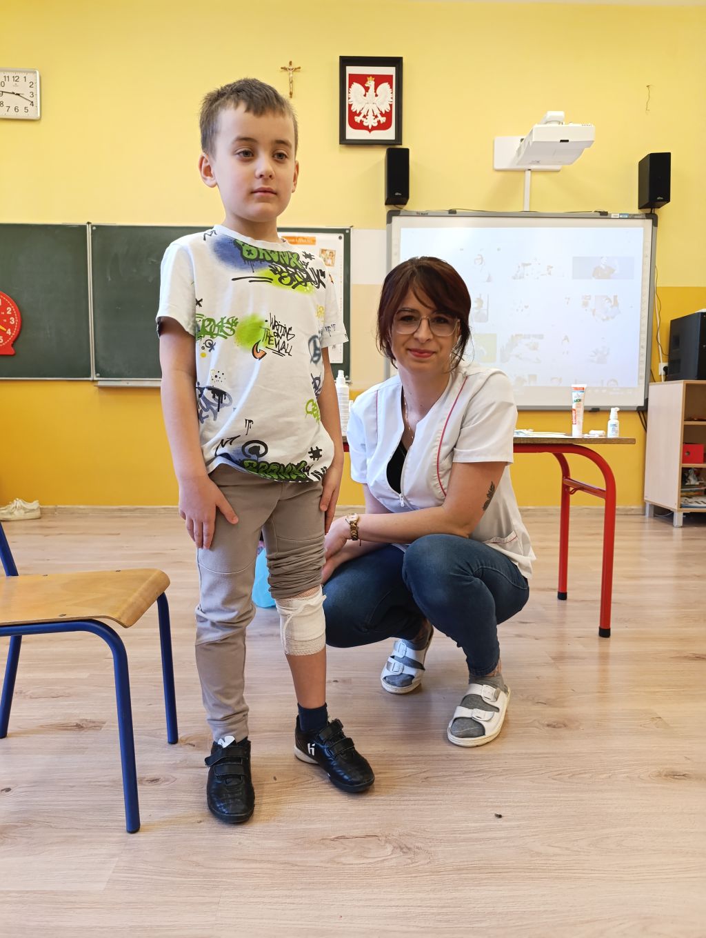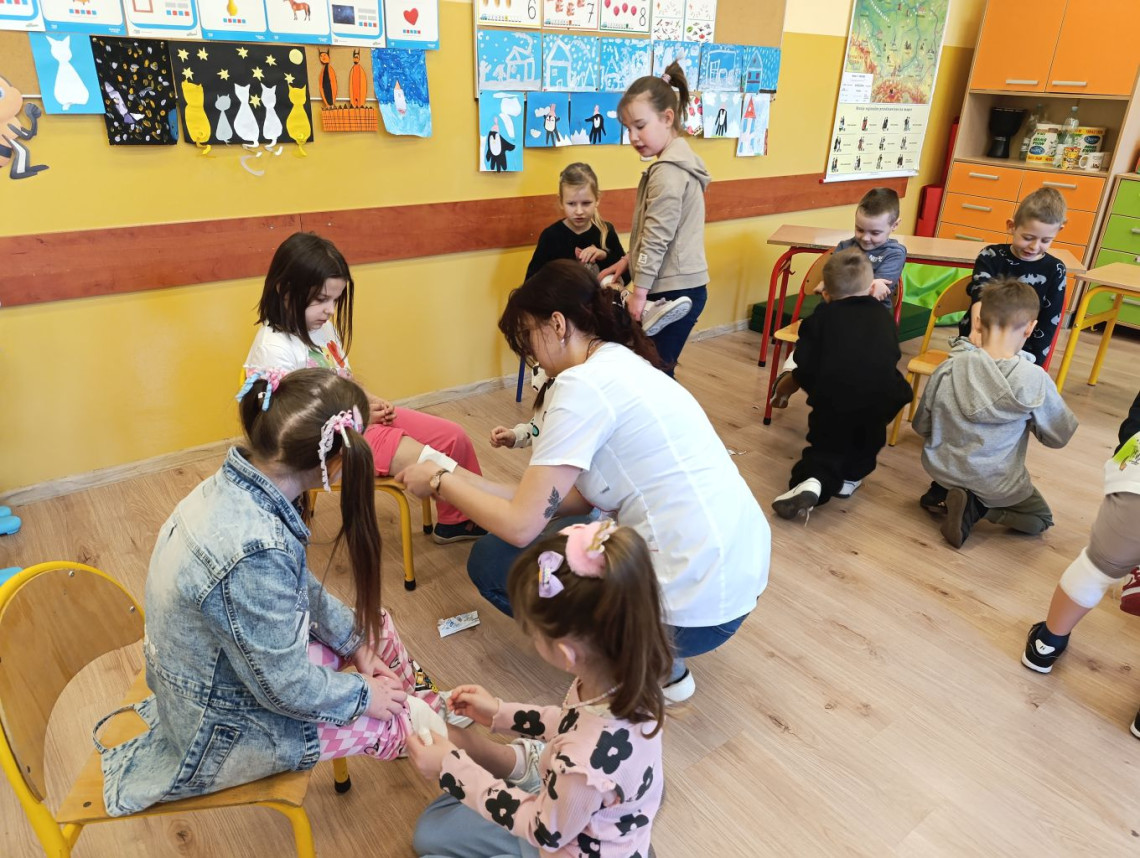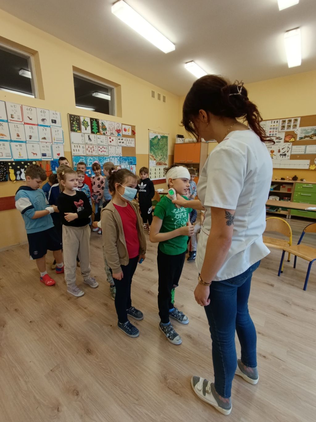 W dniu 10 marca 2025 r. uczniowie z klas pierwszych w ramach realizacji innowacji uczestniczyli w spotkaniu z pielęgniarką panią Magdaleną Mikus. Celem spotkania było przybliżenie dzieciom zawodu pielęgniarki jak również uświadomienie konieczności dbania o swoje zdrowie. Pielęgniarka opowiadając o swojej pracy demonstrowała dzieciom różne akcesoria medyczne: bandaże, plasterki, termometr, ciśnieniomierz, glukometr itp. Jednak największą frajdą dla dzieci było mierzenie temperatury i ciśnienia przez pielęgniarkę, naklejanie plasterków i wzajemne bandażowanie kolegów i koleżanek. Na zakończenie spotkania wszyscy uczniowie pozowali do pamiątkowego zdjęcia, otrzymali kolorowankę z numerami alarmowymi i naklejkę – DZIELNY PACJENT. Spotkanie to przyniosło wszystkim mnóstwo emocji i pozytywnych wrażeń.