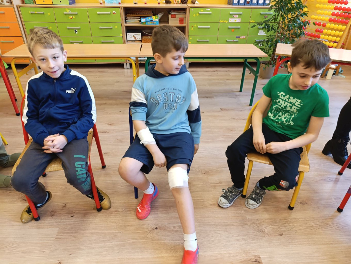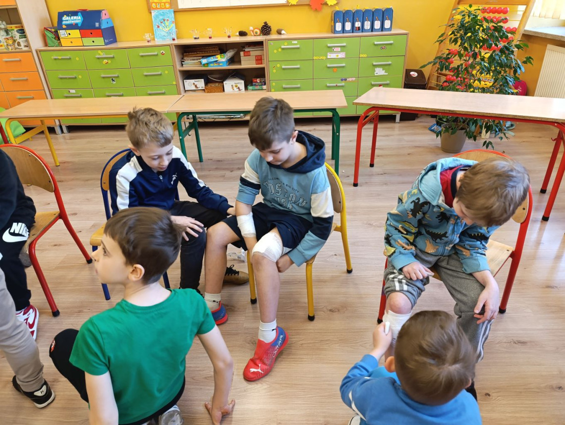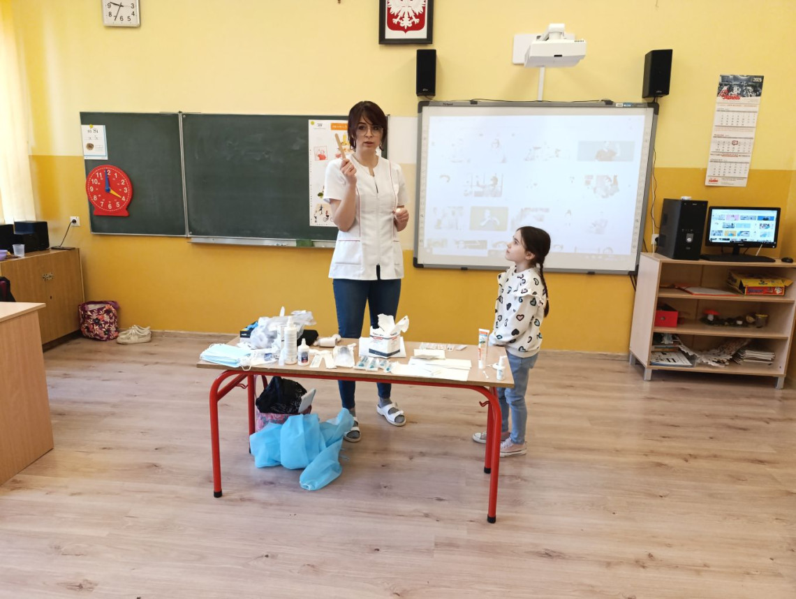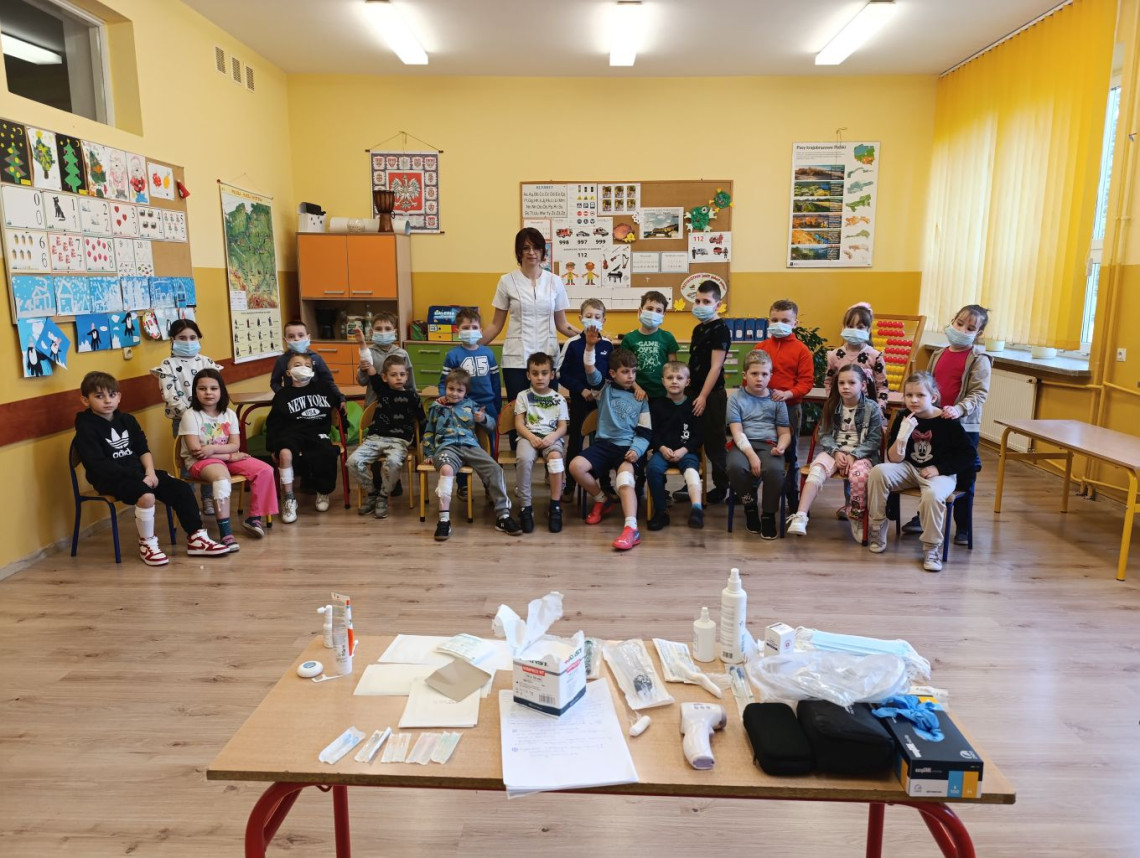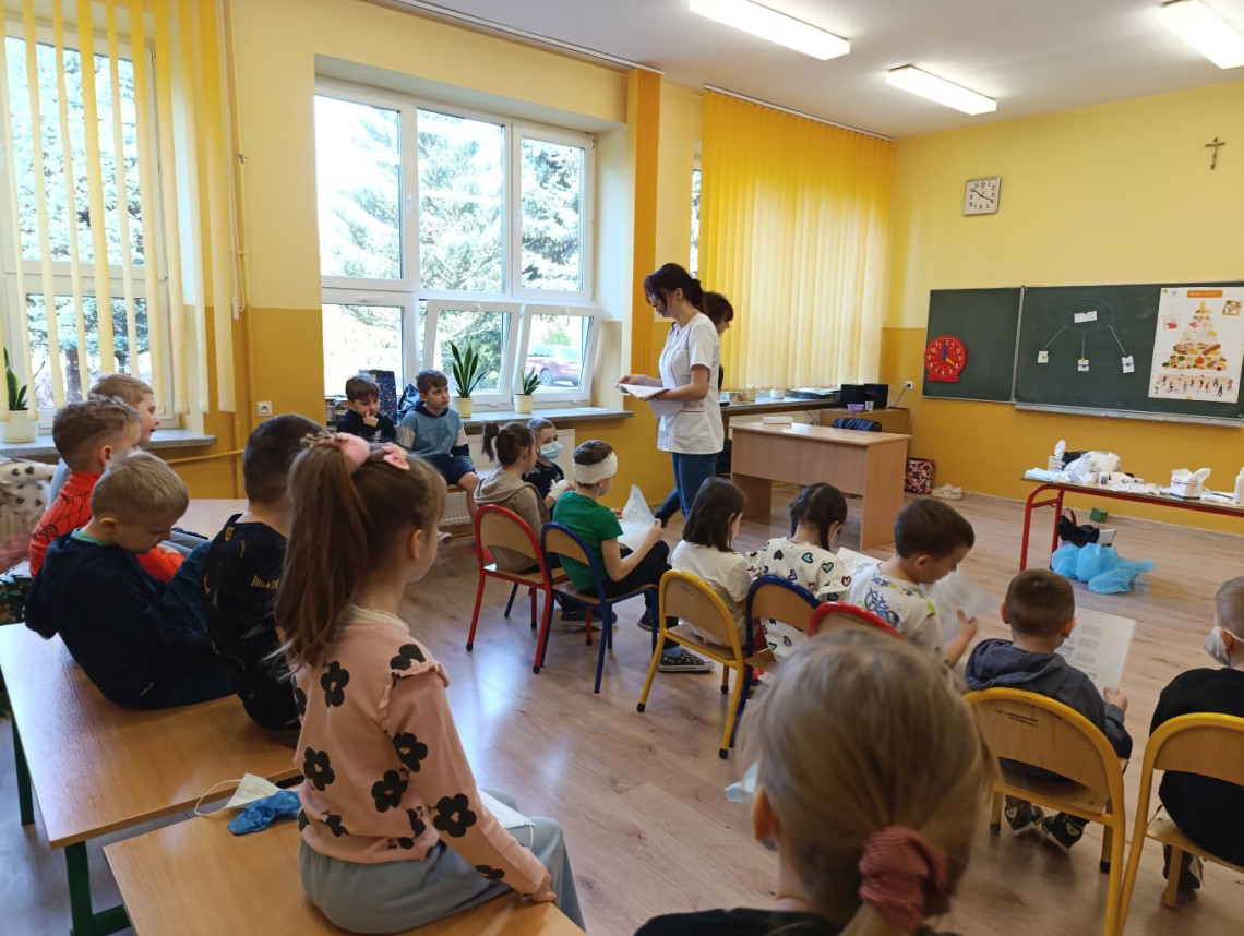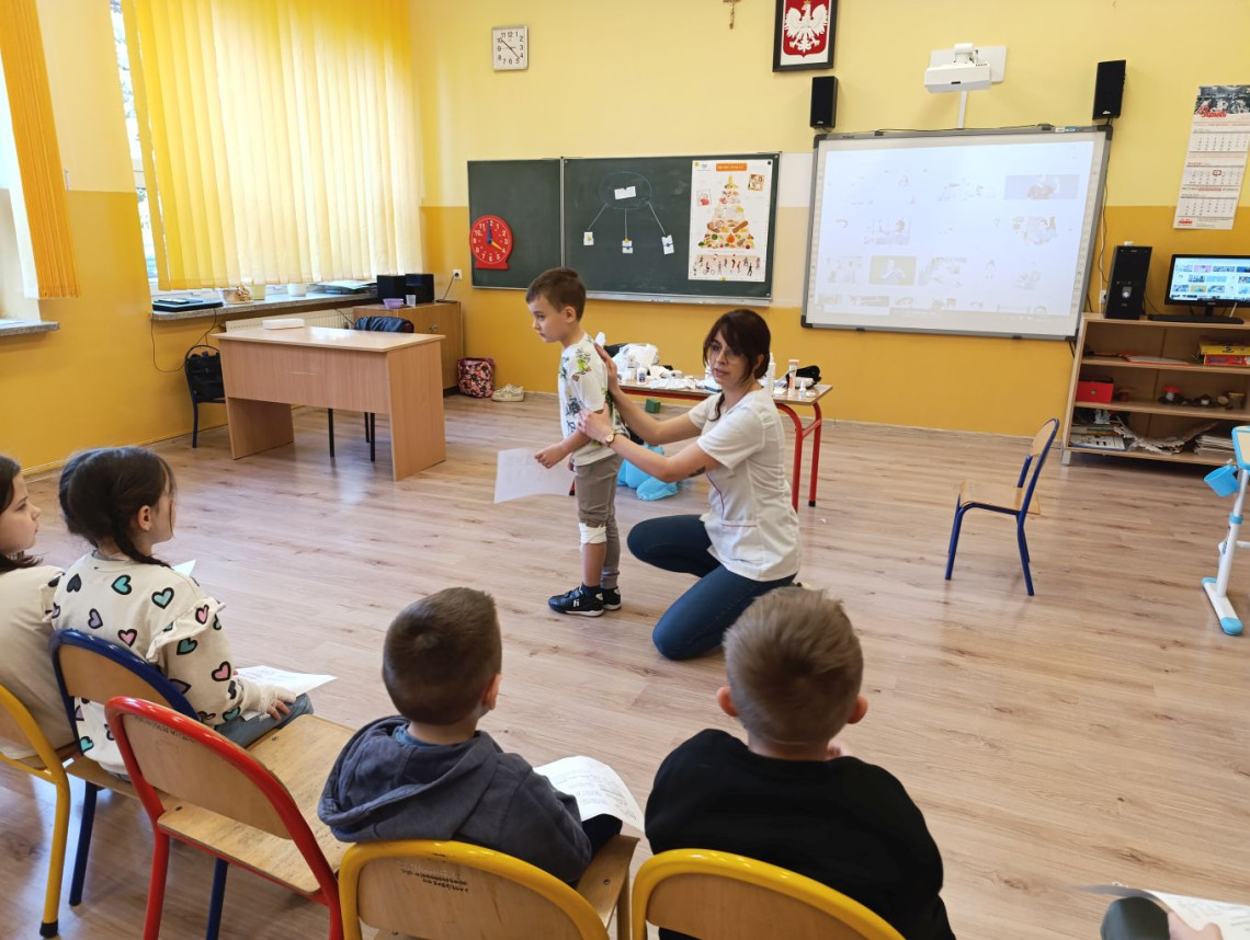 W dniu 10 marca 2025 r. uczniowie z klas pierwszych w ramach realizacji innowacji uczestniczyli w spotkaniu z pielęgniarką panią Magdaleną Mikus. Celem spotkania było przybliżenie dzieciom zawodu pielęgniarki jak również uświadomienie konieczności dbania o swoje zdrowie. Pielęgniarka opowiadając o swojej pracy demonstrowała dzieciom różne akcesoria medyczne: bandaże, plasterki, termometr, ciśnieniomierz, glukometr itp. Jednak największą frajdą dla dzieci było mierzenie temperatury i ciśnienia przez pielęgniarkę, naklejanie plasterków i wzajemne bandażowanie kolegów i koleżanek. Na zakończenie spotkania wszyscy uczniowie pozowali do pamiątkowego zdjęcia, otrzymali kolorowankę z numerami alarmowymi i naklejkę – DZIELNY PACJENT. Spotkanie to przyniosło wszystkim mnóstwo emocji i pozytywnych wrażeń.