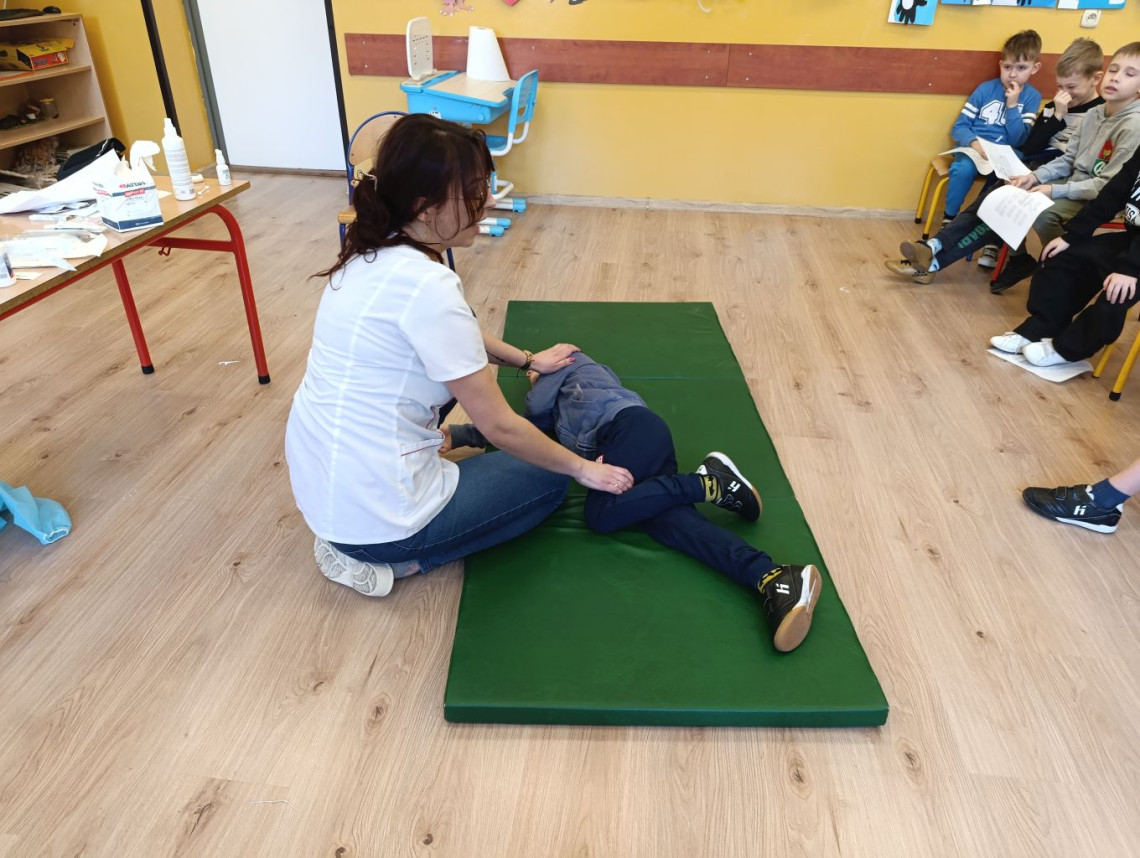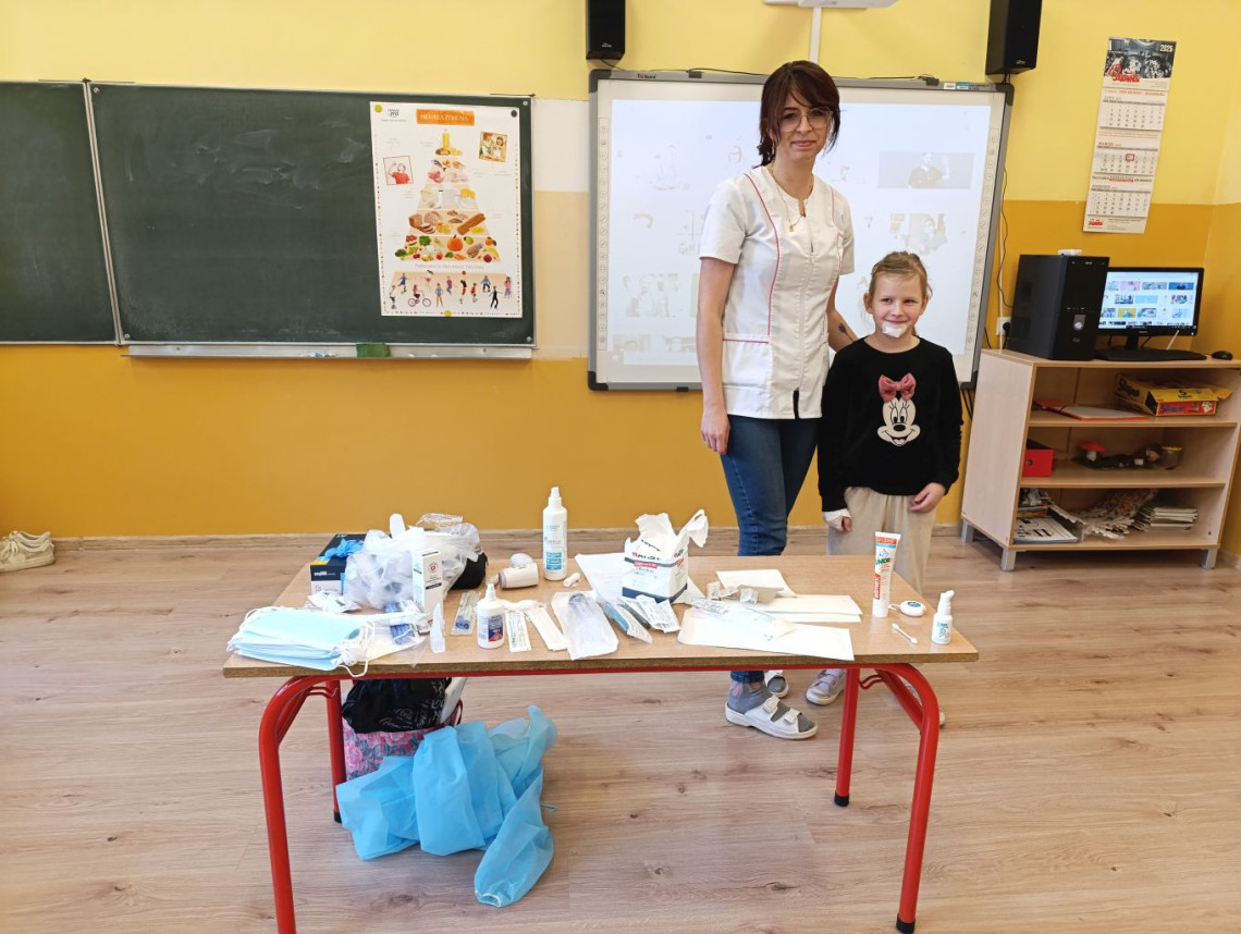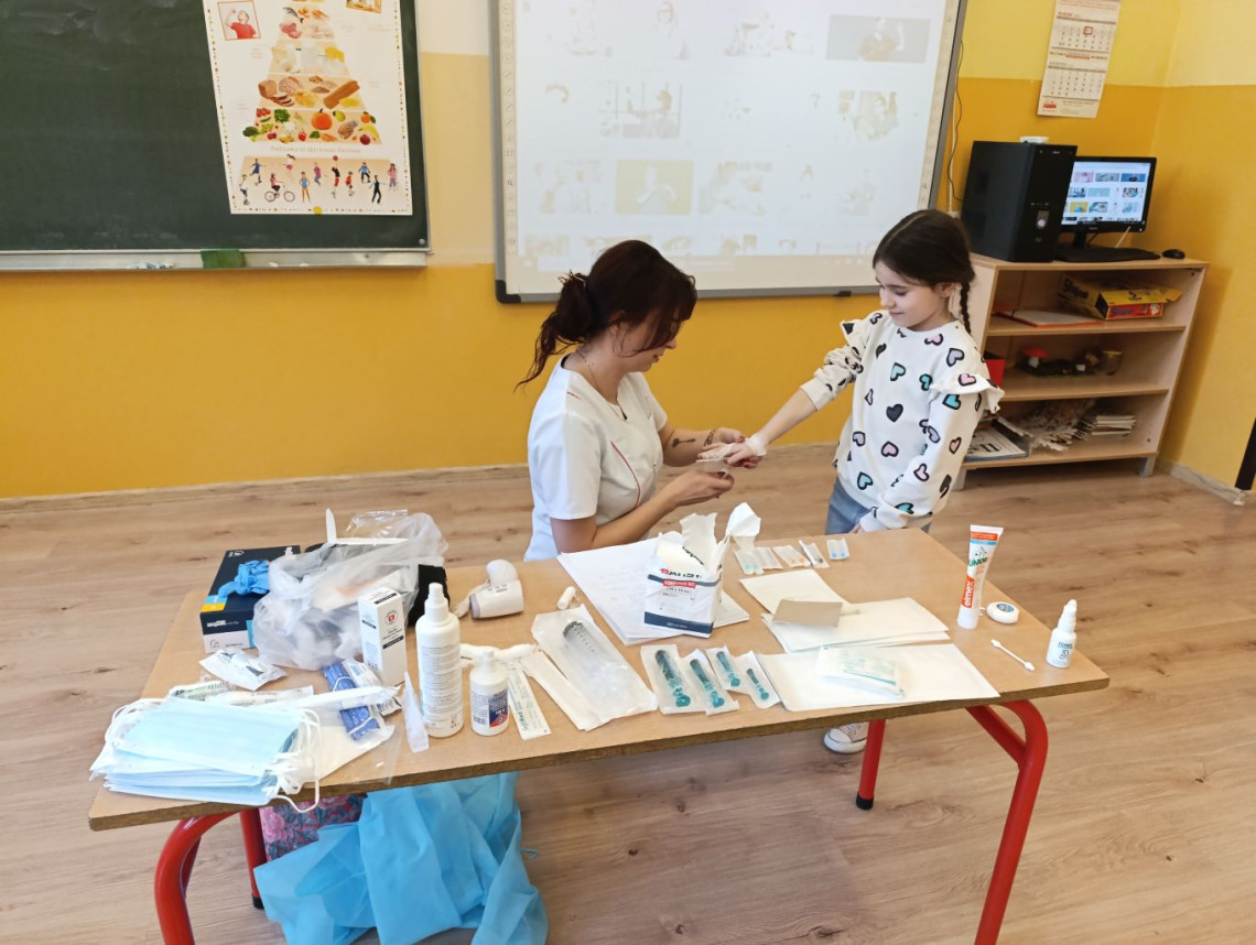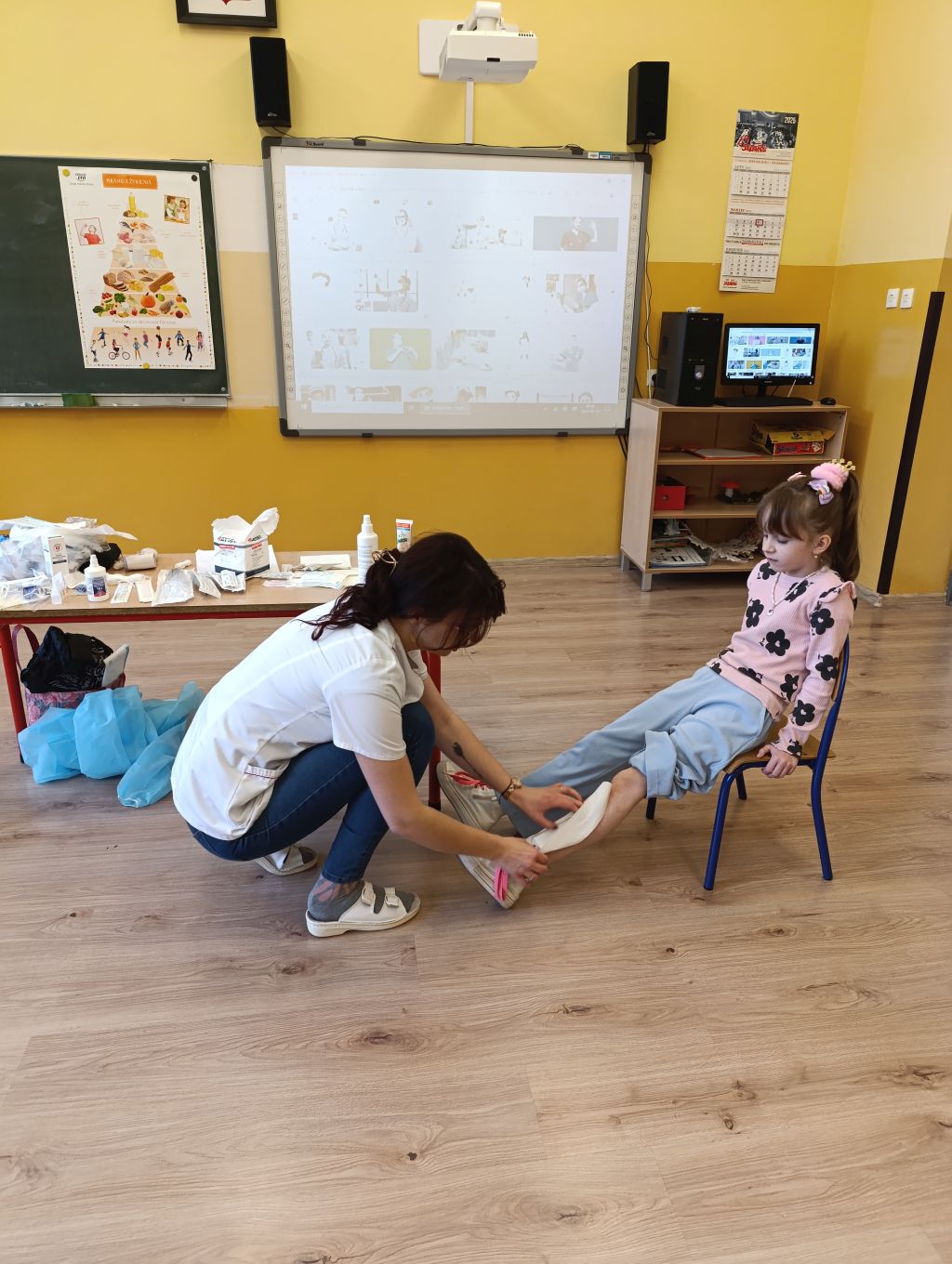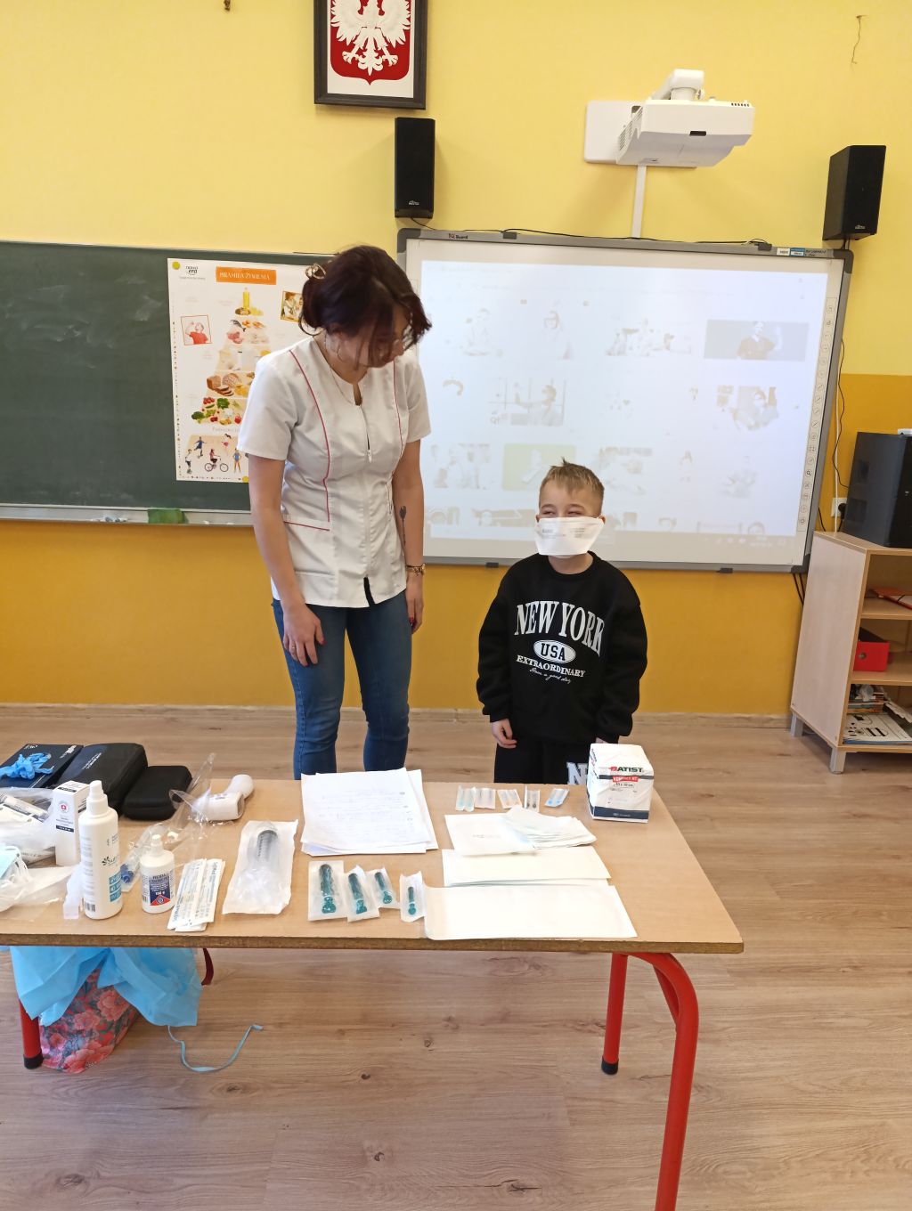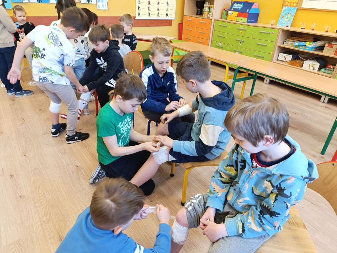 W dniu 10 marca 2025 r. uczniowie z klas pierwszych w ramach realizacji innowacji uczestniczyli w spotkaniu z pielęgniarką panią Magdaleną Mikus. Celem spotkania było przybliżenie dzieciom zawodu pielęgniarki jak również uświadomienie konieczności dbania o swoje zdrowie. Pielęgniarka opowiadając o swojej pracy demonstrowała dzieciom różne akcesoria medyczne: bandaże, plasterki, termometr, ciśnieniomierz, glukometr itp. Jednak największą frajdą dla dzieci było mierzenie temperatury i ciśnienia przez pielęgniarkę, naklejanie plasterków i wzajemne bandażowanie kolegów i koleżanek. Na zakończenie spotkania wszyscy uczniowie pozowali do pamiątkowego zdjęcia, otrzymali kolorowankę z numerami alarmowymi i naklejkę – DZIELNY PACJENT. Spotkanie to przyniosło wszystkim mnóstwo emocji i pozytywnych wrażeń.