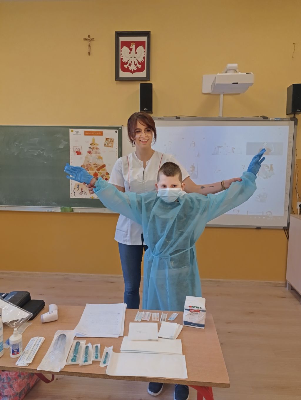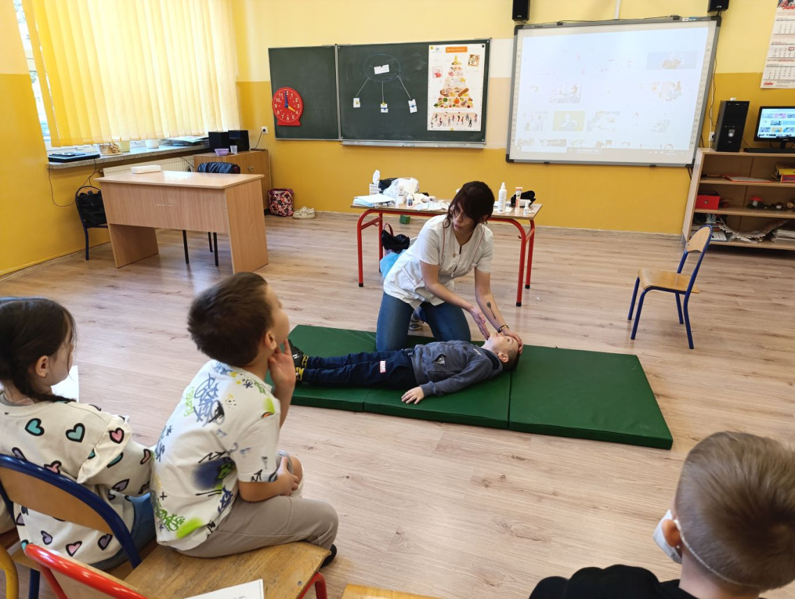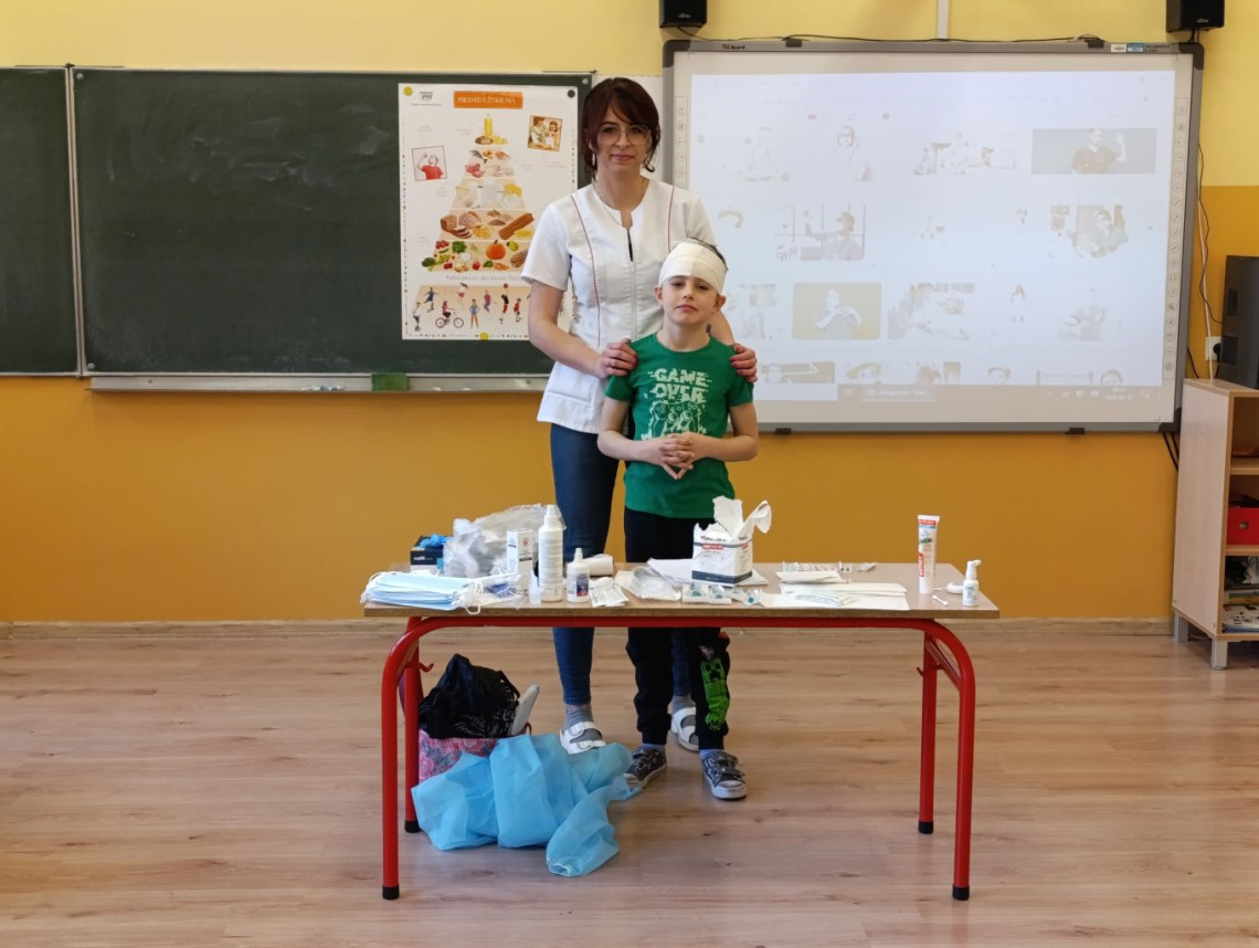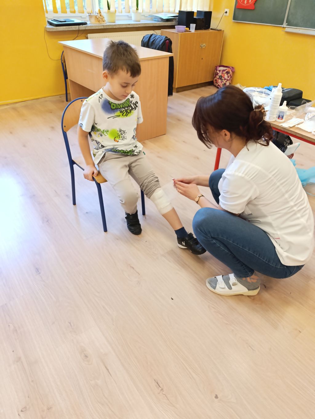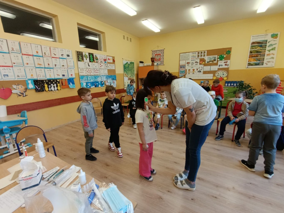 W dniu 10 marca 2025 r. uczniowie z klas pierwszych w ramach realizacji innowacji uczestniczyli w spotkaniu z pielęgniarką panią Magdaleną Mikus. Celem spotkania było przybliżenie dzieciom zawodu pielęgniarki jak również uświadomienie konieczności dbania o swoje zdrowie. Pielęgniarka opowiadając o swojej pracy demonstrowała dzieciom różne akcesoria medyczne: bandaże, plasterki, termometr, ciśnieniomierz, glukometr itp. Jednak największą frajdą dla dzieci było mierzenie temperatury i ciśnienia przez pielęgniarkę, naklejanie plasterków i wzajemne bandażowanie kolegów i koleżanek. Na zakończenie spotkania wszyscy uczniowie pozowali do pamiątkowego zdjęcia, otrzymali kolorowankę z numerami alarmowymi i naklejkę – DZIELNY PACJENT. Spotkanie to przyniosło wszystkim mnóstwo emocji i pozytywnych wrażeń.