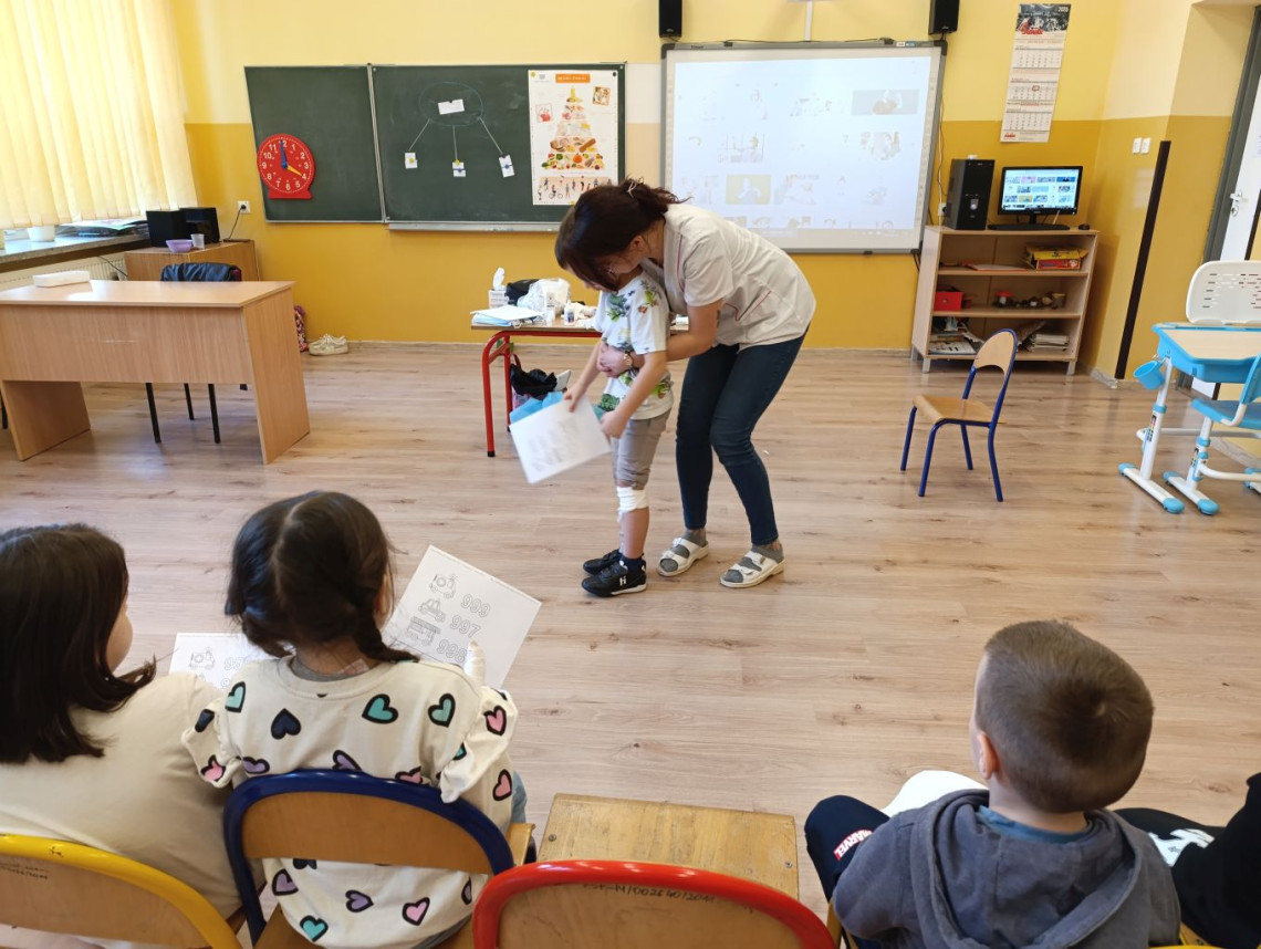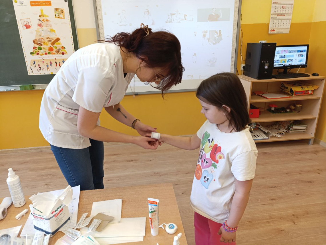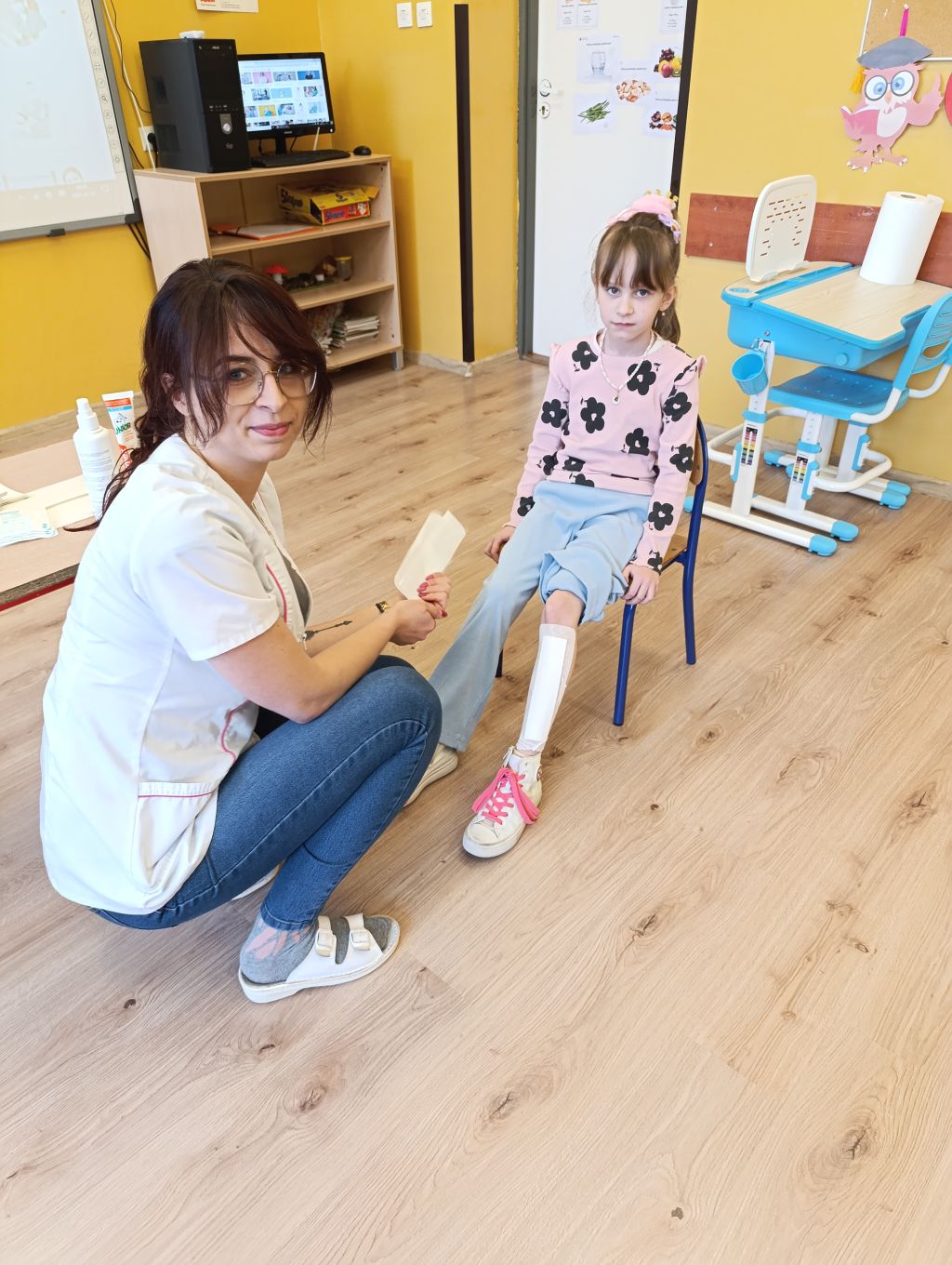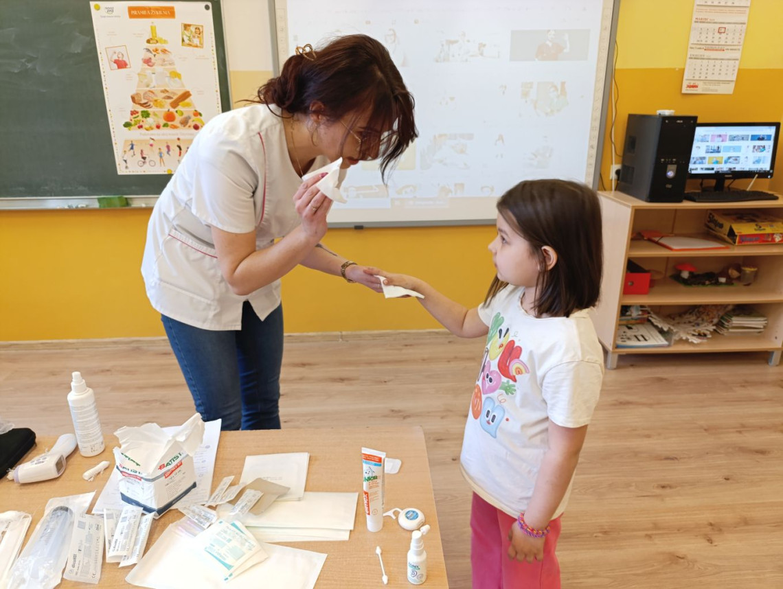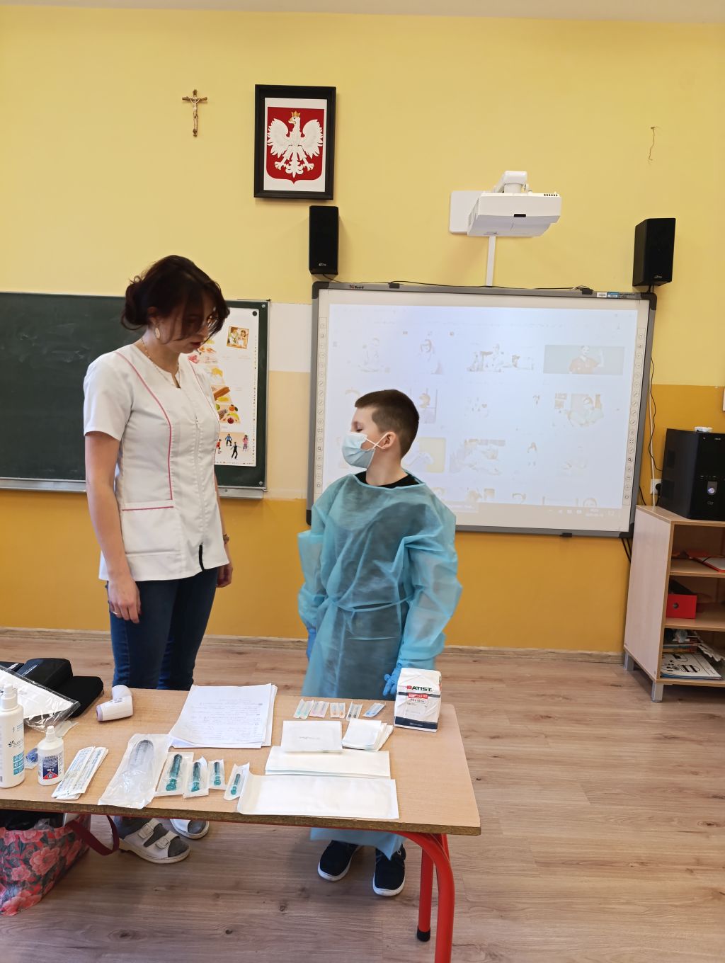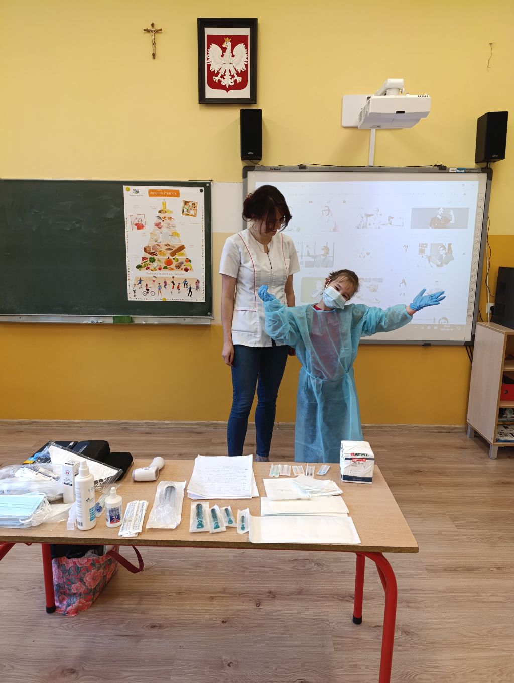 W dniu 10 marca 2025 r. uczniowie z klas pierwszych w ramach realizacji innowacji uczestniczyli w spotkaniu z pielęgniarką panią Magdaleną Mikus. Celem spotkania było przybliżenie dzieciom zawodu pielęgniarki jak również uświadomienie konieczności dbania o swoje zdrowie. Pielęgniarka opowiadając o swojej pracy demonstrowała dzieciom różne akcesoria medyczne: bandaże, plasterki, termometr, ciśnieniomierz, glukometr itp. Jednak największą frajdą dla dzieci było mierzenie temperatury i ciśnienia przez pielęgniarkę, naklejanie plasterków i wzajemne bandażowanie kolegów i koleżanek. Na zakończenie spotkania wszyscy uczniowie pozowali do pamiątkowego zdjęcia, otrzymali kolorowankę z numerami alarmowymi i naklejkę – DZIELNY PACJENT. Spotkanie to przyniosło wszystkim mnóstwo emocji i pozytywnych wrażeń.