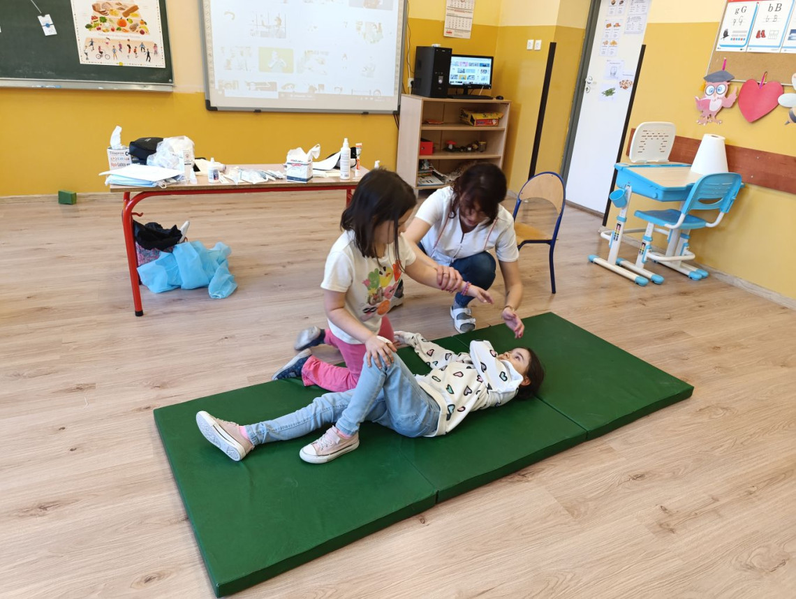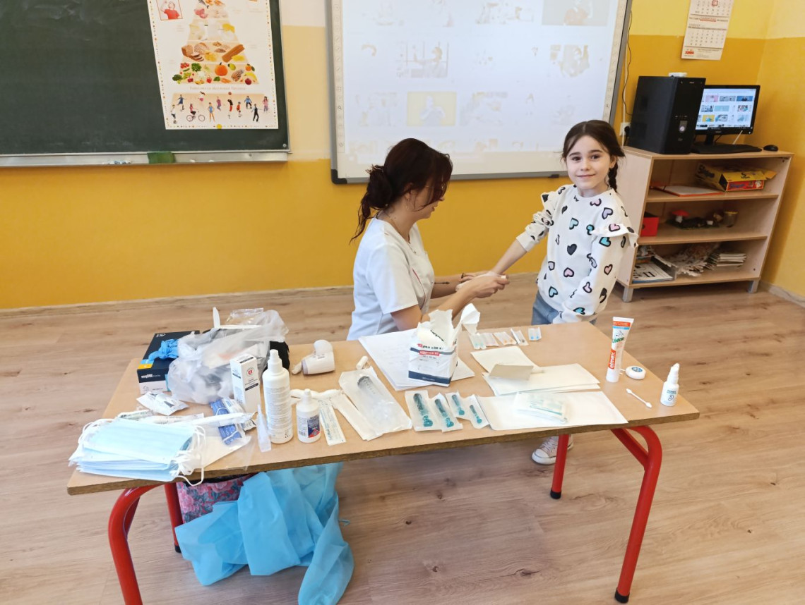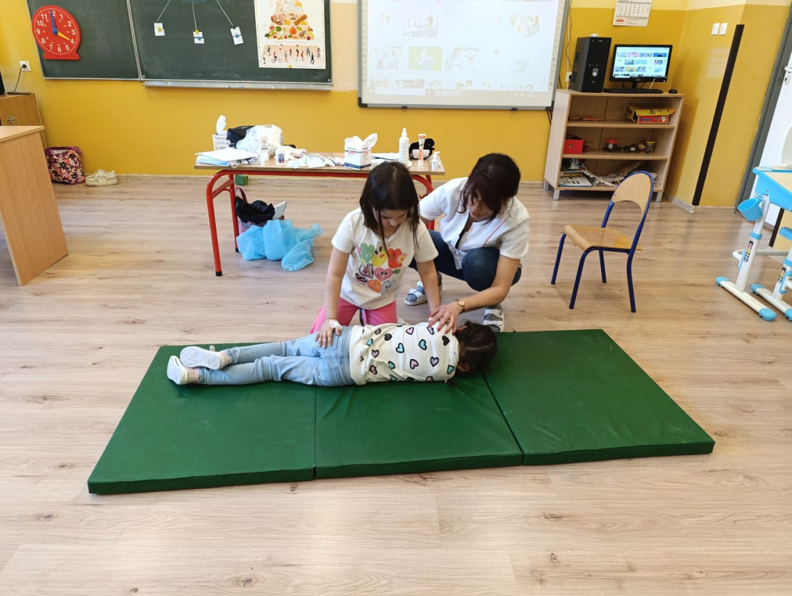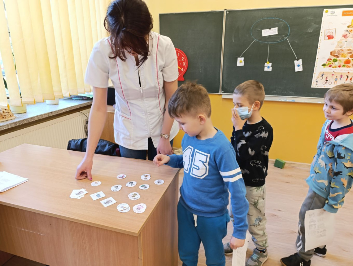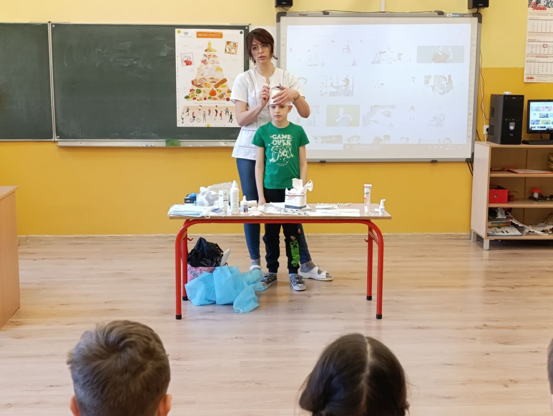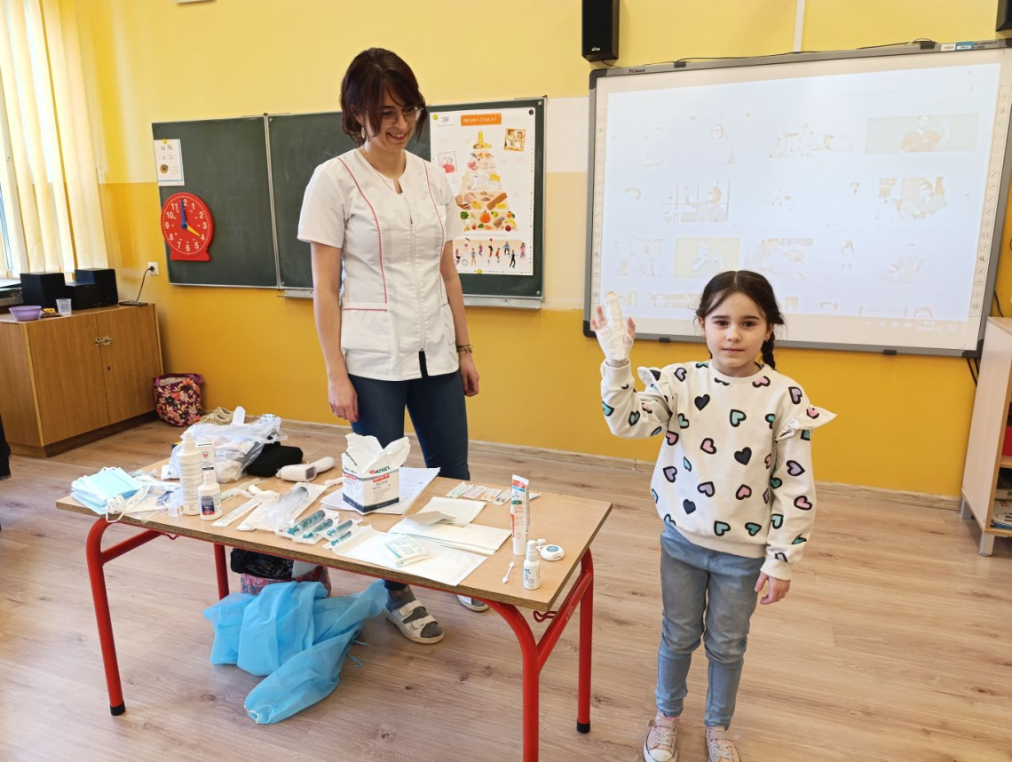 W dniu 10 marca 2025 r. uczniowie z klas pierwszych w ramach realizacji innowacji uczestniczyli w spotkaniu z pielęgniarką panią Magdaleną Mikus. Celem spotkania było przybliżenie dzieciom zawodu pielęgniarki jak również uświadomienie konieczności dbania o swoje zdrowie. Pielęgniarka opowiadając o swojej pracy demonstrowała dzieciom różne akcesoria medyczne: bandaże, plasterki, termometr, ciśnieniomierz, glukometr itp. Jednak największą frajdą dla dzieci było mierzenie temperatury i ciśnienia przez pielęgniarkę, naklejanie plasterków i wzajemne bandażowanie kolegów i koleżanek. Na zakończenie spotkania wszyscy uczniowie pozowali do pamiątkowego zdjęcia, otrzymali kolorowankę z numerami alarmowymi i naklejkę – DZIELNY PACJENT. Spotkanie to przyniosło wszystkim mnóstwo emocji i pozytywnych wrażeń.