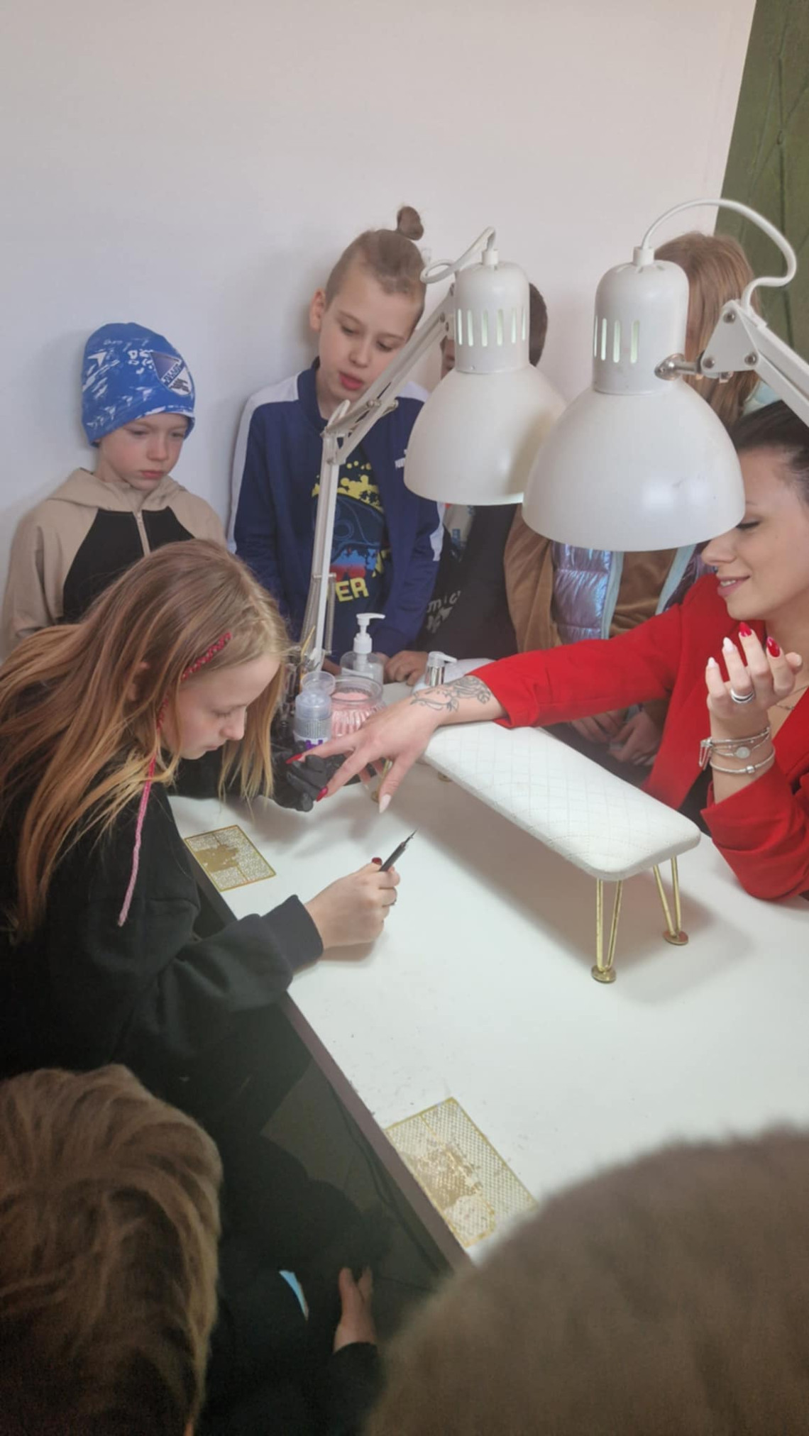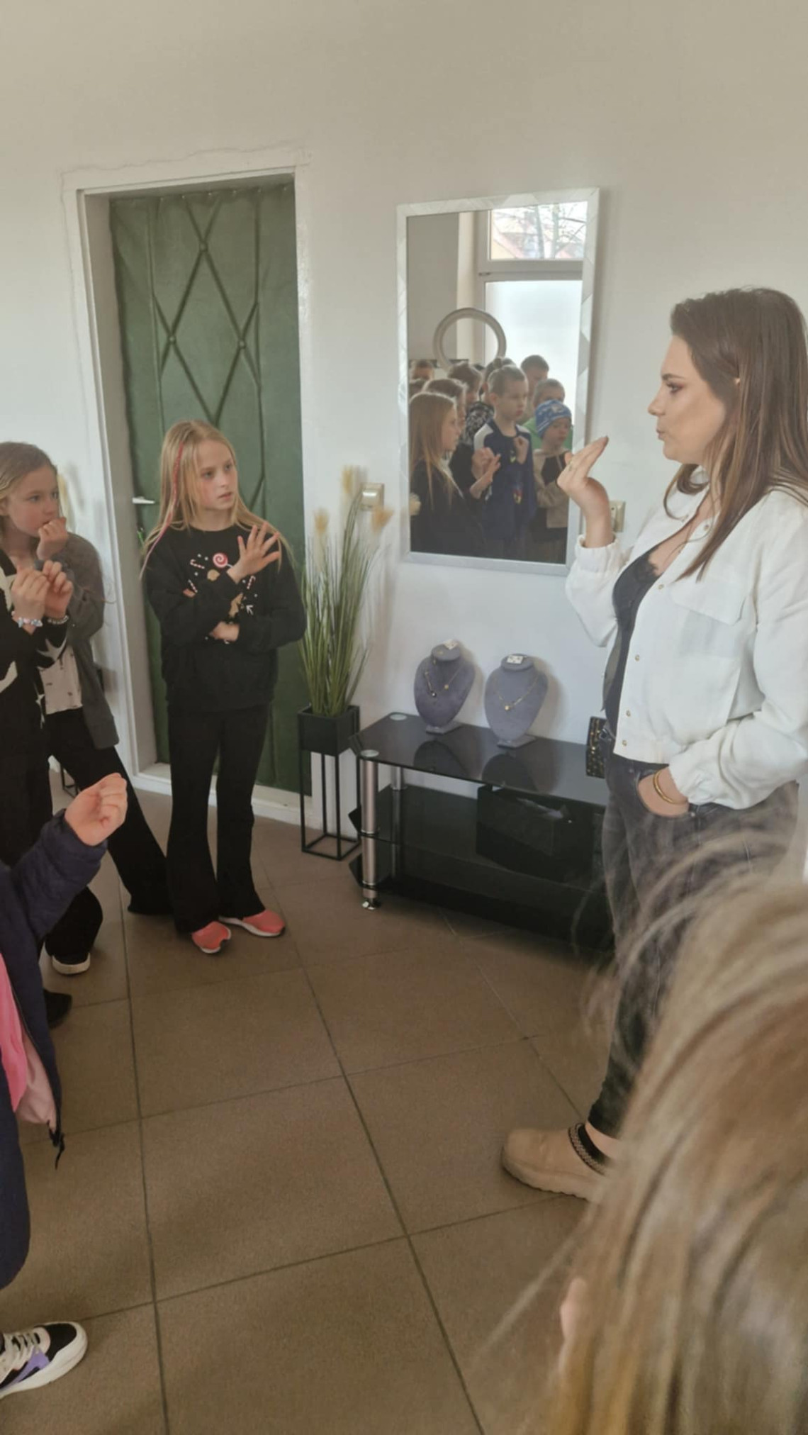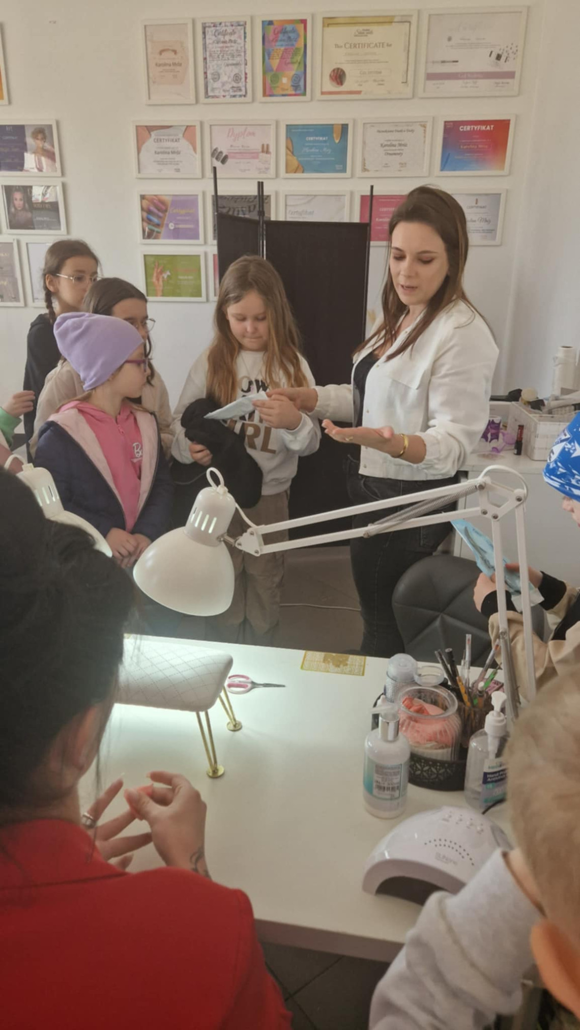 Kosmetyczka Pani Karolina Mróz zapoznała dzieci ze specyfiką wykonywanego przez siebie zawodu, uświadomiła uczniom, że w tym zawodzie bardzo ważna jest znajomość preparatów, ich składu, zastosowania i działania. Dzieci z zainteresowaniem słuchały przekazywanych wiadomości i odpowiadały na pytania zadawane przez Panią Karolinę. Kosmetyczka pokazała uczniom przybory, które wykorzystuje w codziennej pracy. Dzieci mogły same pomalować paznokcie, co sprawiło im wiele radości. Spotkanie z kosmetyczką dostarczyło dzieciom wielu wrażeń.