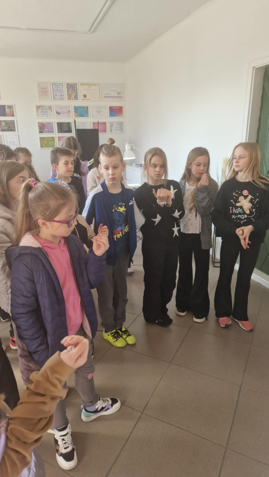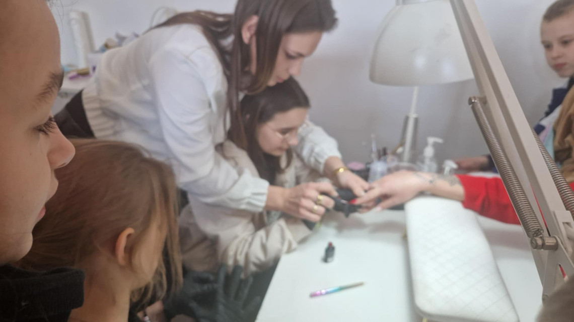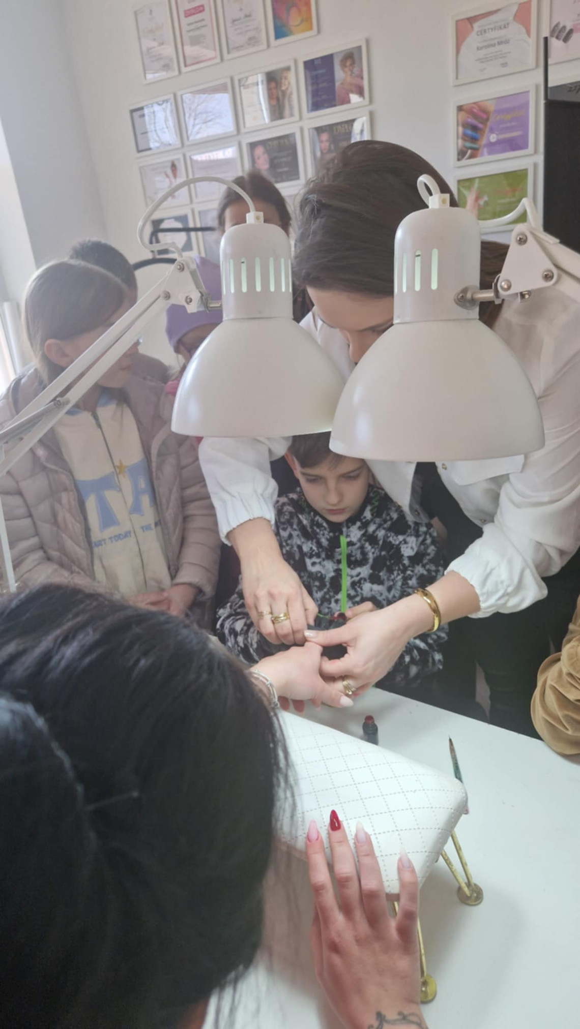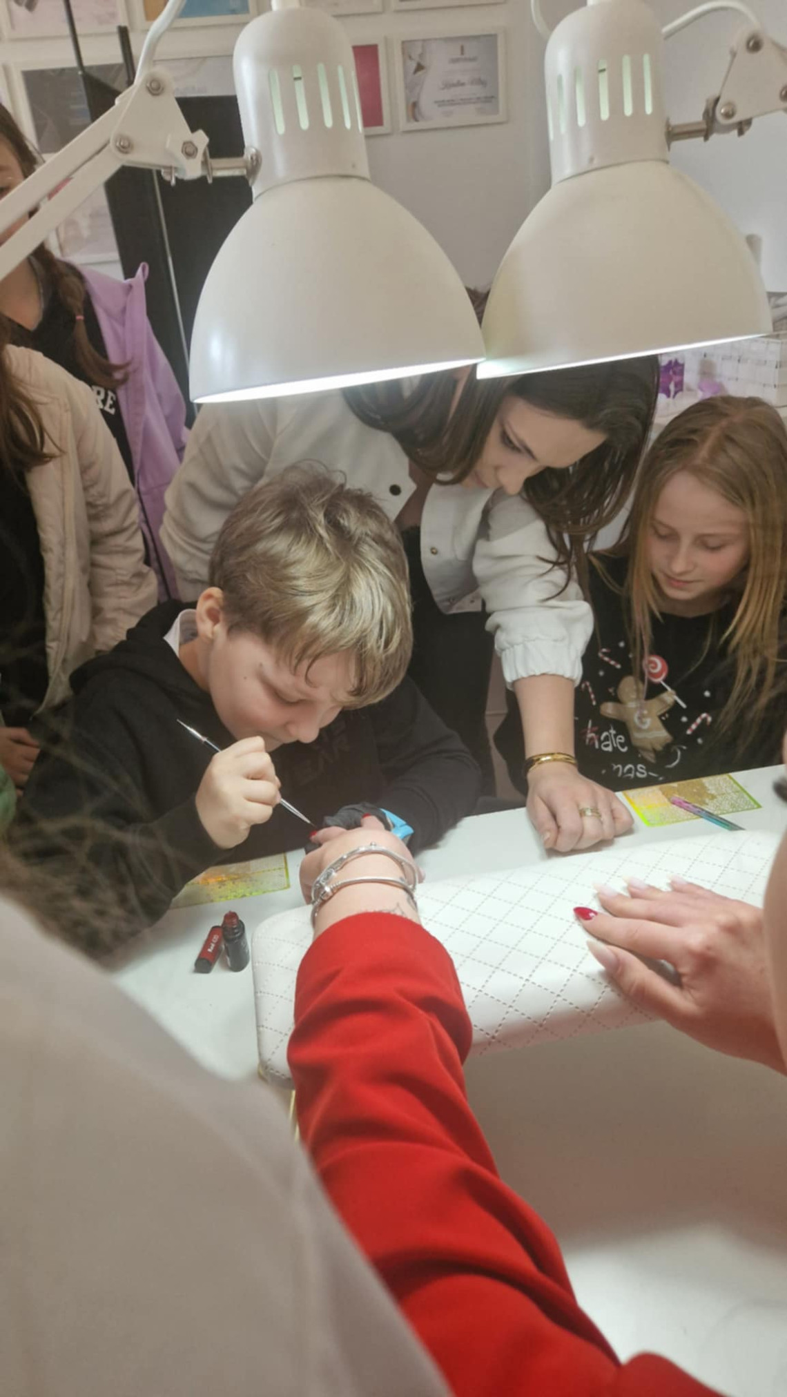 Kosmetyczka Pani Karolina Mróz zapoznała dzieci ze specyfiką wykonywanego przez siebie zawodu, uświadomiła uczniom, że w tym zawodzie bardzo ważna jest znajomość preparatów, ich składu, zastosowania i działania. Dzieci z zainteresowaniem słuchały przekazywanych wiadomości i odpowiadały na pytania zadawane przez Panią Karolinę. Kosmetyczka pokazała uczniom przybory, które wykorzystuje w codziennej pracy. Dzieci mogły same pomalować paznokcie, co sprawiło im wiele radości. Spotkanie z kosmetyczką dostarczyło dzieciom wielu wrażeń.