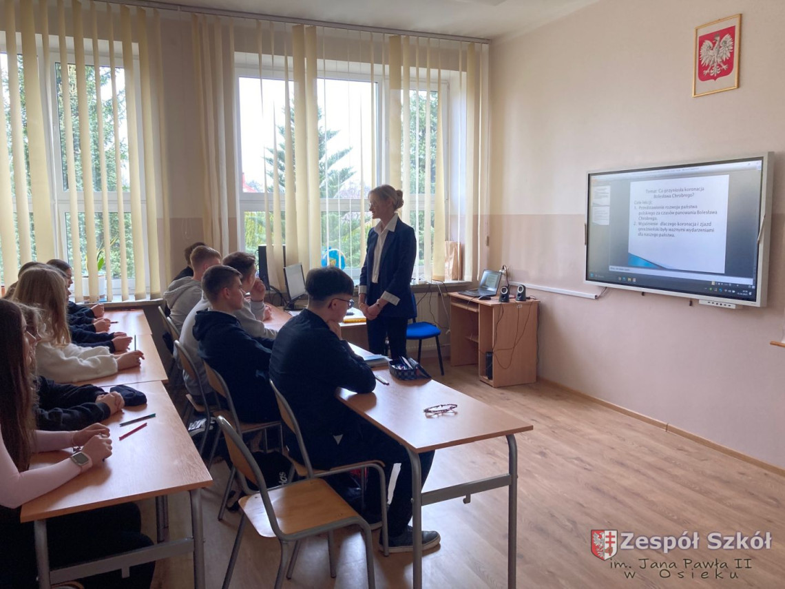 1 kwietnia 2025roku w klasie VIII została zorganizowana lekcja otwarta z historii. Tematem zajęć była koronacja pierwszego króla Polski - Bolesław Chrobrego. Lekcja była jednym z działań w ramach realizacji Ogólnopolskiego Projektu Edukacyjnego 1000- lecie Królestwa Polskiego.