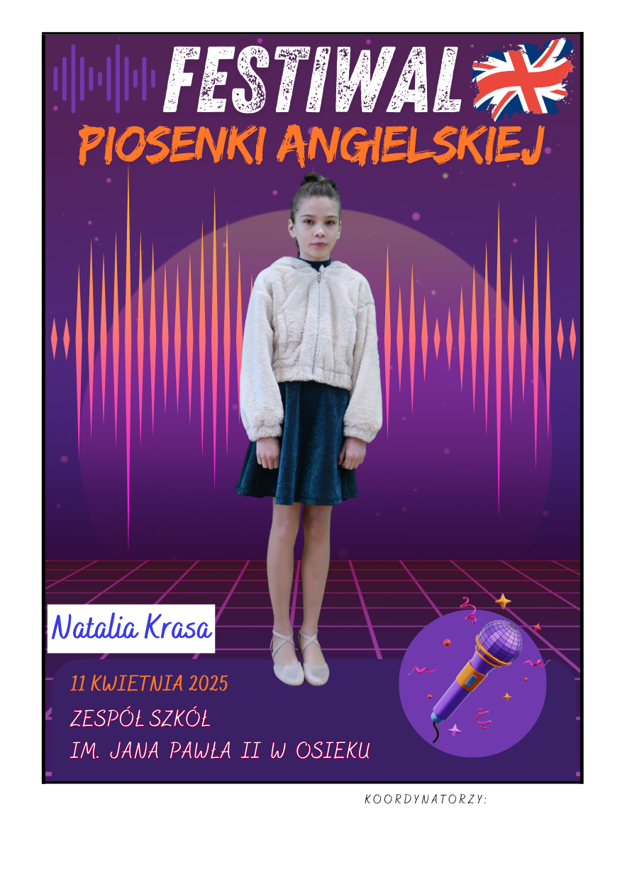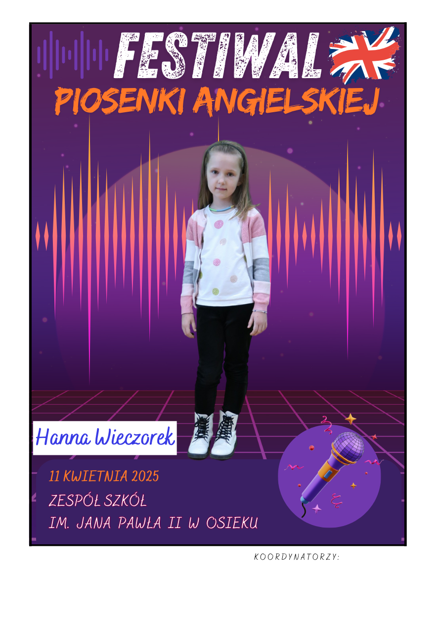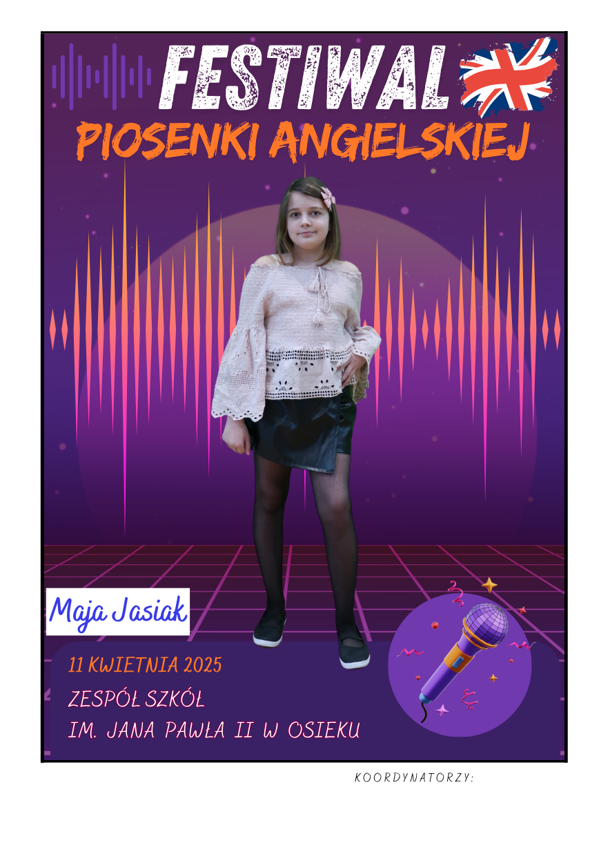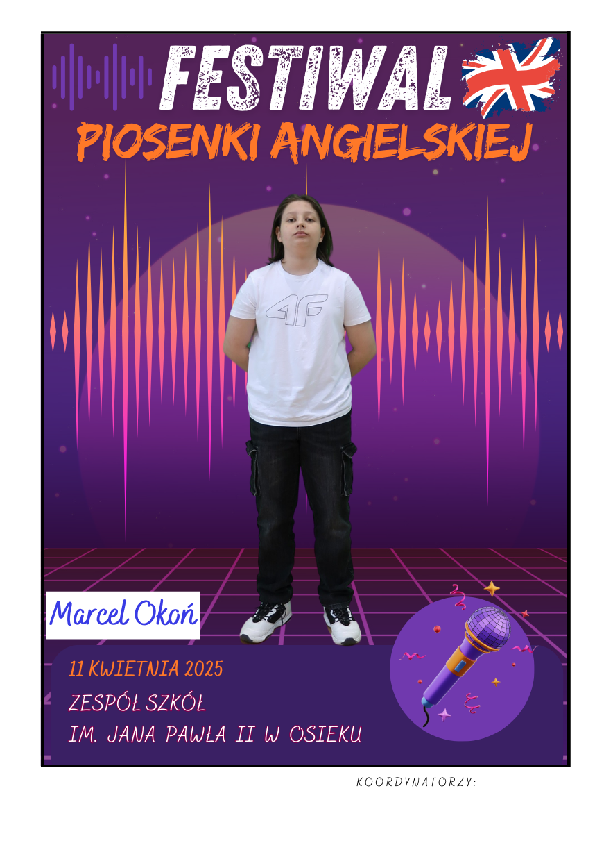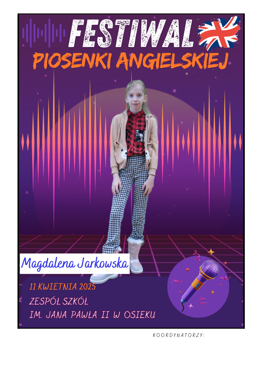 Na scenie zaprezentowali się soliści ze szkół podstawowych z gminy Osiek, którzy wykonali znane utwory w języku angielskim – od klasycznych ballad, przez energetyczne hity, aż po współczesne przeboje. Uczniowie zaskoczyli wszystkich nie tylko swoimi wokalnymi umiejętnościami, ale też odwagą, pomysłowością i sceniczną charyzmą. Występy były oceniane przez jury, które zwracało uwagę m.in. na poprawność językową, interpretację utworu oraz ogólny wyraz artystyczny.