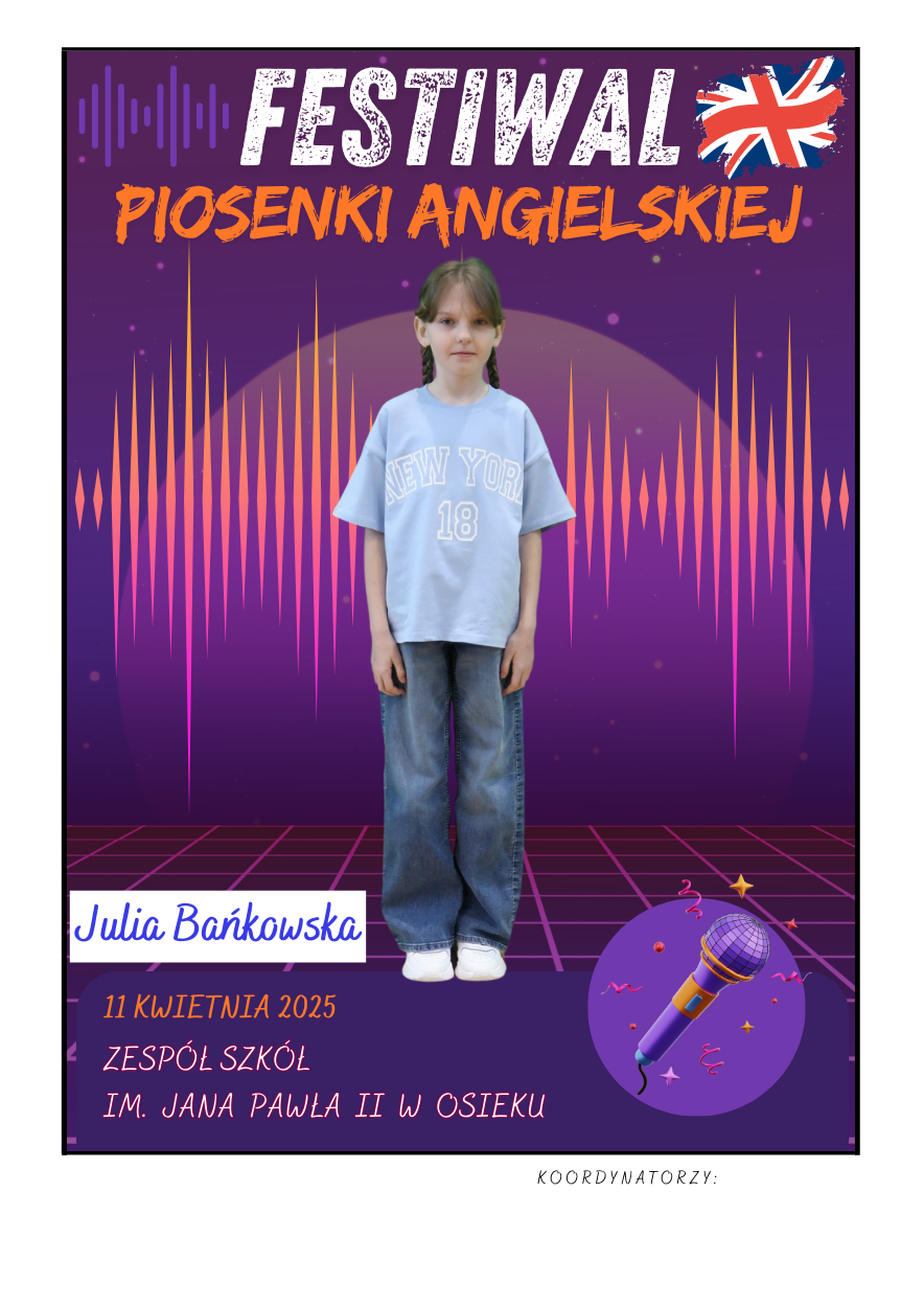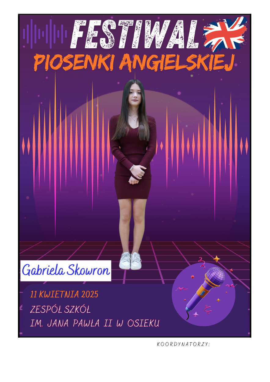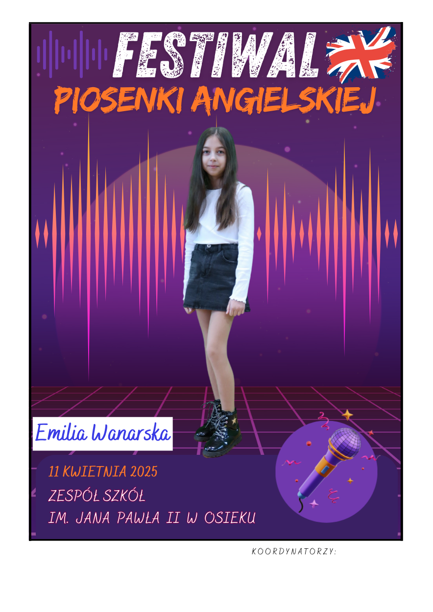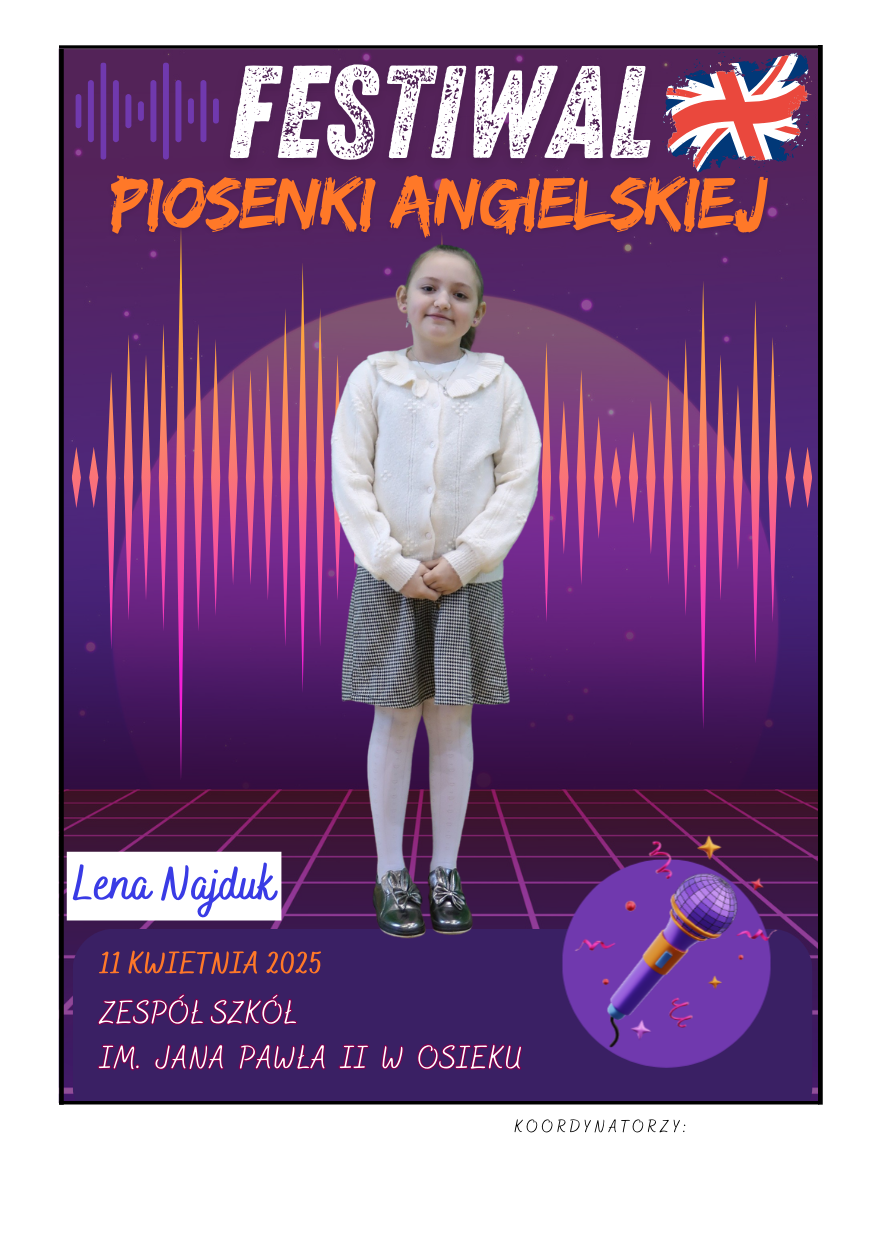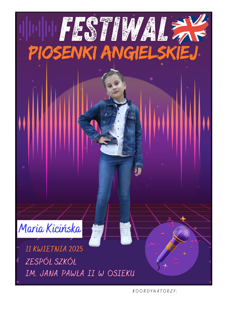 Na scenie zaprezentowali się soliści ze szkół podstawowych z gminy Osiek, którzy wykonali znane utwory w języku angielskim – od klasycznych ballad, przez energetyczne hity, aż po współczesne przeboje. Uczniowie zaskoczyli wszystkich nie tylko swoimi wokalnymi umiejętnościami, ale też odwagą, pomysłowością i sceniczną charyzmą. Występy były oceniane przez jury, które zwracało uwagę m.in. na poprawność językową, interpretację utworu oraz ogólny wyraz artystyczny.