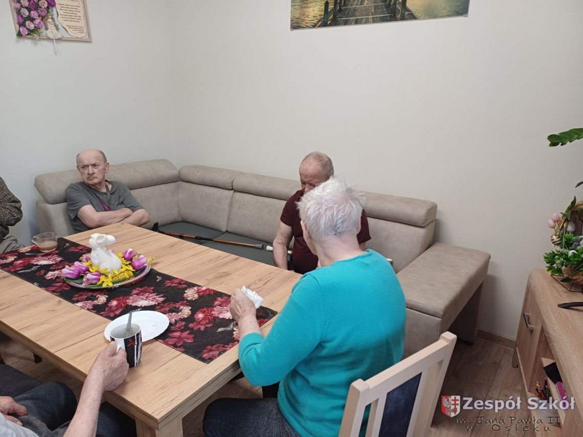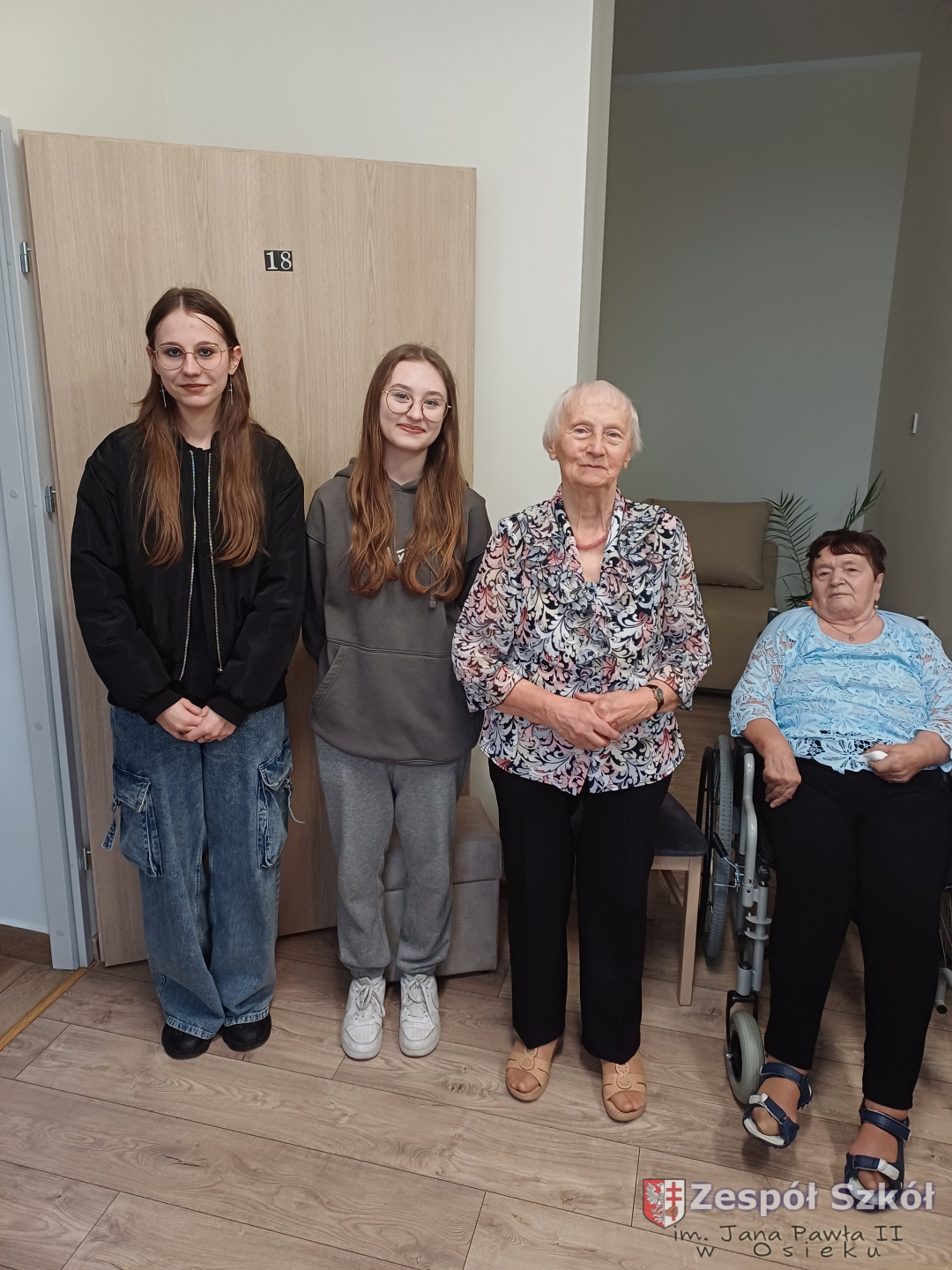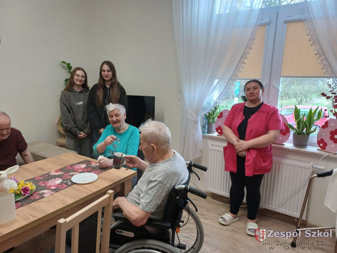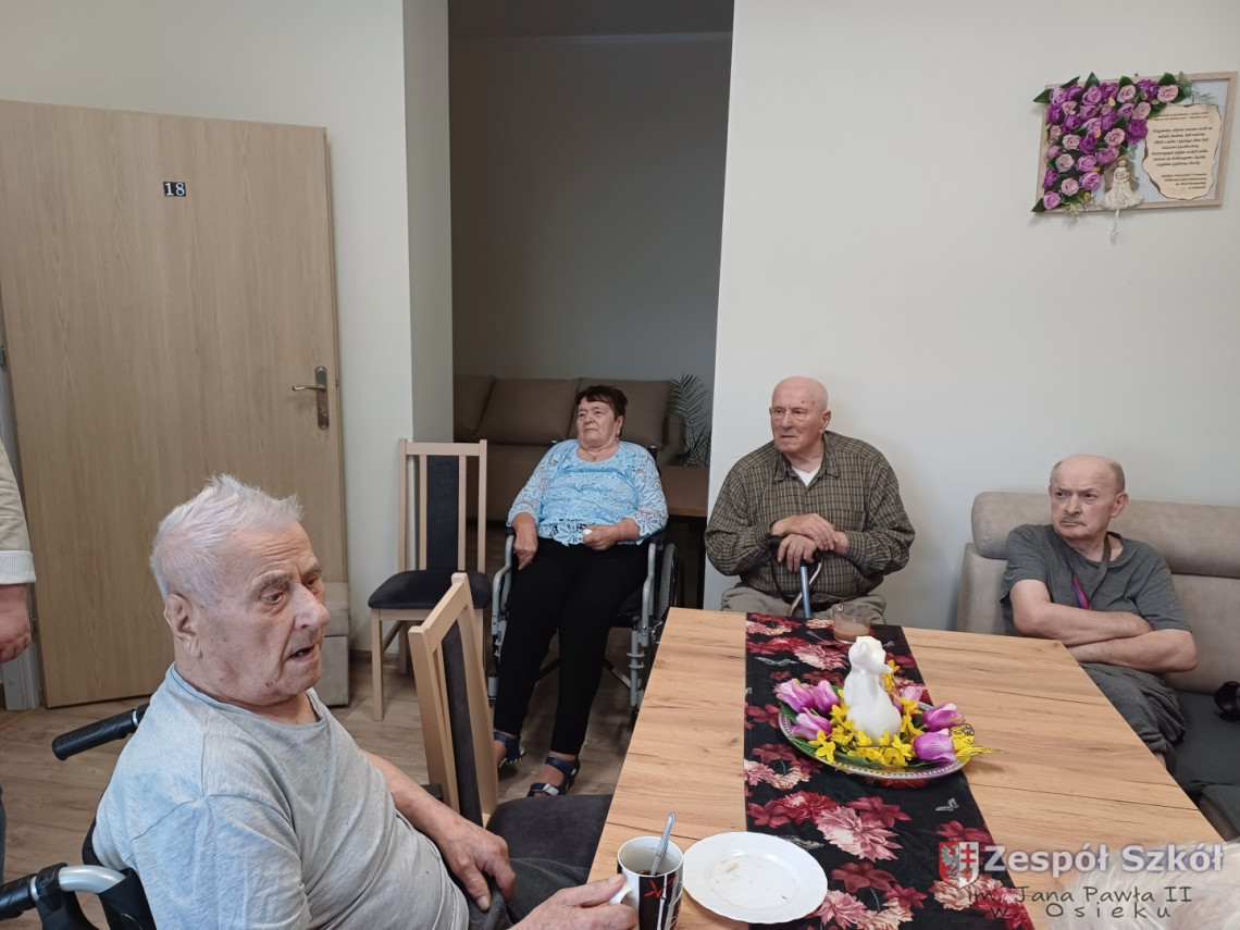 Dnia 15 kwietnia 2025r. uczniowie Zespołu Szkół im. Jana Pawła II w Osieku odwiedzili Dom Seniora w Bukowej w ramach przedświątecznej akcji wielkanocnej. Celem wizyty było sprawienie radości pensjonariuszom oraz budowanie międzypokoleniowych relacji. Podczas spotkania uczniowie wręczyli własnoręcznie wykonany stroik oraz kartkę świąteczną, składając seniorom płynące z serca życzenia z okazji nadchodzących Świąt Wielkanocnych. Nie zabrakło serdecznych rozmów, uśmiechów i wzruszeń. Uczniowie okazali seniorom wiele ciepła i życzliwości, a ich obecność została przyjęta z ogromną radością. Dla młodzieży była to cenna lekcja empatii, szacunku oraz wrażliwości na potrzeby drugiego człowieka.