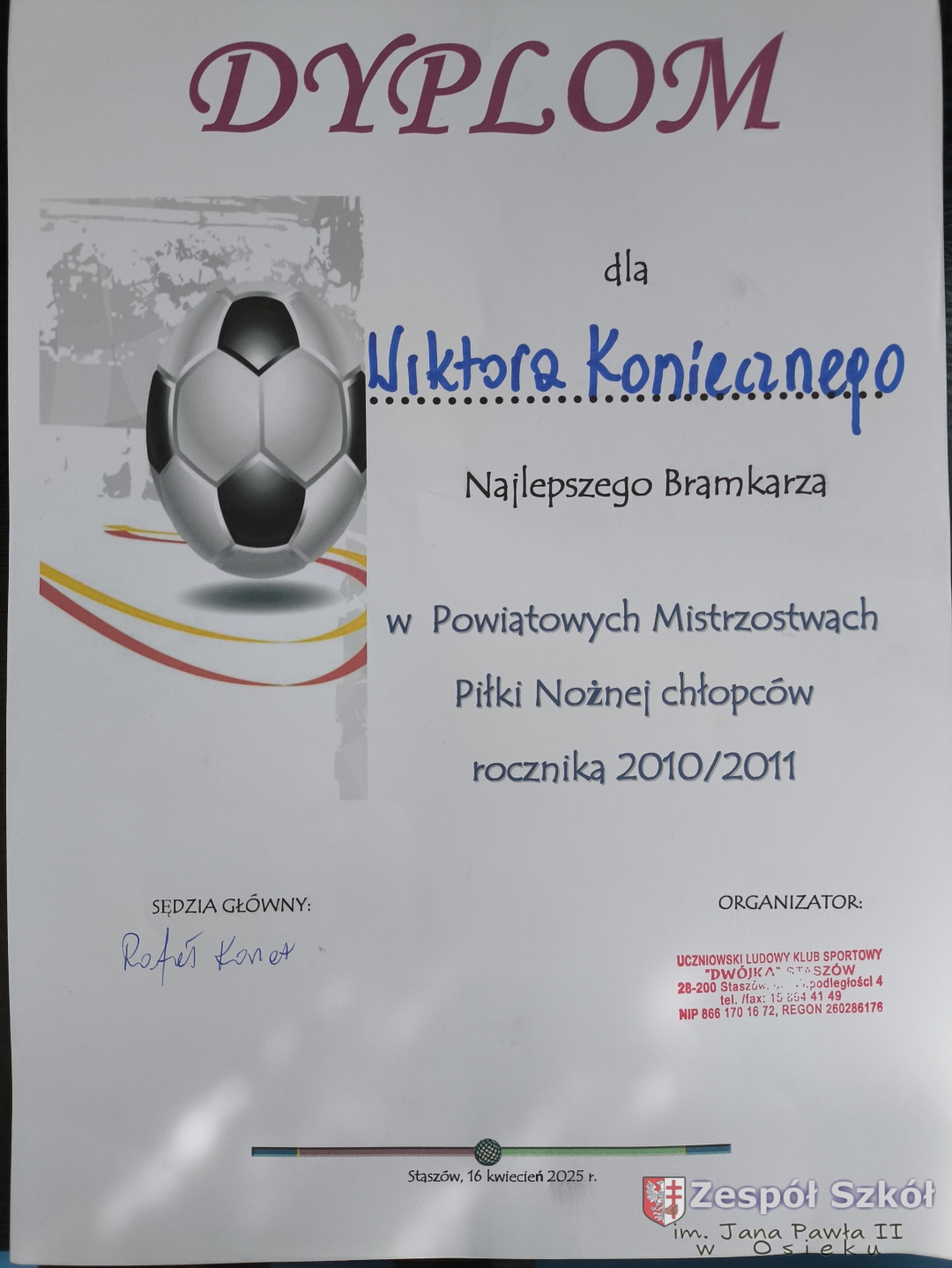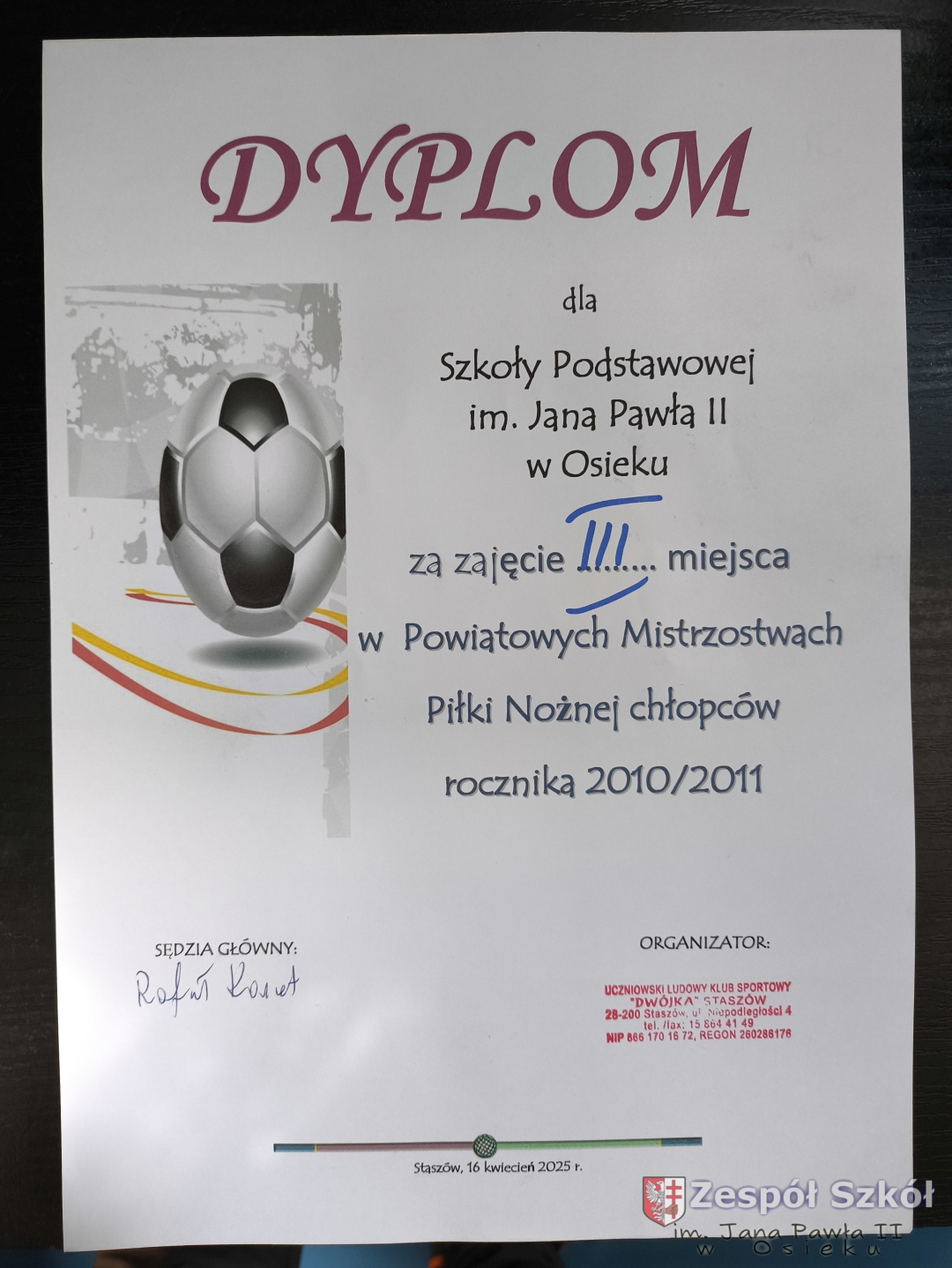 W dniu 16 kwietnia 2025 roku w Staszowie odbyły się Powiatowe Zawody Młodzieży Szkolnej w Piłce Nożnej Chłopców. W rywalizacji wzięli udział uczniowie Zespołu Szkół w Osieku, którzy po zaciętej walce zajęli zaszczytne III miejsce.