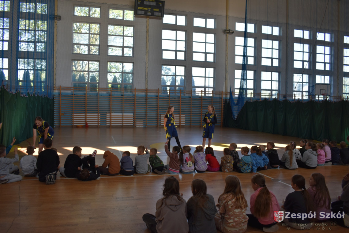 W ramach programu „Trzymaj formę” uczennice klasy VII: Wiktoria Baszak, Maria Wilk, Nadia Okoń, Lena Durda, Jessica Woźniak, Emilia Stępień, Oliwia Konieczna, Karolina Dobrowolska, przygotowały i poprowadziły układ taneczno-ruchowy oraz zabawy ruchowe dla młodszych kolegów i koleżanek z klas I-III oraz z klas IV-VIII.