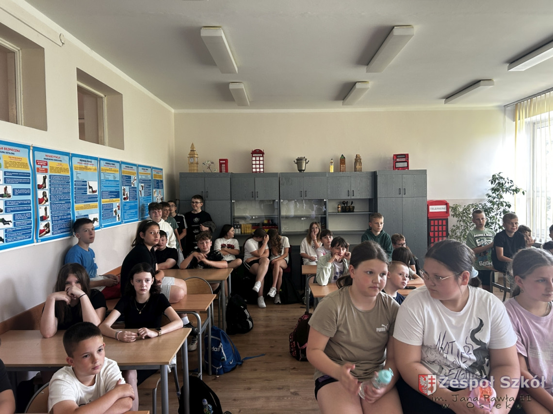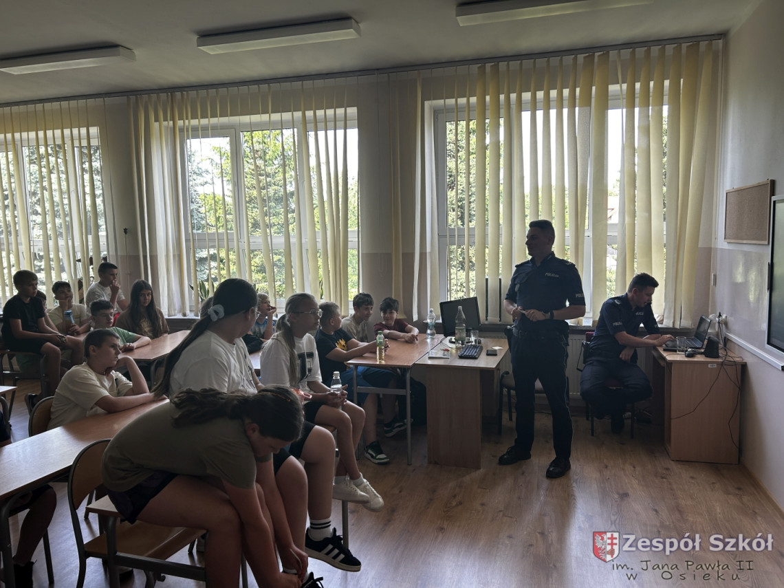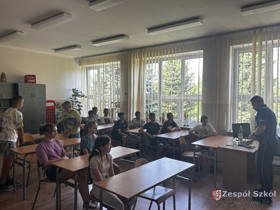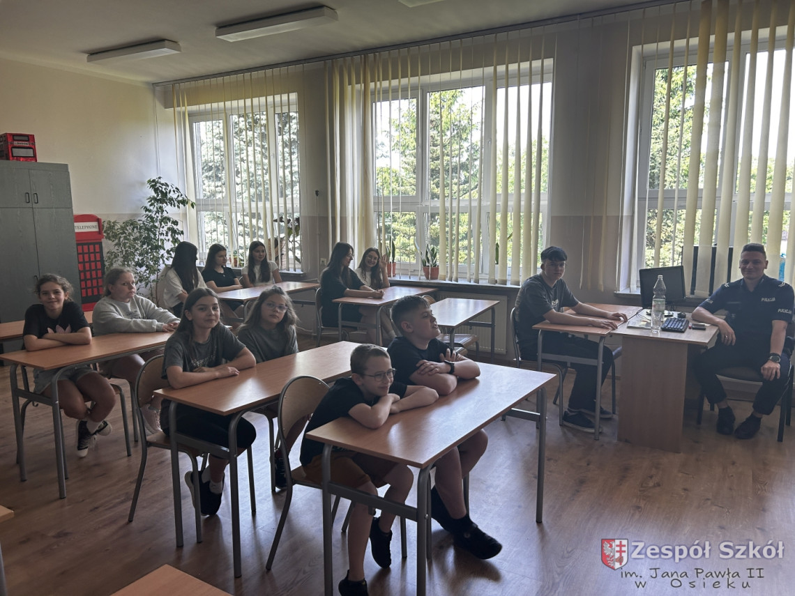 W związku ze zbliżającymi się wakacjami w naszej szkole w dniu 5 czerwca 2025 r. odbyło się spotkanie z dzielnicowymi z Posterunku Policji w Osieku nt „Bezpieczne wakacje”, w którym uczestniczyli uczniowie z klas I-VIII szkoły podstawowej i 3 klasy liceum. Celem spotkania było przypomnienie uczniom podstawowych zasad bezpiecznego zachowania się w czasie wakacji, uwrażliwienie na różne niebezpieczeństwa i zagrożenia oraz kształtowanie wyobraźni i myślenia przyczynowo-skutkowego. Policjanci zasygnalizowali, że wszyscy niezależnie od tego, gdzie spędzają wakacje, zobowiązani są do bezwzględnego przestrzegania podstawowych zasad bezpieczeństwa, a zachowanie zdrowego rozsądku pozwoli ograniczyć ryzyko przykrych sytuacji i zdarzeń.