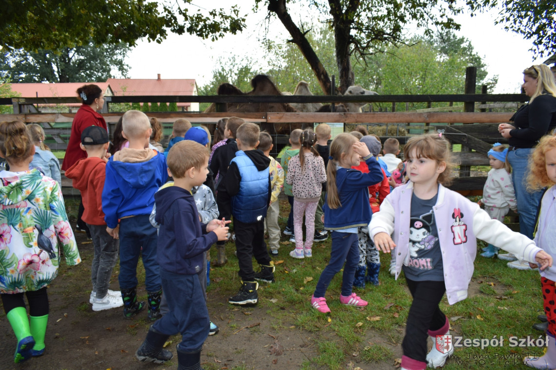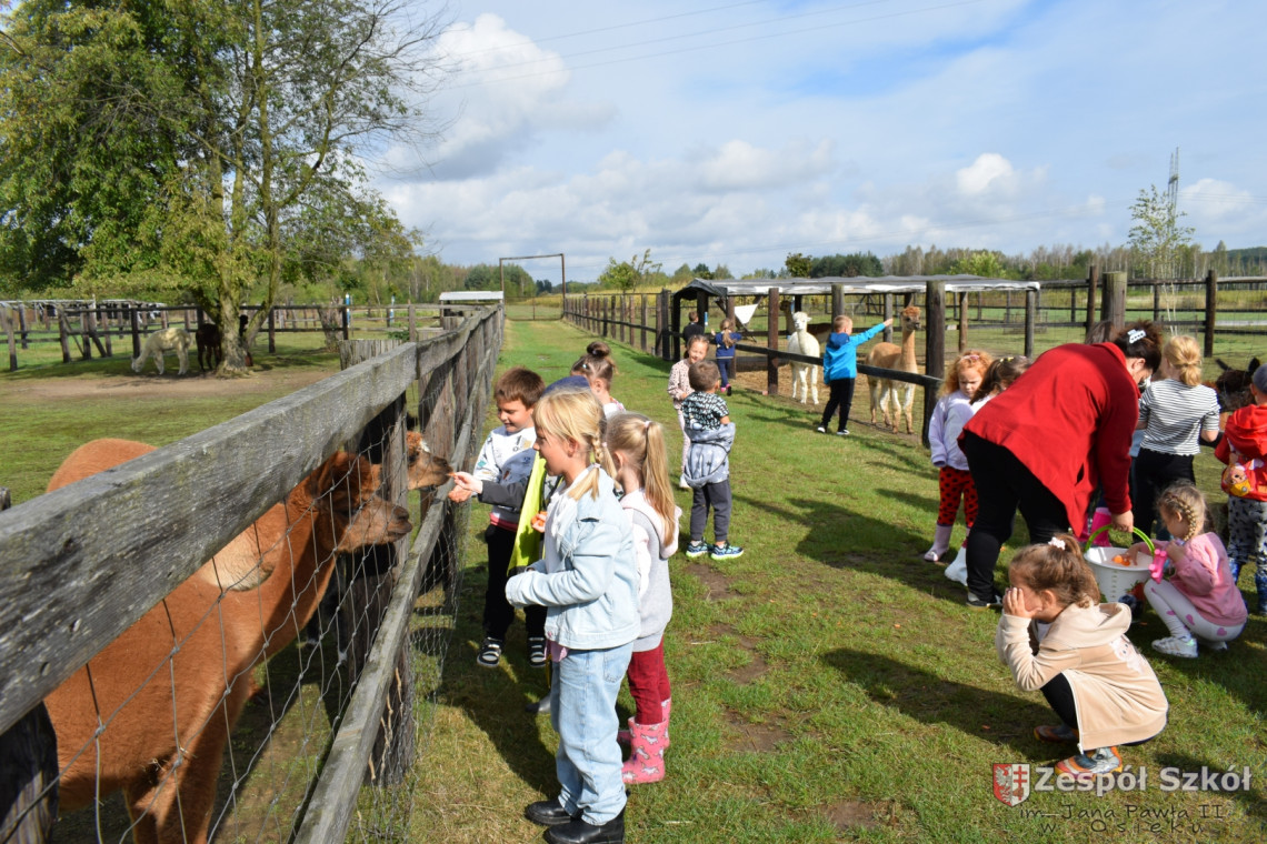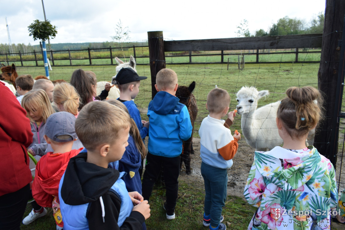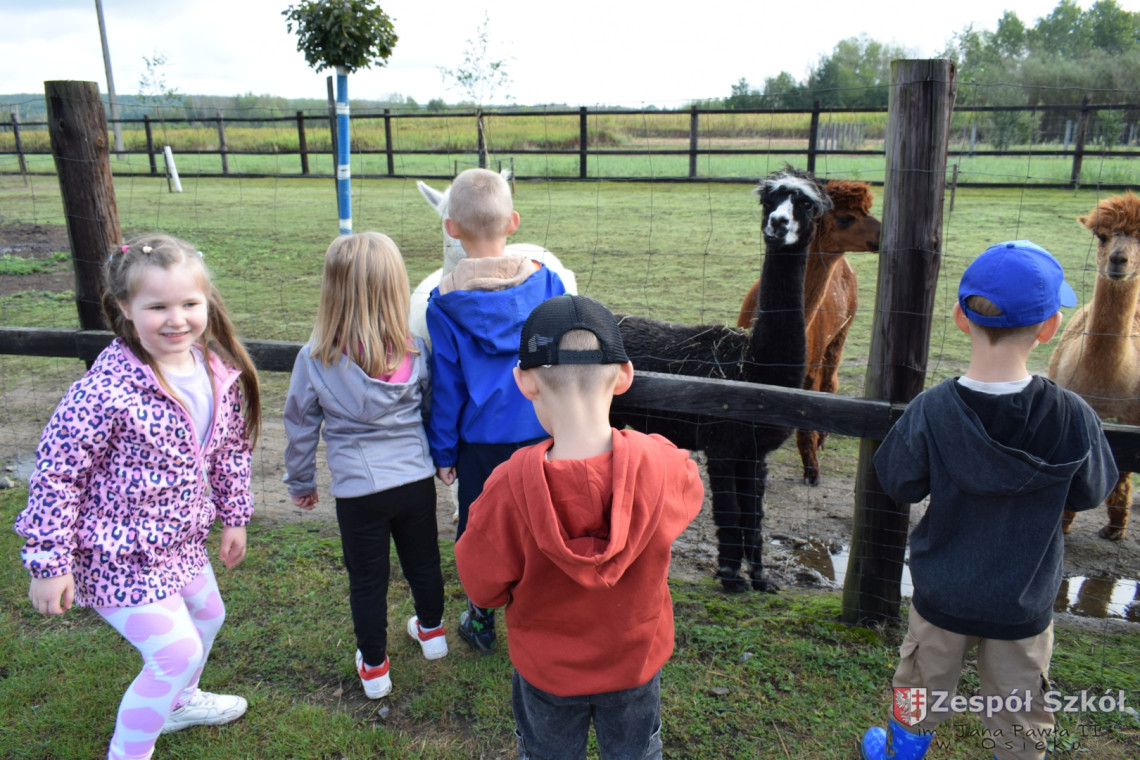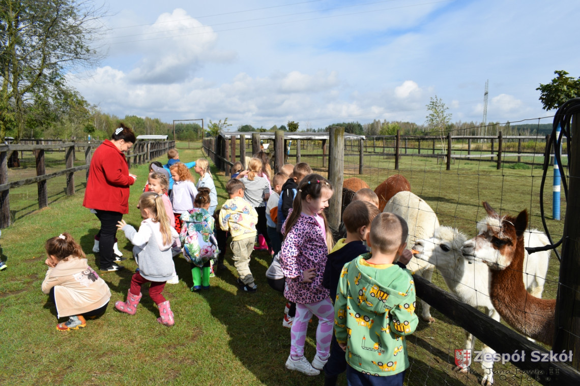 15 września  2025 r. dzieci z grupy 5 i 6 latki wraz                                             z wychowawczyniami: p. Anną Kos, p. Magdaleną Kos i p. Eweliną Mikus  pojechały na wycieczkę do "Ranczo Alpaki" w Woli Baranowskiej. Celem wycieczki było obcowanie z przyrodą ożywioną –zwierzętami mieszkających na ranczo, promowanie aktywnego i zdrowego stylu życia , aktywny wypoczynek na świeżym powietrzu, kształtowanie wrażliwości i szacunku do zwierząt. Przedszkolaki mogły zobaczyć: alpaki, kangury, kózki miniaturowe, kucyki, papugi, kanarki, surokatki, króliki, wielbłądy, strusie, wiewiórki, jeżozwierze, miniaturową krowę, kucyki, owieczki, kangury, strusie, czarne łabędzie, piękne pawie oraz kaczki. Dzieci mogły karmić i głaskać zwierzęta. Wiele  radości sprawiły dzieciom warsztaty rękodzielnicze, na których każde dziecko ozdabiało swoją alpakę, zabawy przy muzyce z animatorką i dmuchane atrakcje. Na zakończenie spotkania przedszkolaki otrzymały dyplomy "Przyjaciela alpak" i zjadły przepyszne kiełbaski z ogniska. To był dzień pełen wrażeń.