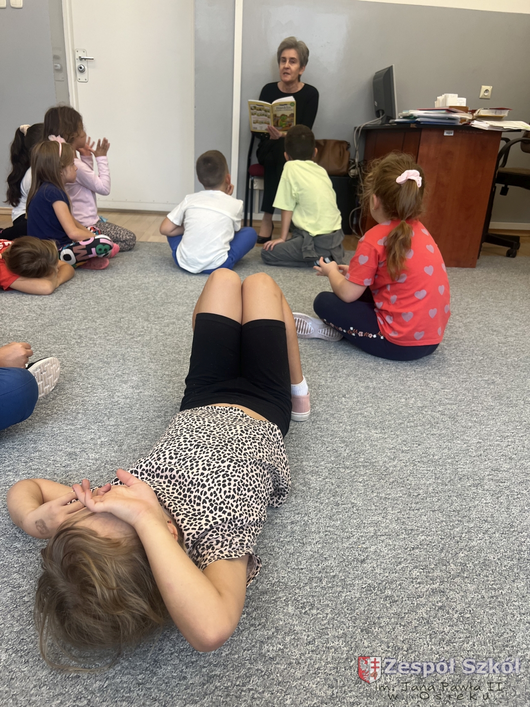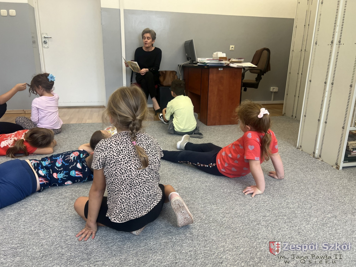 Na zakończenie wysłuchaliśmy bajki czytanej przez panią bibliotekarkę pt.” Franklin i książka z biblioteki”.  Wszyscy siedzieliśmy jak zaczarowani – tak cicho, że można było usłyszeć przewracane kartki.