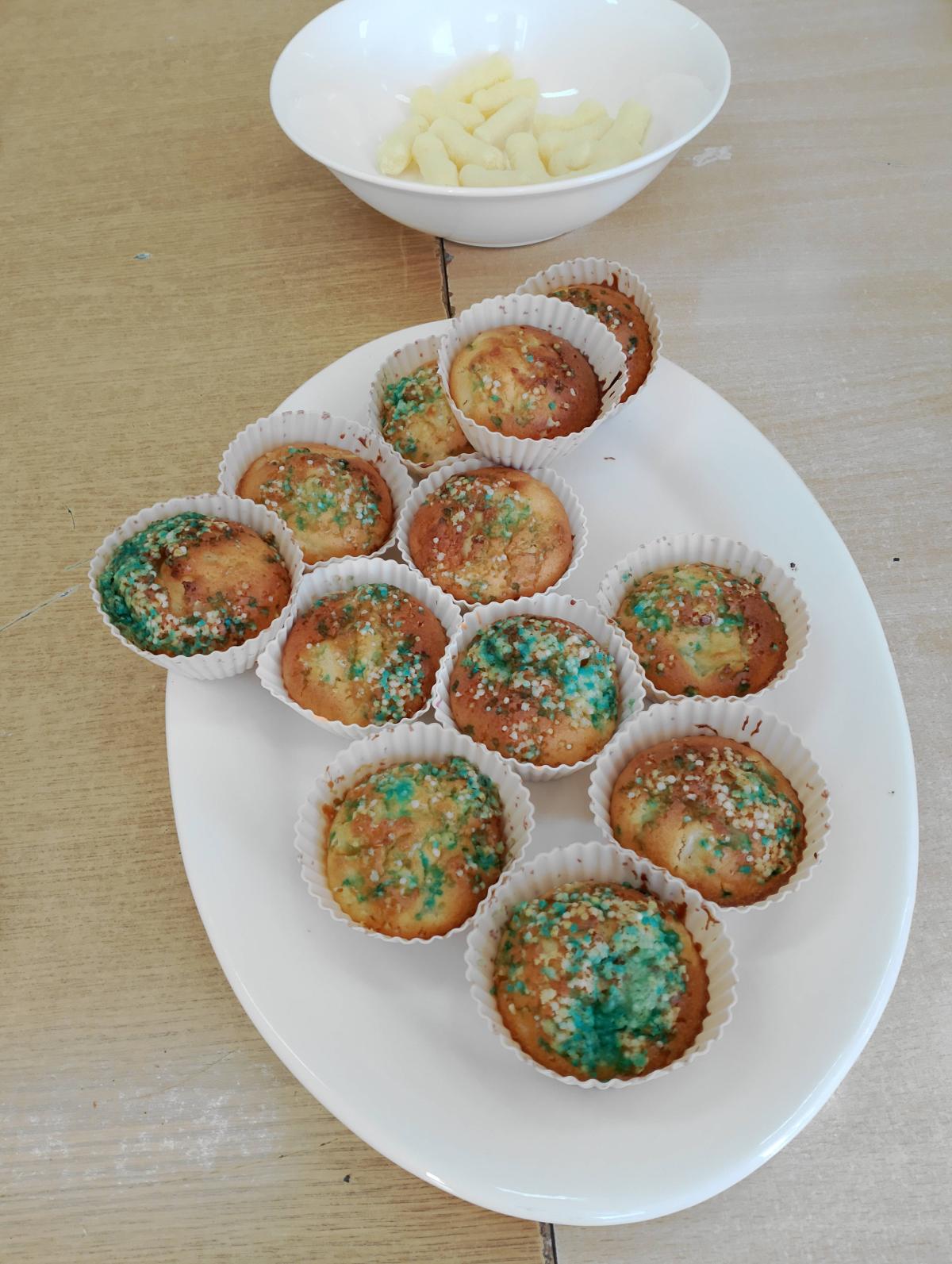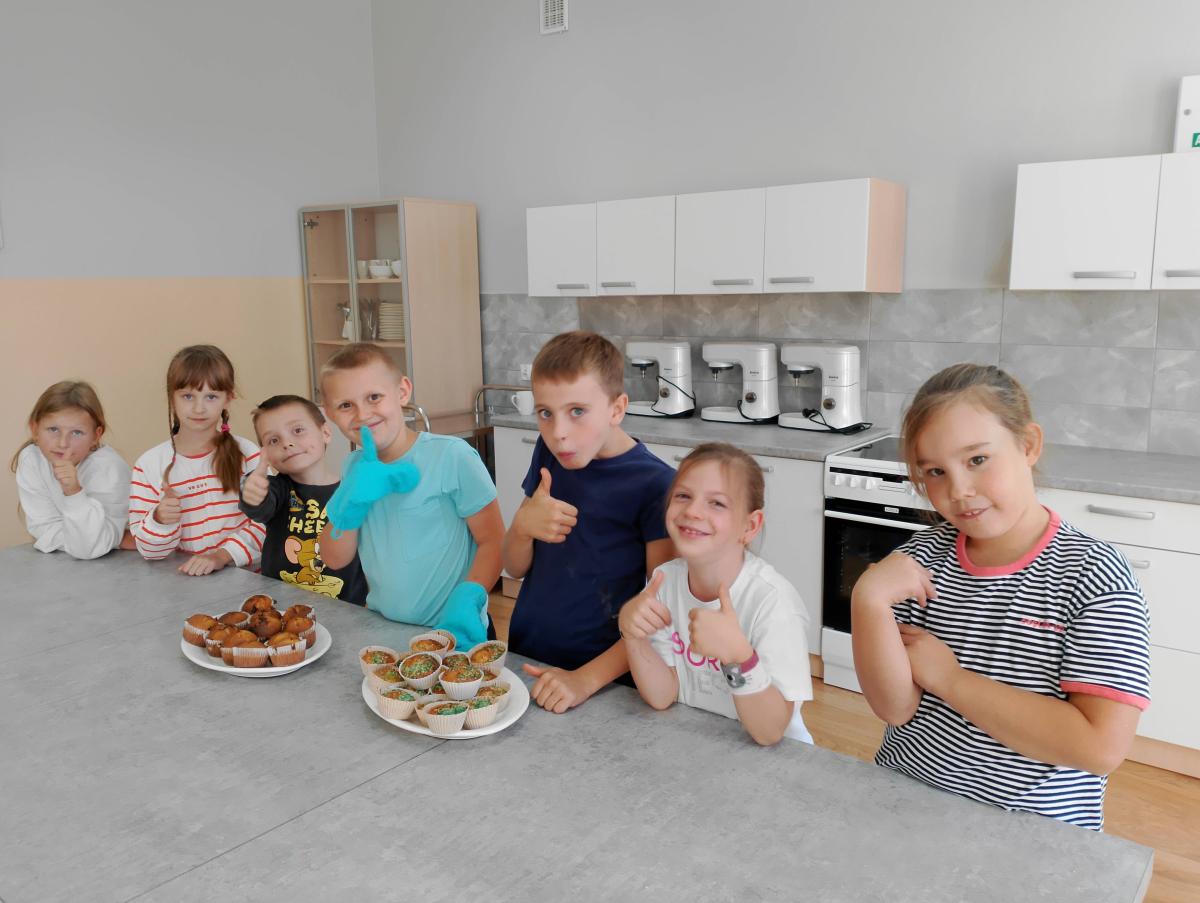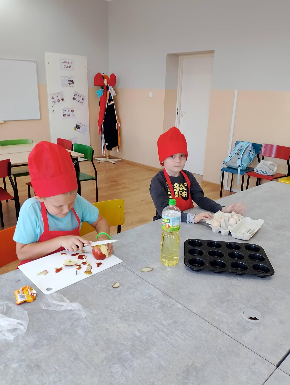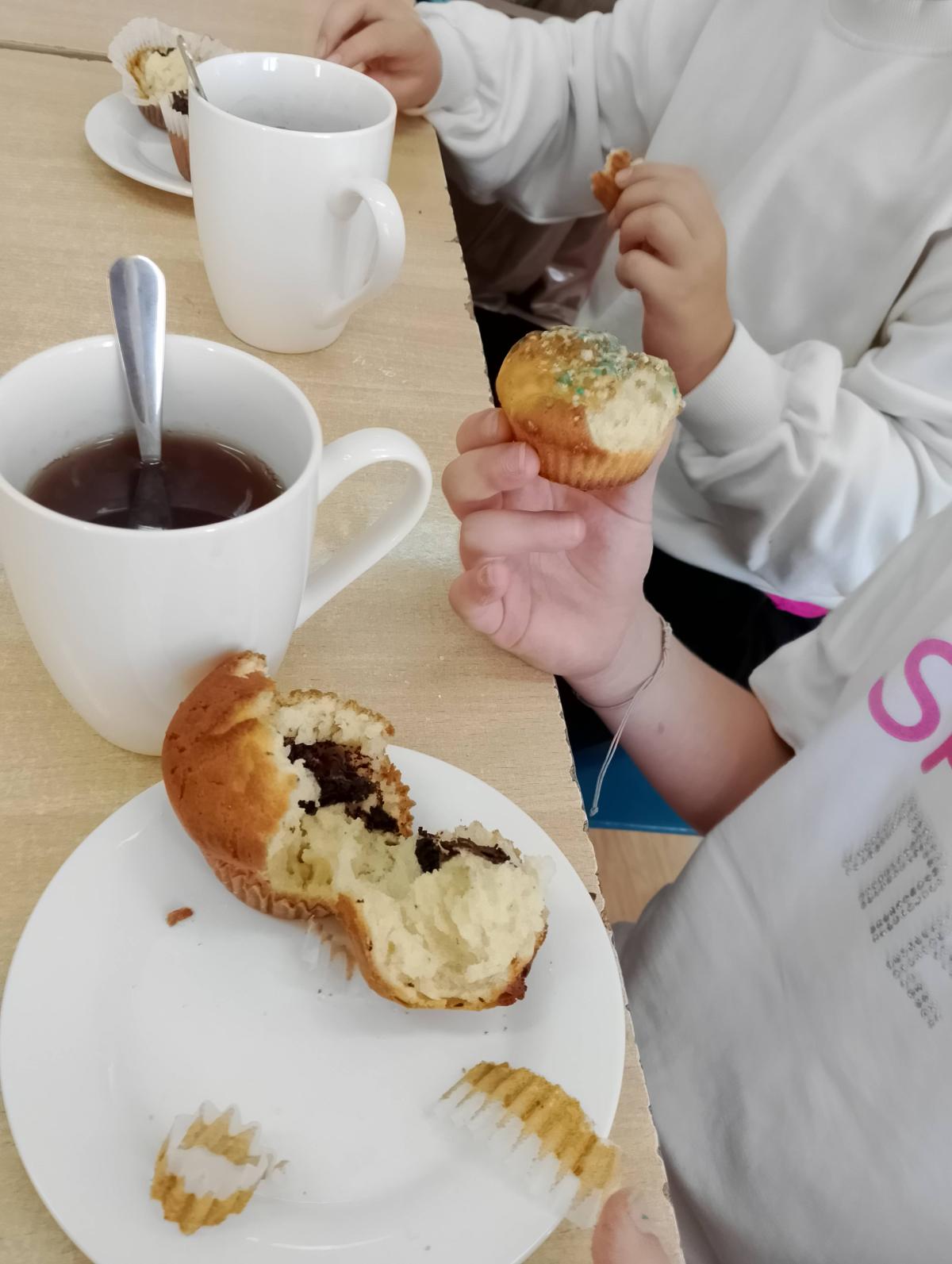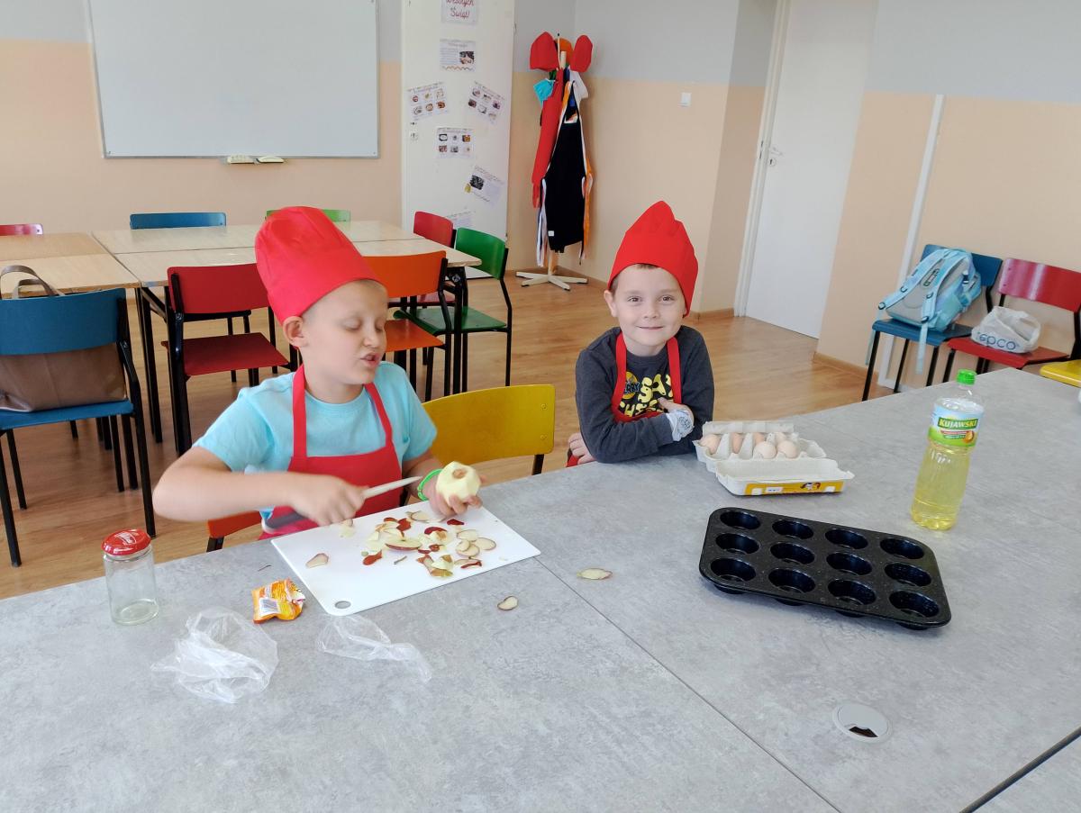 Uczniowie zrobili babeczki z ekologicznymi jabłkami przyniesionymi przez kolegę z własnego sadu ,a także babeczki z kawałkami gorzkiej czekolady. Po skończonej pracy wszyscy usiedli do wspólnego stołu i przy herbatce odbyła się degustacja oraz podsumowanie zajęć.