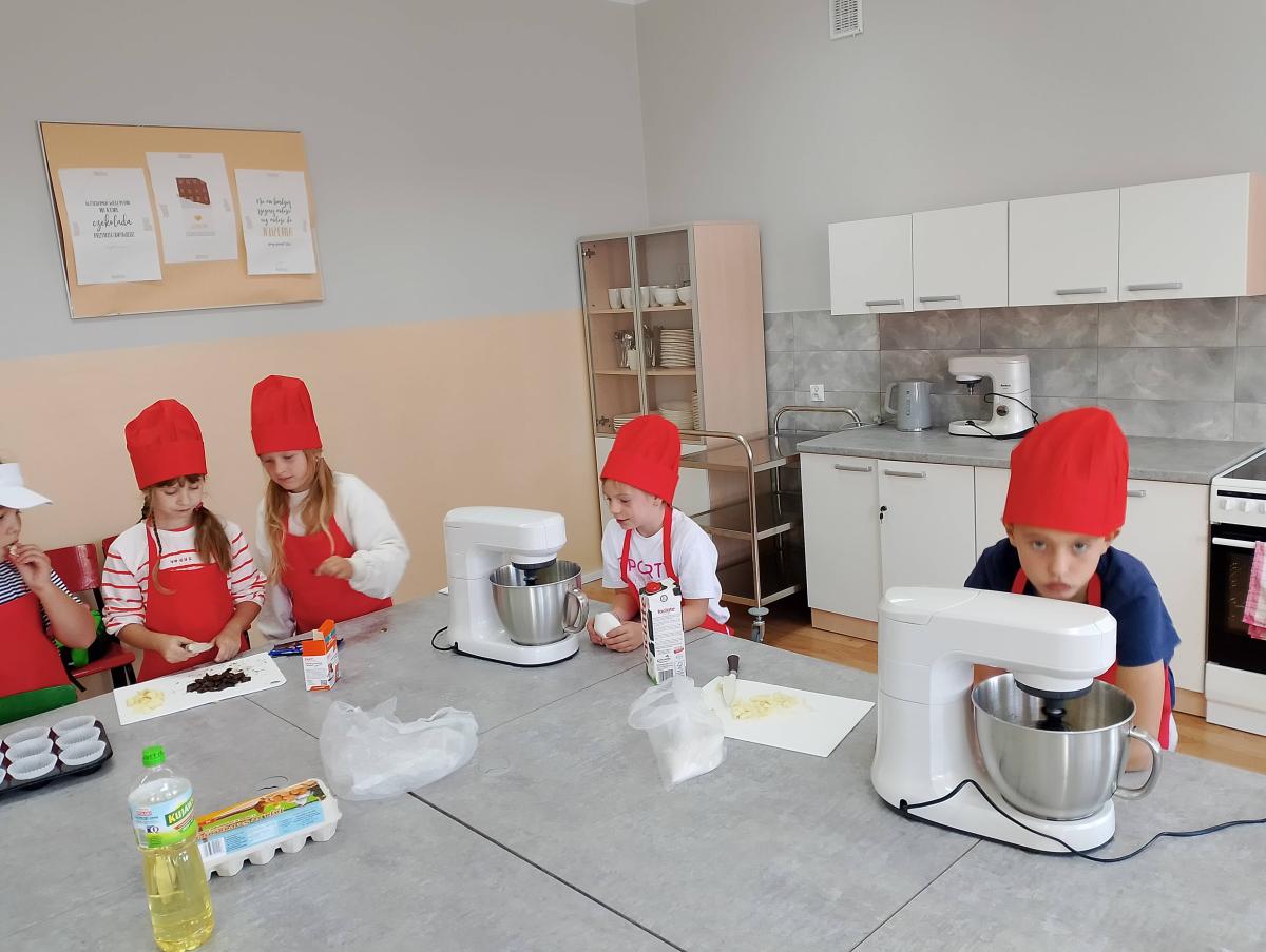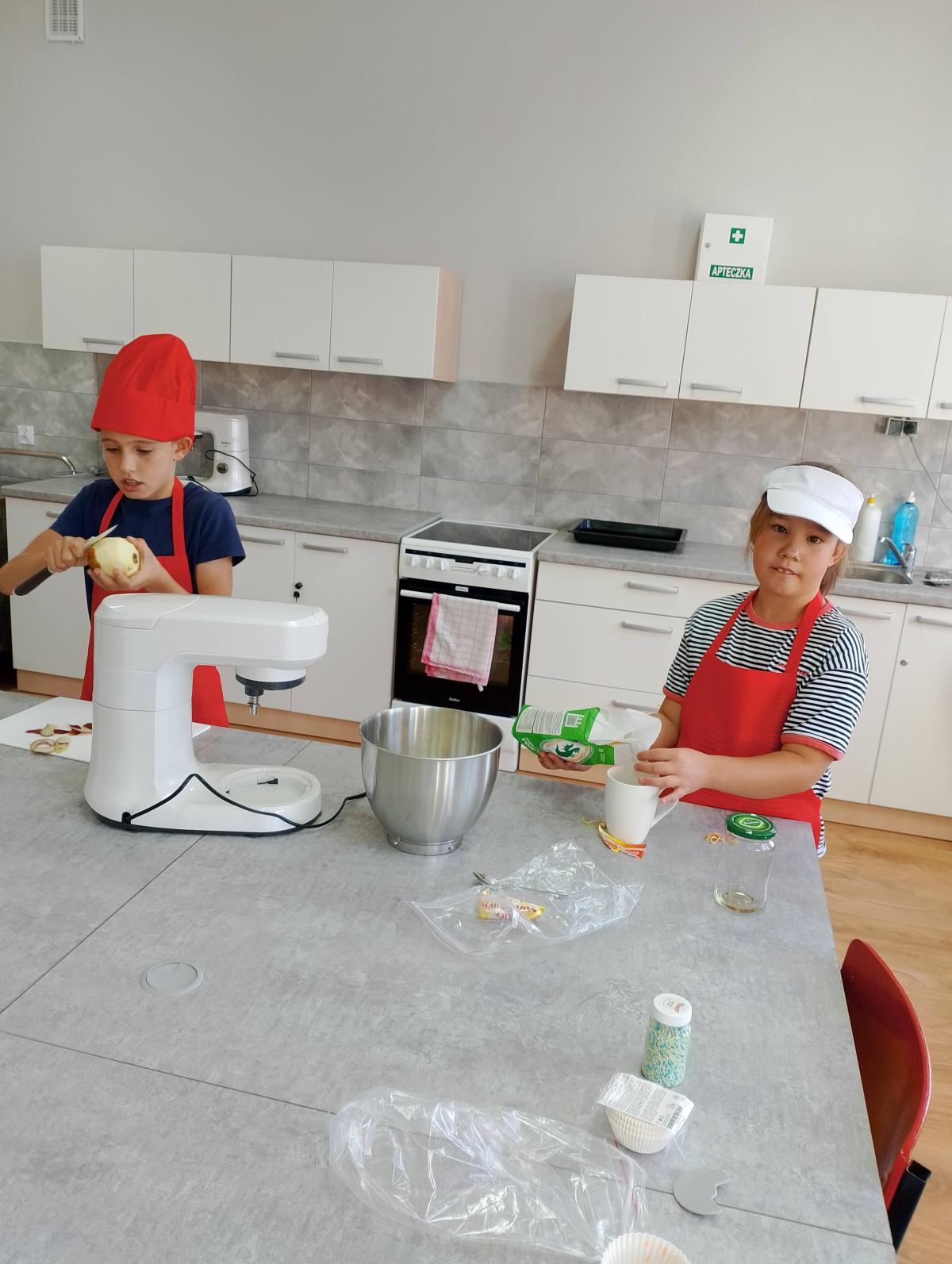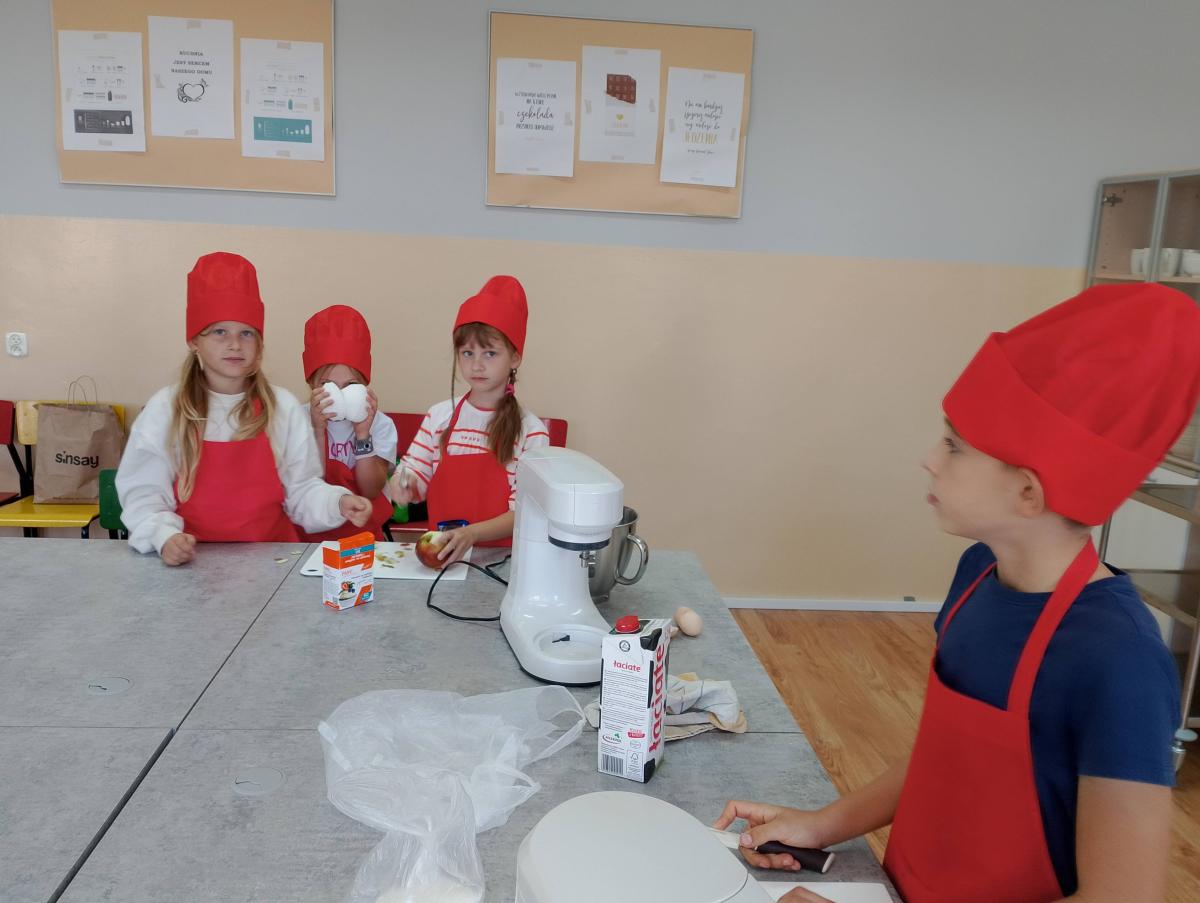 W dniu 25 września 2025r. uczniowie klasy II b w ramach dodatkowych zajęć  odbyli zajęcia w pracowni kulinarnej. Celem zajęć było rozwijanie zdolności kulinarnych wśród uczniów jak również stosowanie zdrowych produktów  takich jak  na przykład :mąka bezglutenowa, zamiennik cukru –erytrytol i inne. Lekcja miała na celu również zwiększenie świadomości  na temat prawidłowych nawyków żywieniowych i kształtowanie umiejętności współdziałania w zespole.