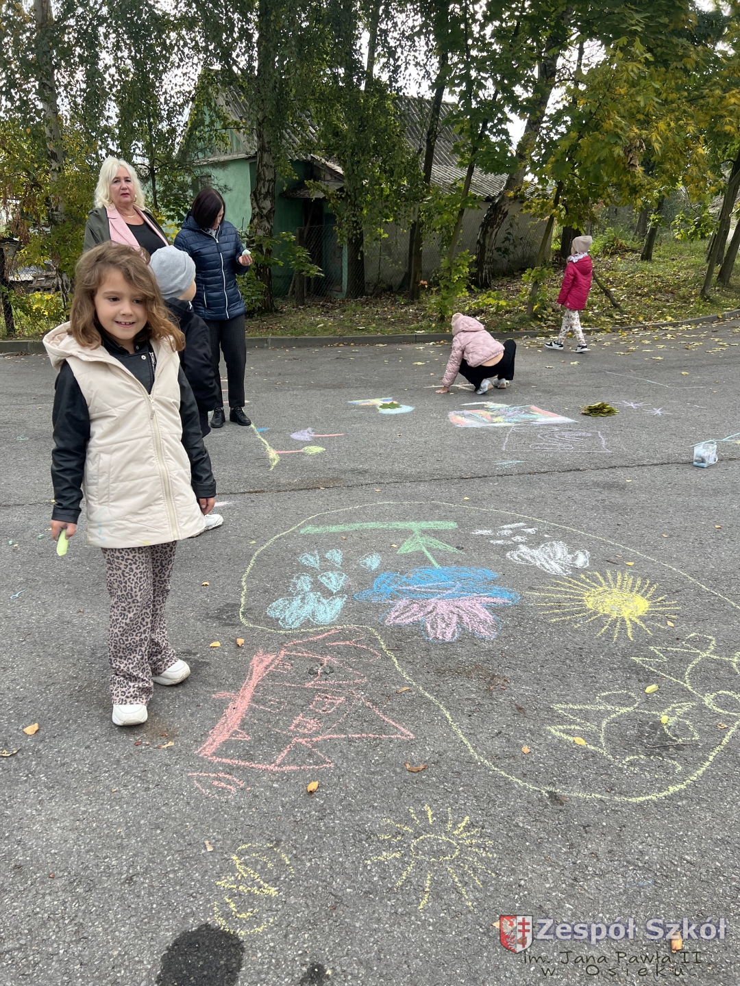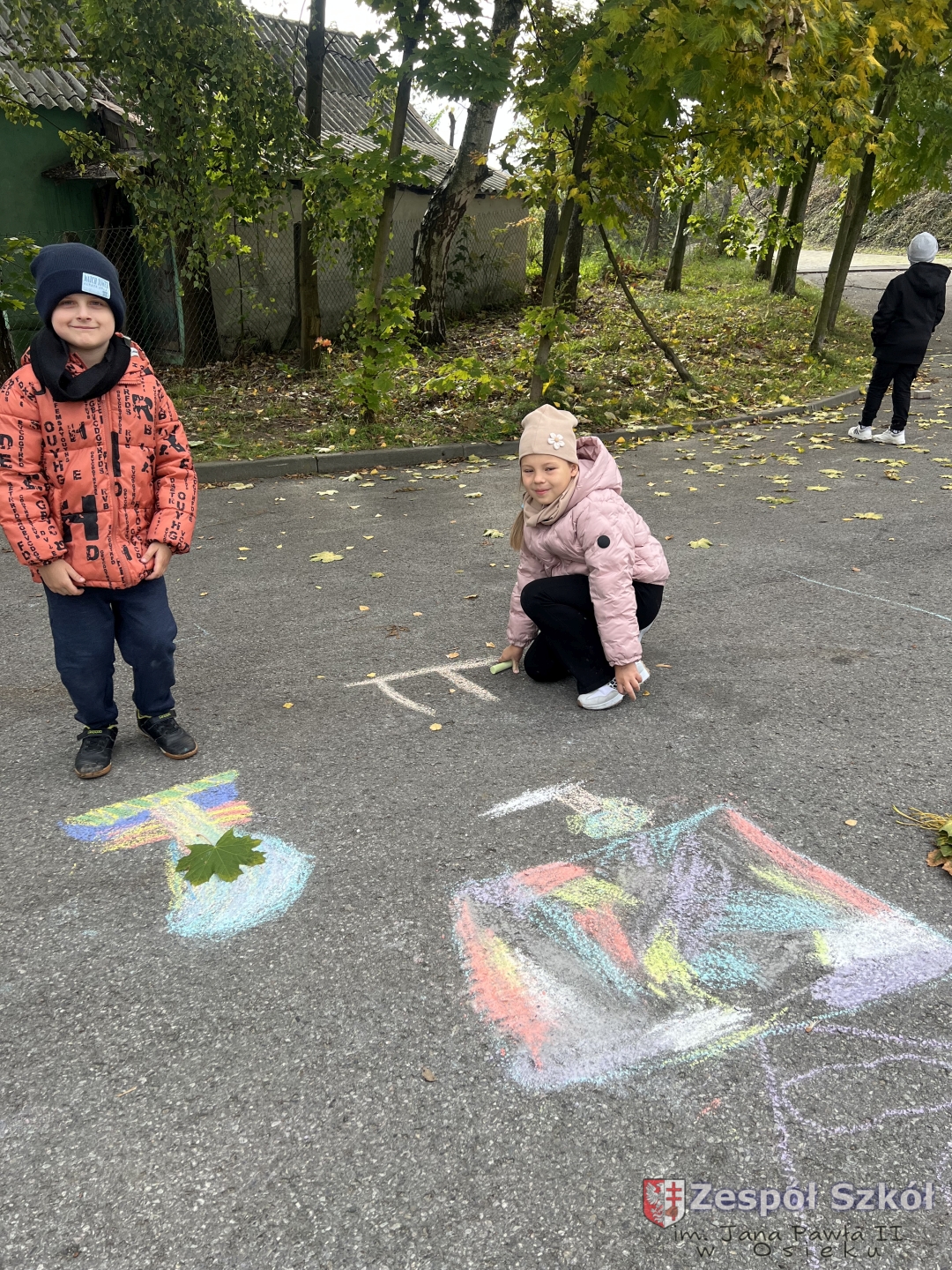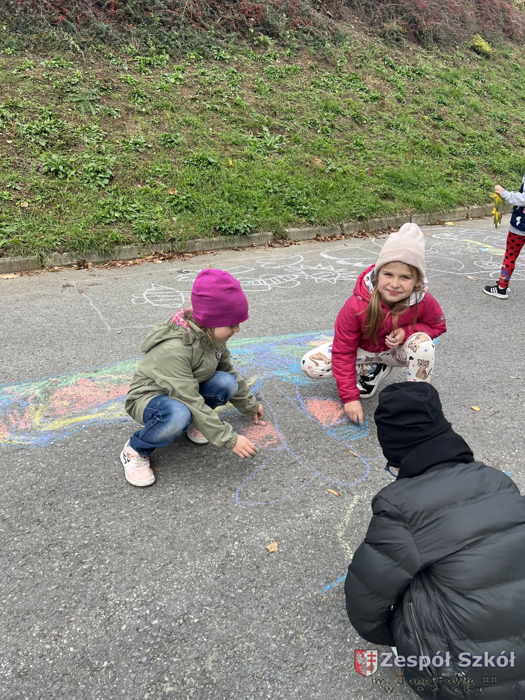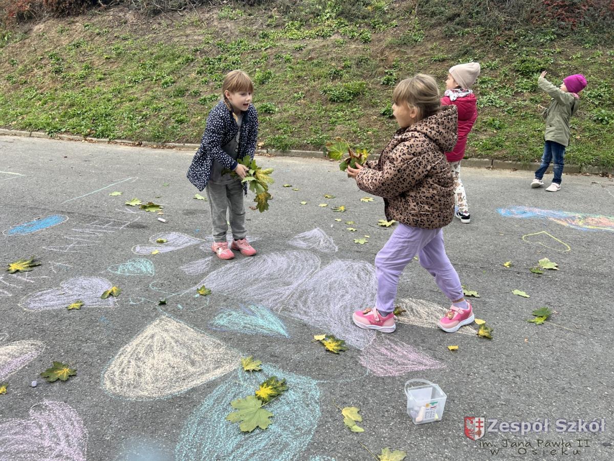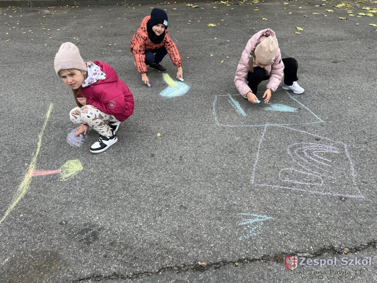 Pierwszym etapem zajęć w terenie było tworzenie kredowych obrazków. Uczniowie, inspirowani obserwacjami przyrody, tworzyli na chodniku kolorowe rysunki przedstawiające dary jesieni, drzewa w ciepłych barwach, spadające liście czy zwierzęta przygotowujące się do zimy. Działanie to pozwoliło dzieciom w twórczy sposób wyrazić swoje spostrzeżenia i emocje.