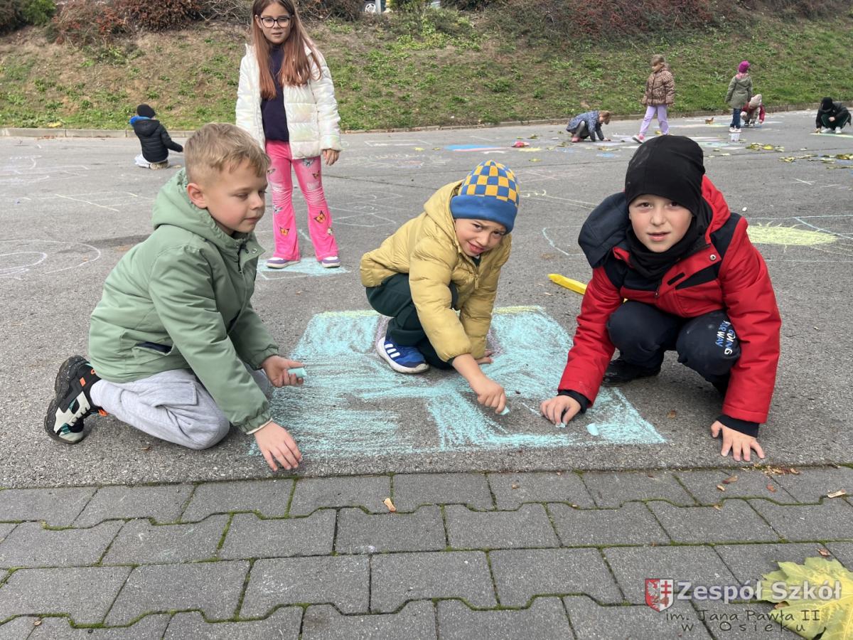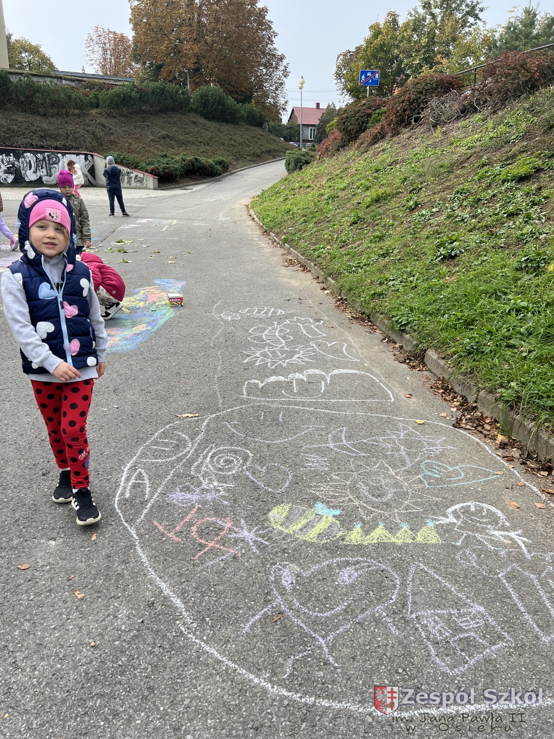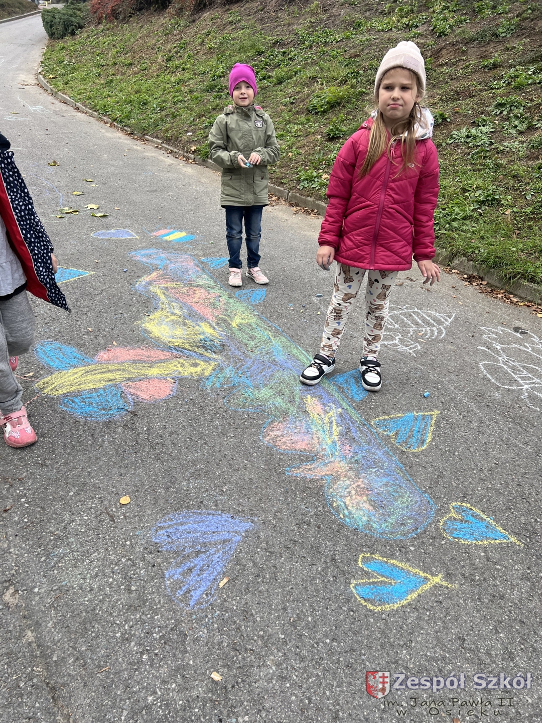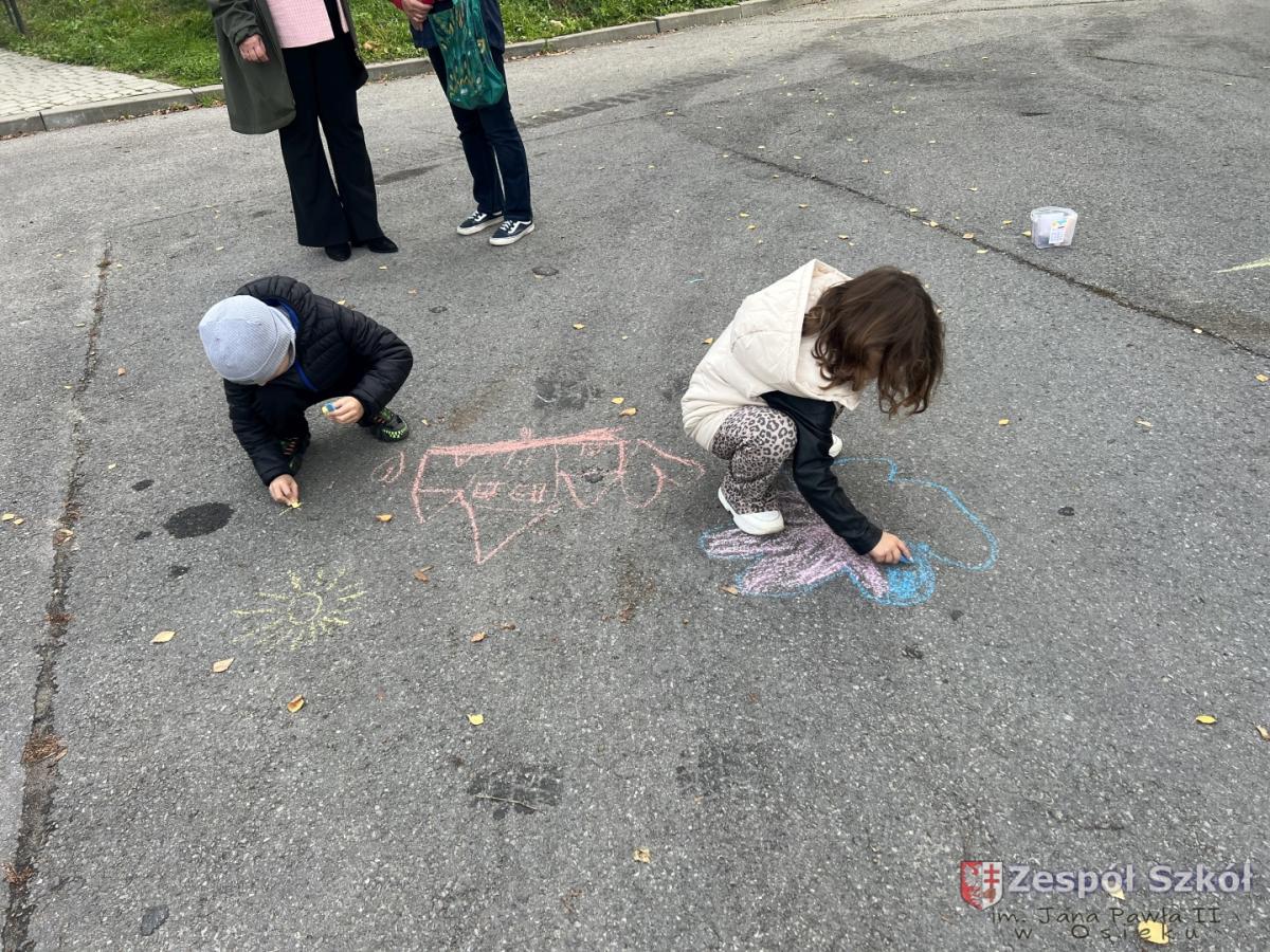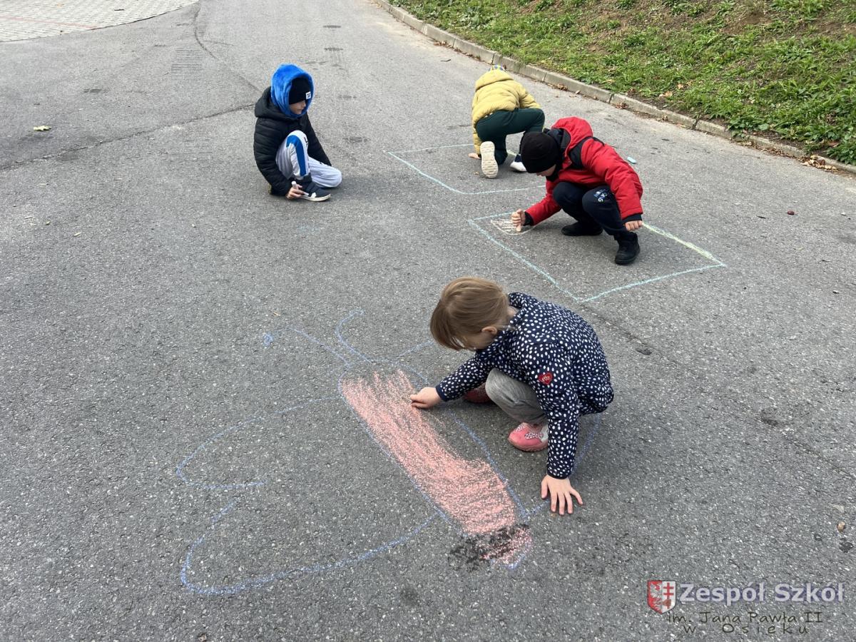 Pierwszym etapem zajęć w terenie było tworzenie kredowych obrazków. Uczniowie, inspirowani obserwacjami przyrody, tworzyli na chodniku kolorowe rysunki przedstawiające dary jesieni, drzewa w ciepłych barwach, spadające liście czy zwierzęta przygotowujące się do zimy. Działanie to pozwoliło dzieciom w twórczy sposób wyrazić swoje spostrzeżenia i emocje.