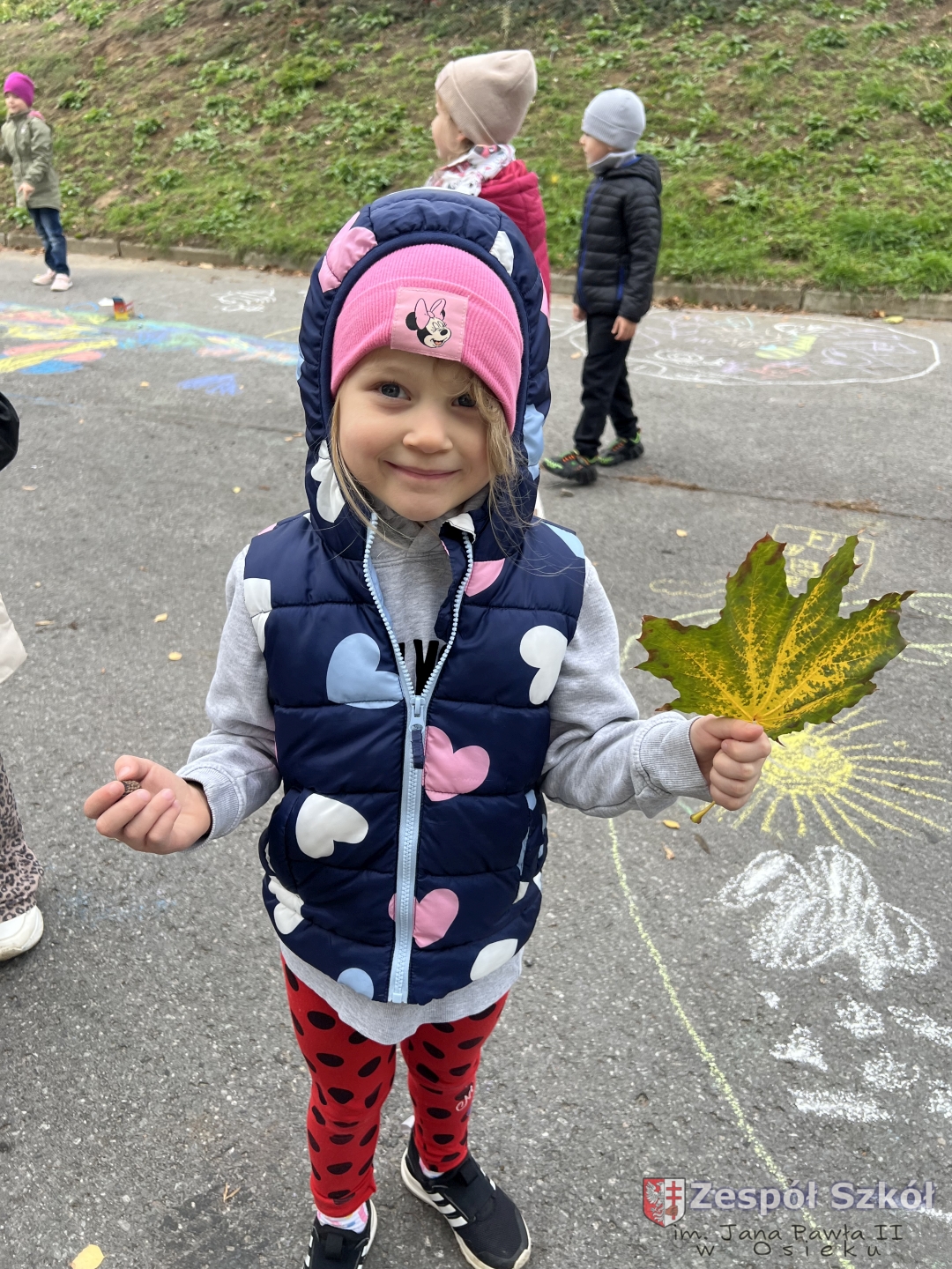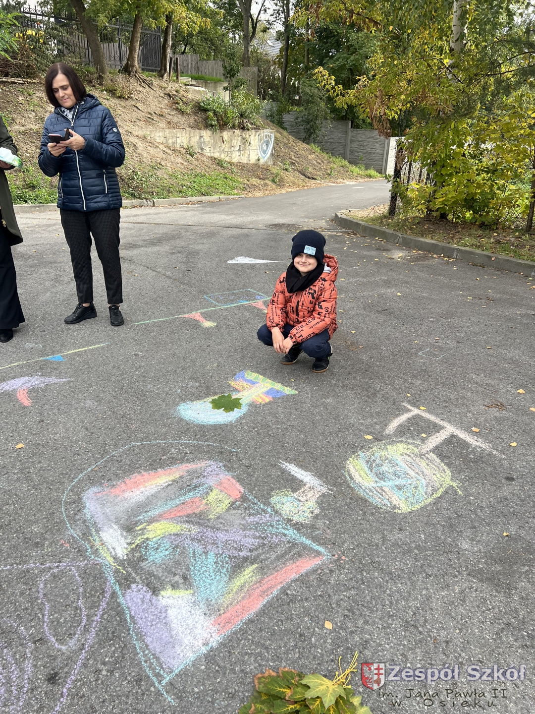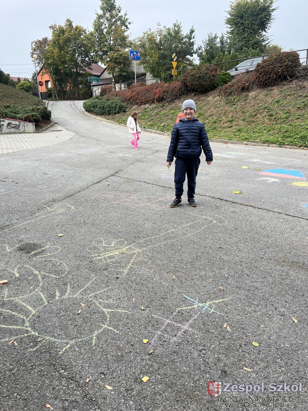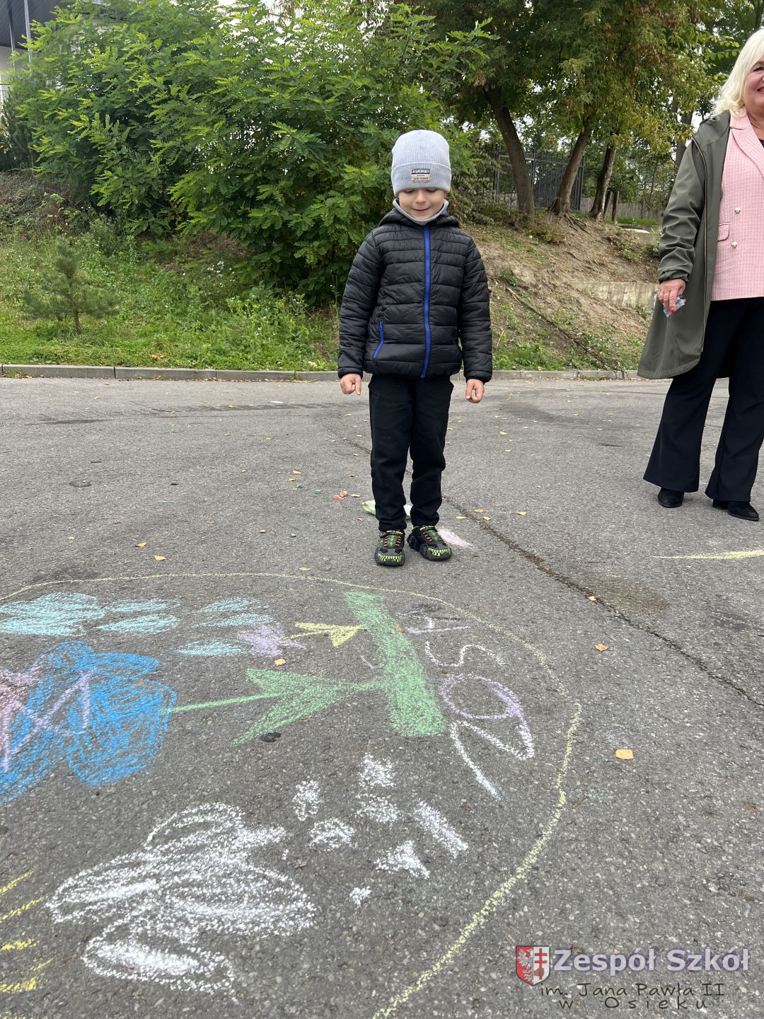 Pierwszym etapem zajęć w terenie było tworzenie kredowych obrazków. Uczniowie, inspirowani obserwacjami przyrody, tworzyli na chodniku kolorowe rysunki przedstawiające dary jesieni, drzewa w ciepłych barwach, spadające liście czy zwierzęta przygotowujące się do zimy. Działanie to pozwoliło dzieciom w twórczy sposób wyrazić swoje spostrzeżenia i emocje.