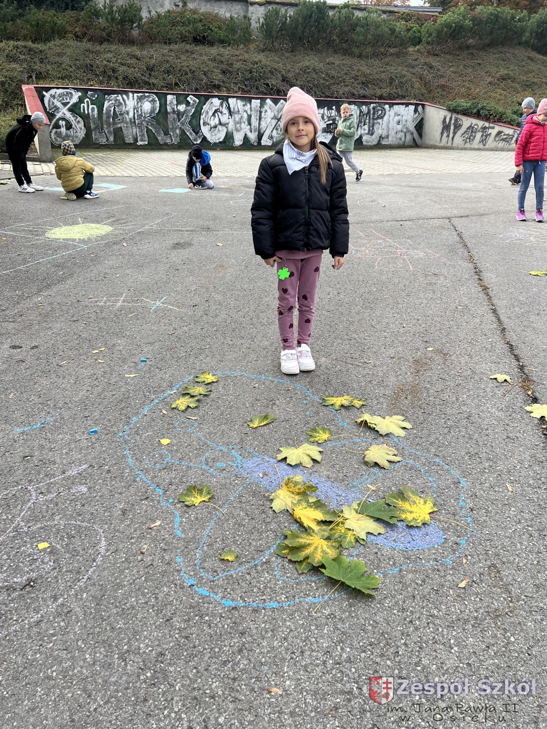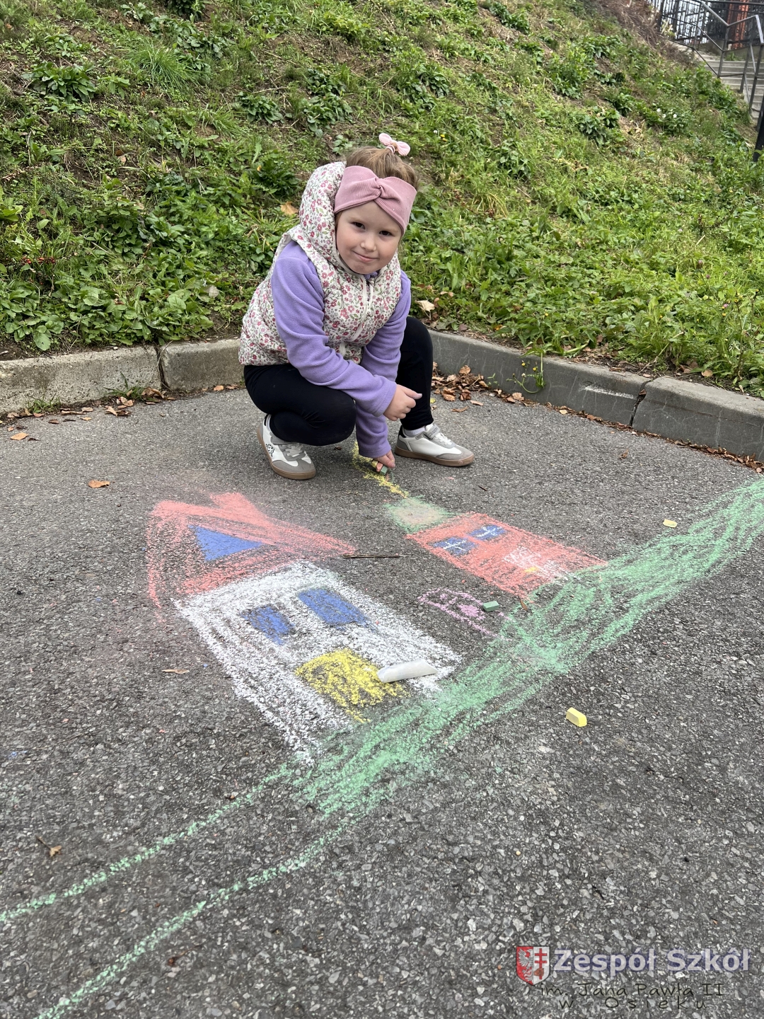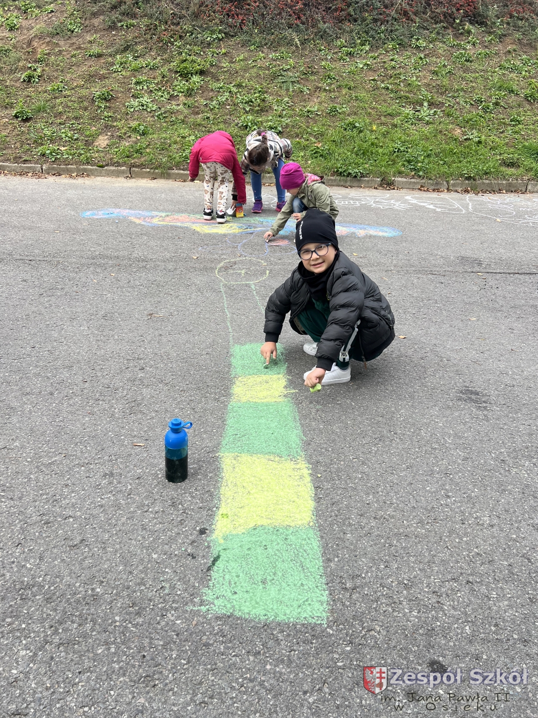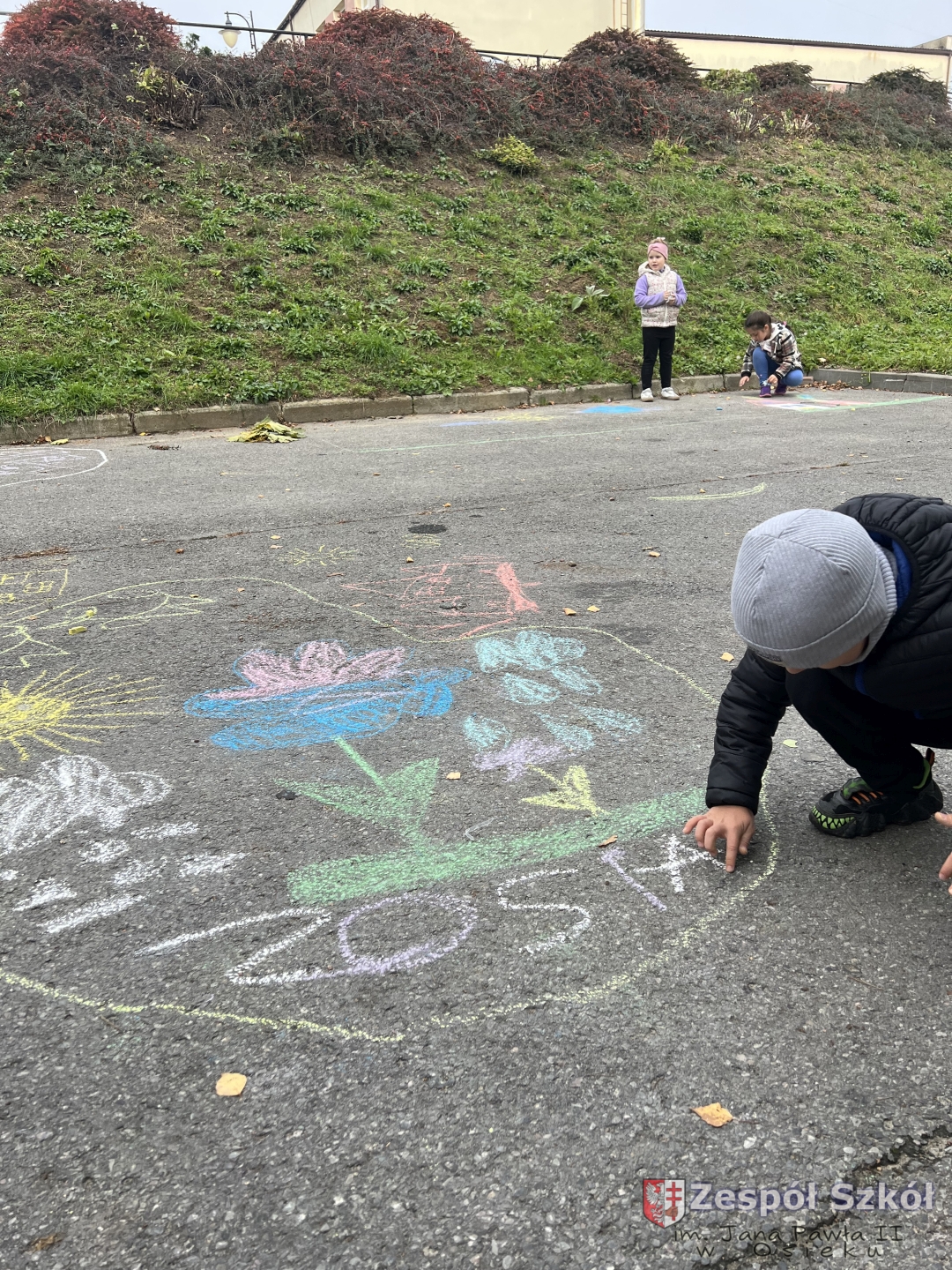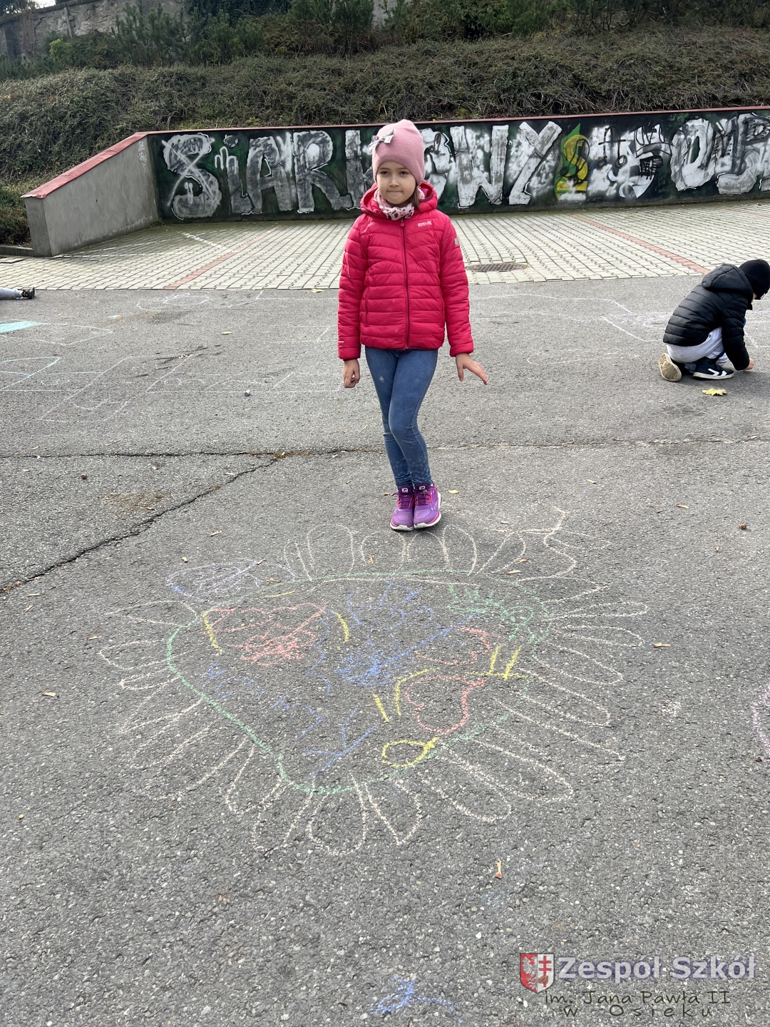 Pierwszym etapem zajęć w terenie było tworzenie kredowych obrazków. Uczniowie, inspirowani obserwacjami przyrody, tworzyli na chodniku kolorowe rysunki przedstawiające dary jesieni, drzewa w ciepłych barwach, spadające liście czy zwierzęta przygotowujące się do zimy. Działanie to pozwoliło dzieciom w twórczy sposób wyrazić swoje spostrzeżenia i emocje.