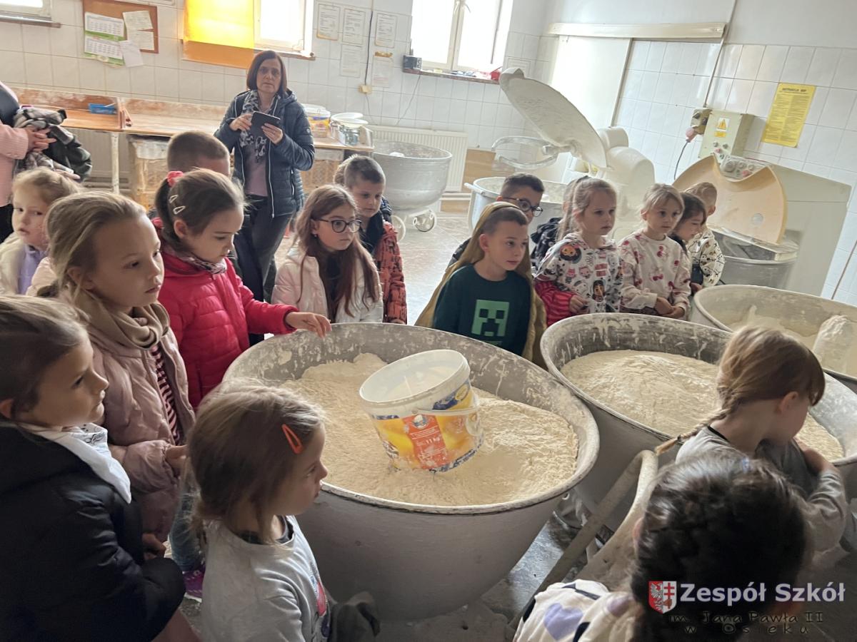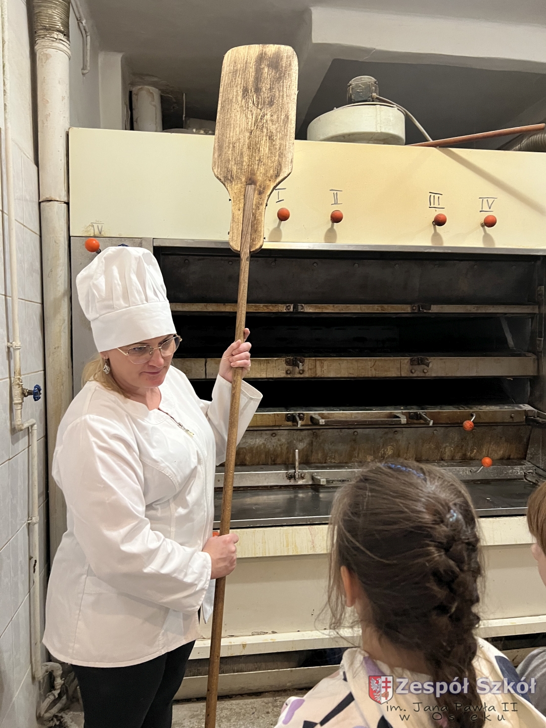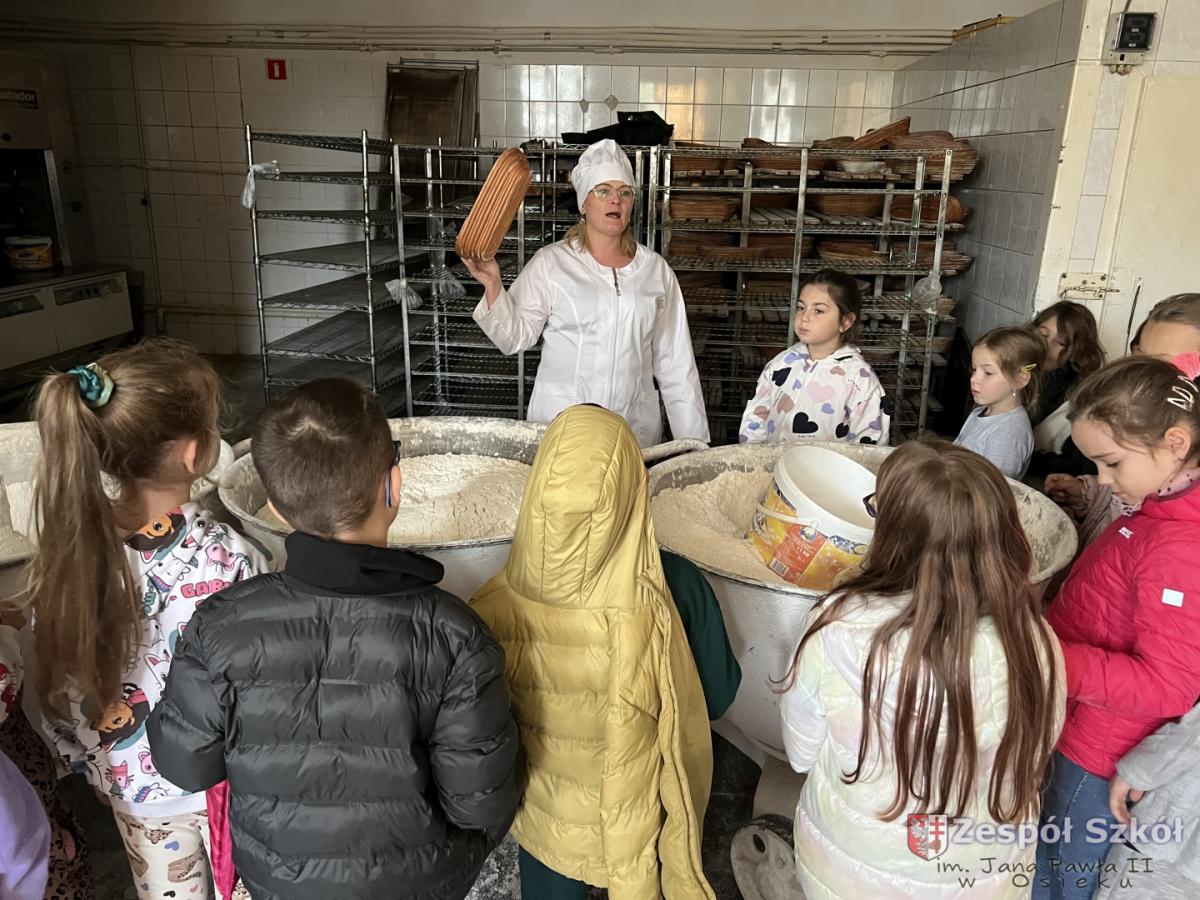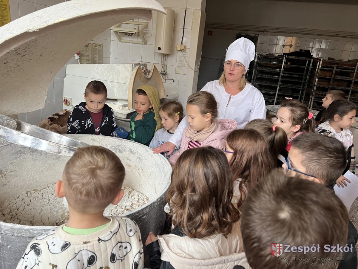 Kolejnym punktem wycieczki była wizyta w lokalnej „Piekarni Rogala”, gdzie uczniowie mieli okazję poznać proces powstawania pieczywa — od przygotowania ciasta po wypiek pachnących bochenków chleba. Dzieci z dużym zainteresowaniem słuchały pani Basi, zadawały pytania i z ciekawością przyglądały się urządzeniom używanym w piekarni. Na zakończenie wizyty każdy uczeń mógł spróbować świeżo upieczonego chleba, co wzbudziło wiele radości i pozytywnych emocji.