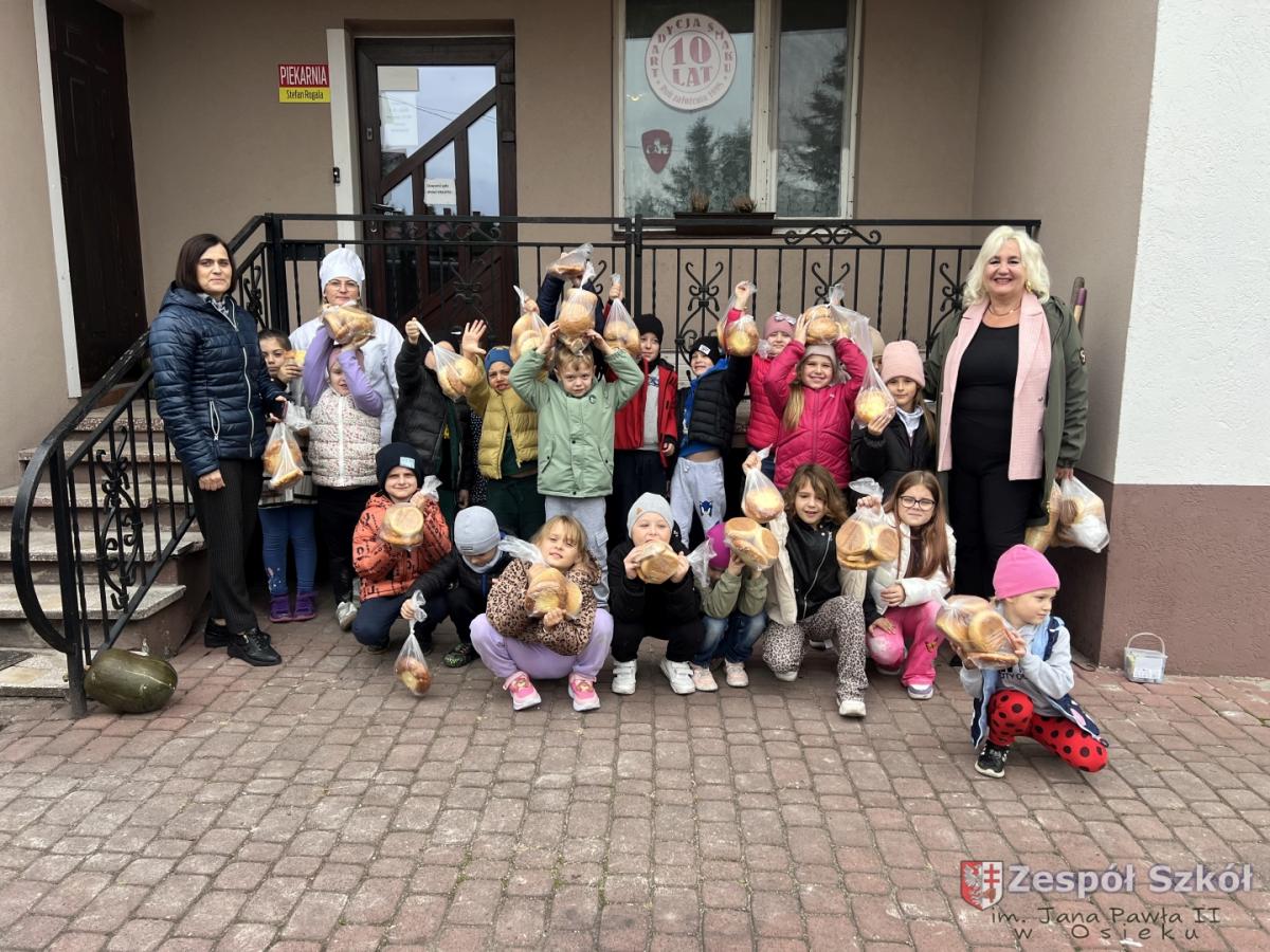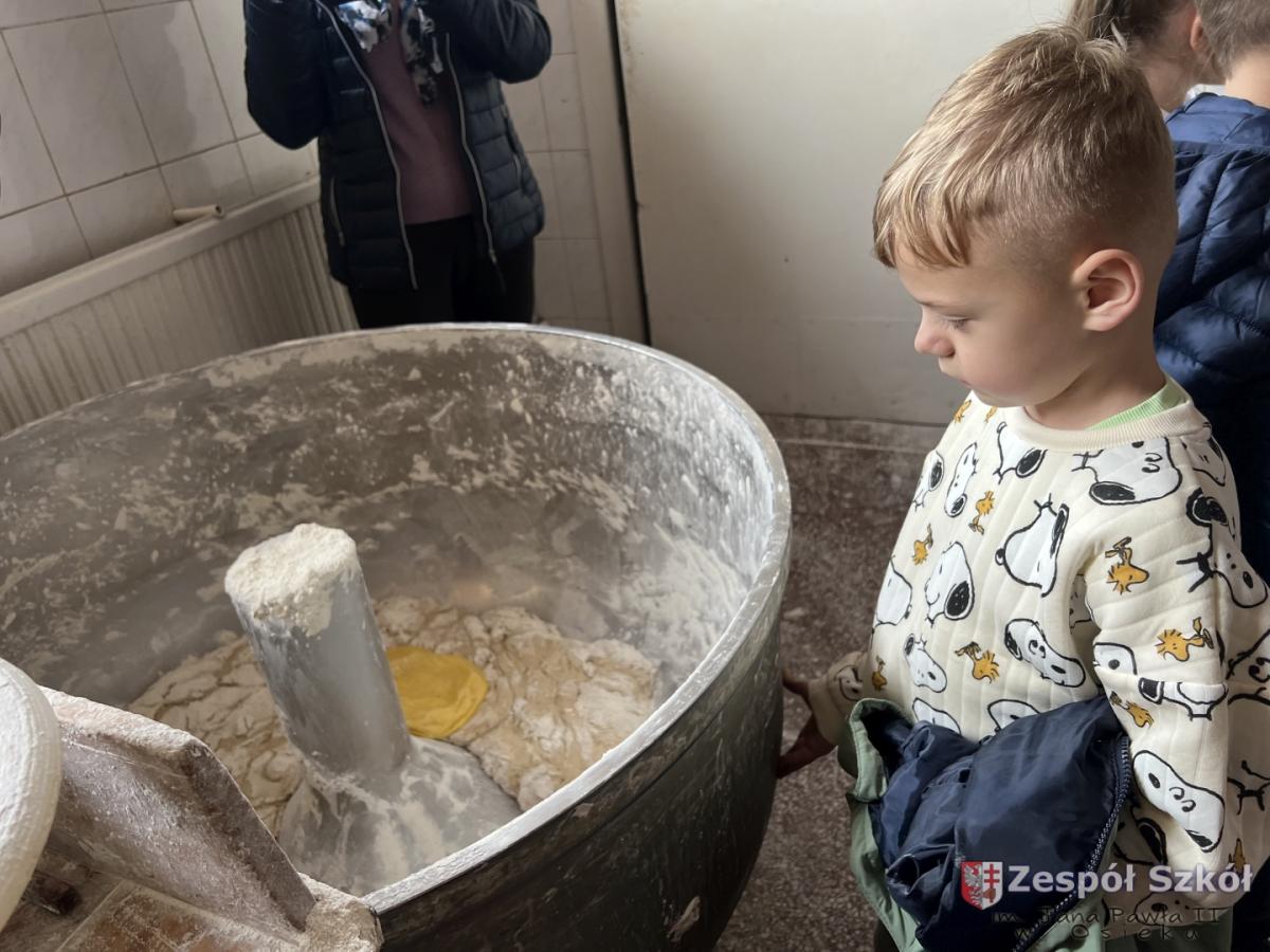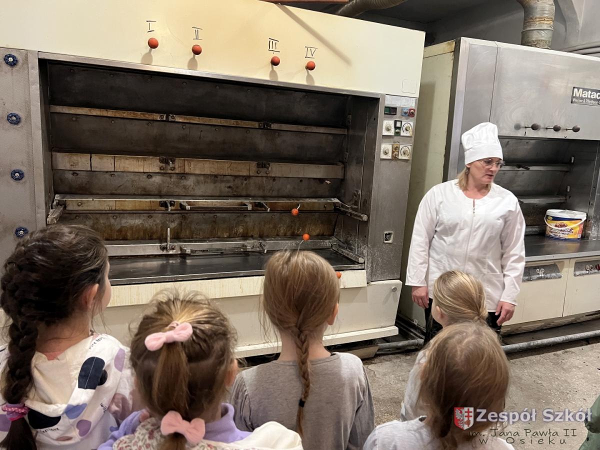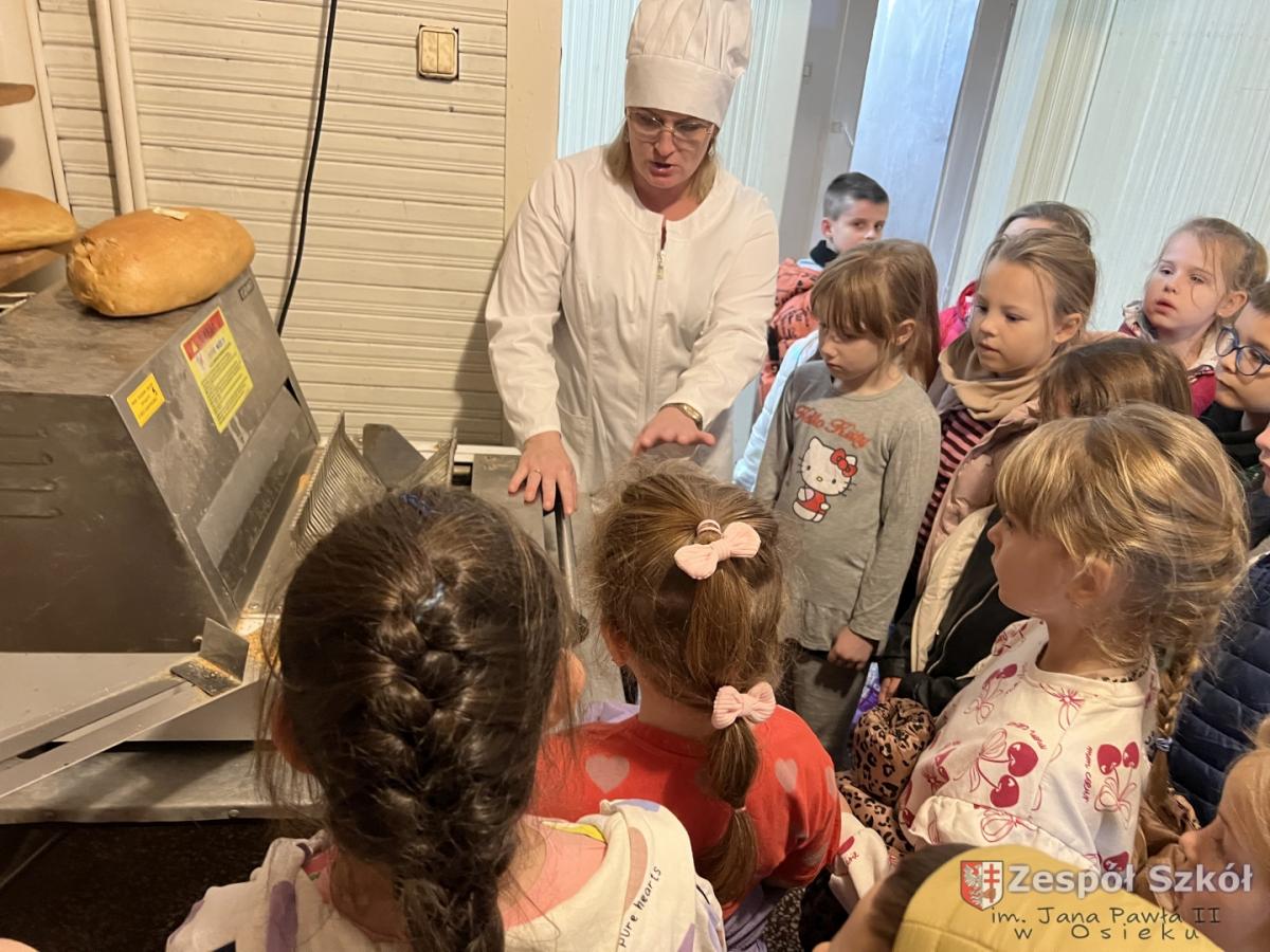 Kolejnym punktem wycieczki była wizyta w lokalnej „Piekarni Rogala”, gdzie uczniowie mieli okazję poznać proces powstawania pieczywa — od przygotowania ciasta po wypiek pachnących bochenków chleba. Dzieci z dużym zainteresowaniem słuchały pani Basi, zadawały pytania i z ciekawością przyglądały się urządzeniom używanym w piekarni. Na zakończenie wizyty każdy uczeń mógł spróbować świeżo upieczonego chleba, co wzbudziło wiele radości i pozytywnych emocji.