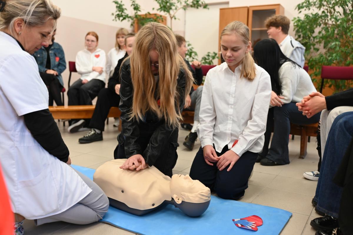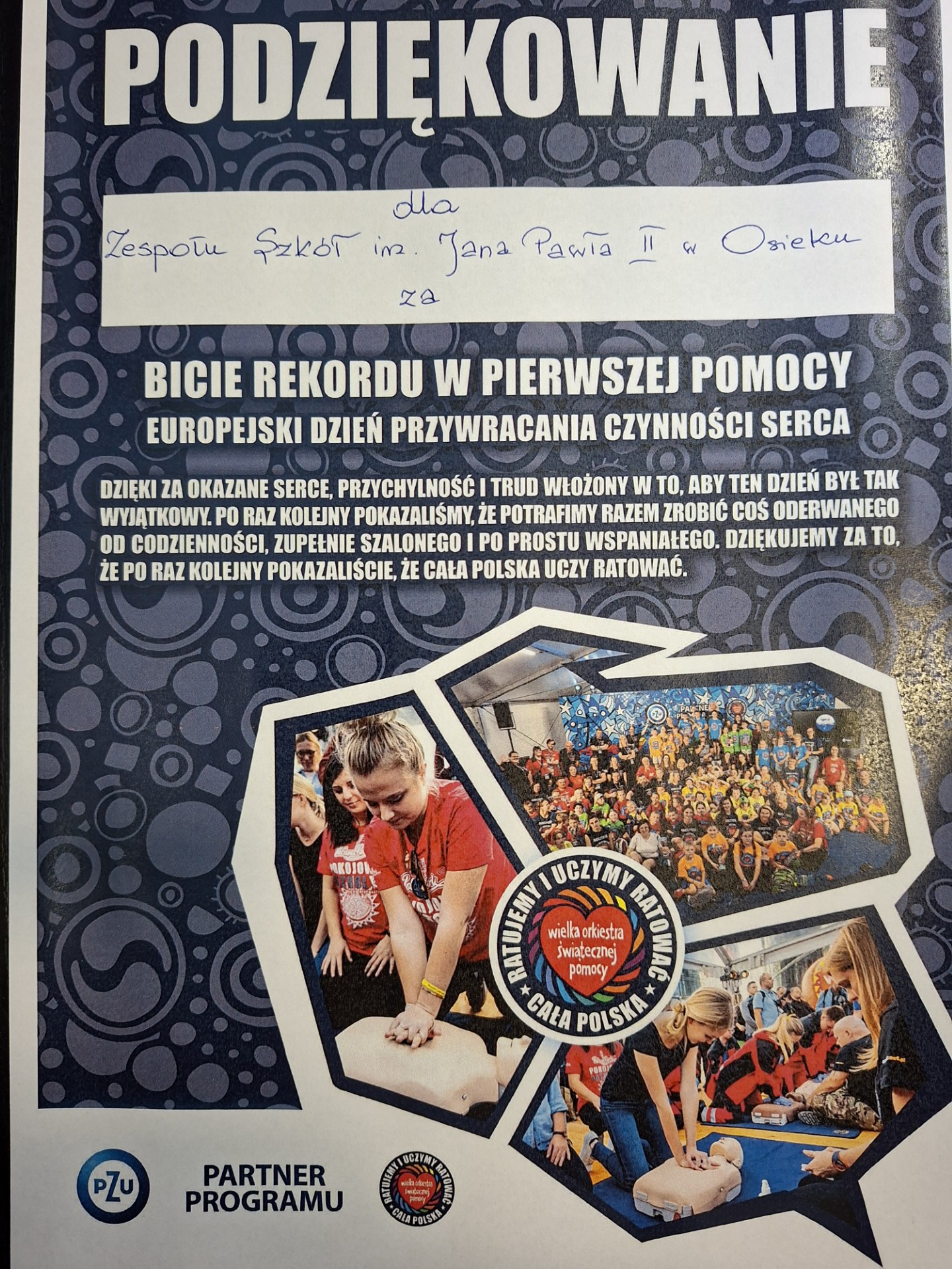W ramach obchodów Światowego Dnia Przywracania Czynności Serca w naszej szkole odbyły się zajęcia poświęcone udzielaniu pierwszej pomocy i obsłudze defibrylatora AED.
