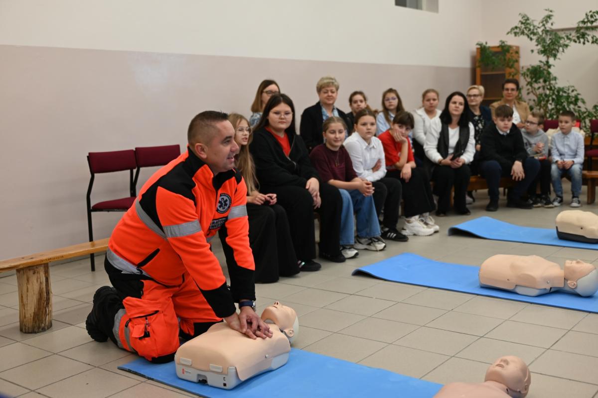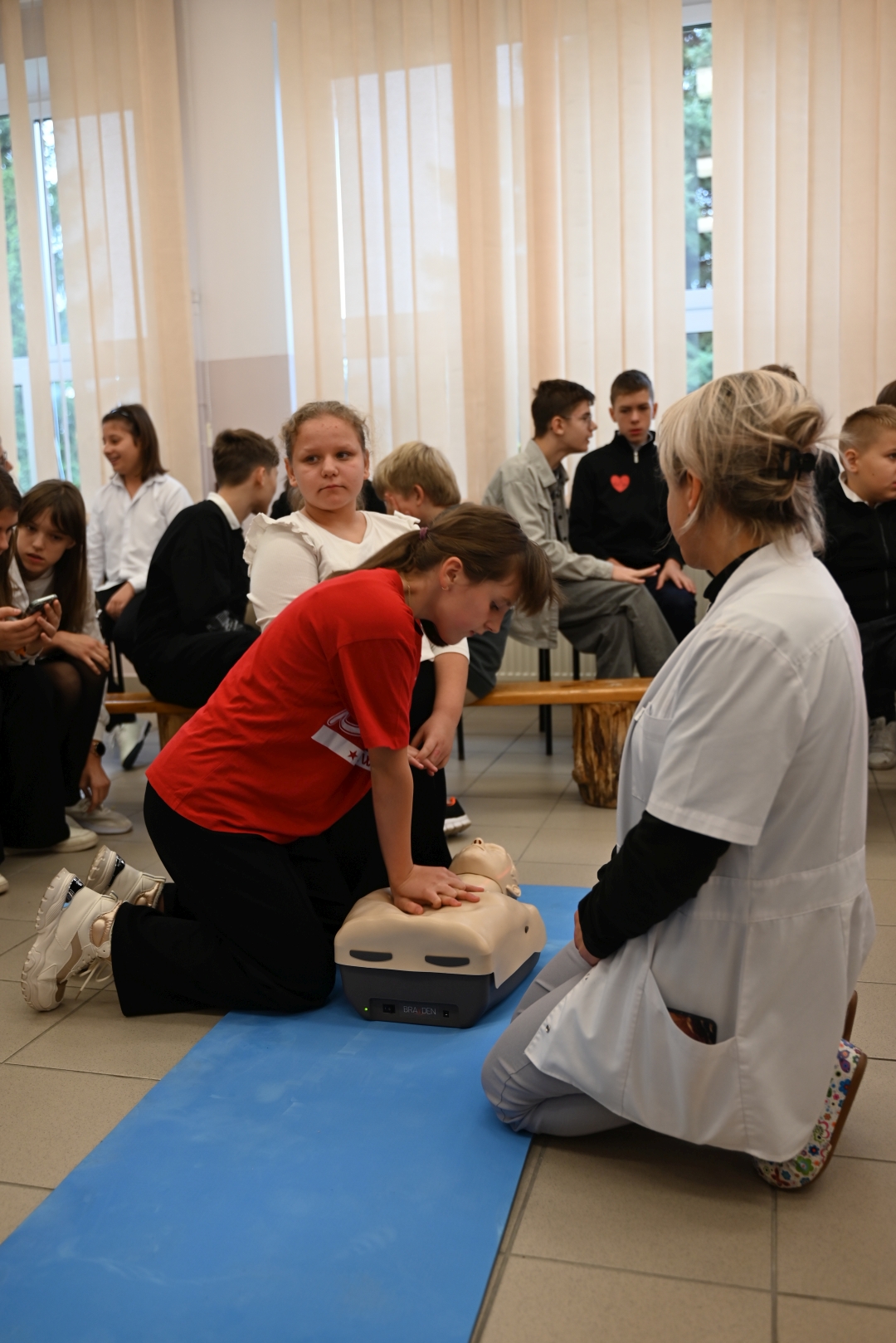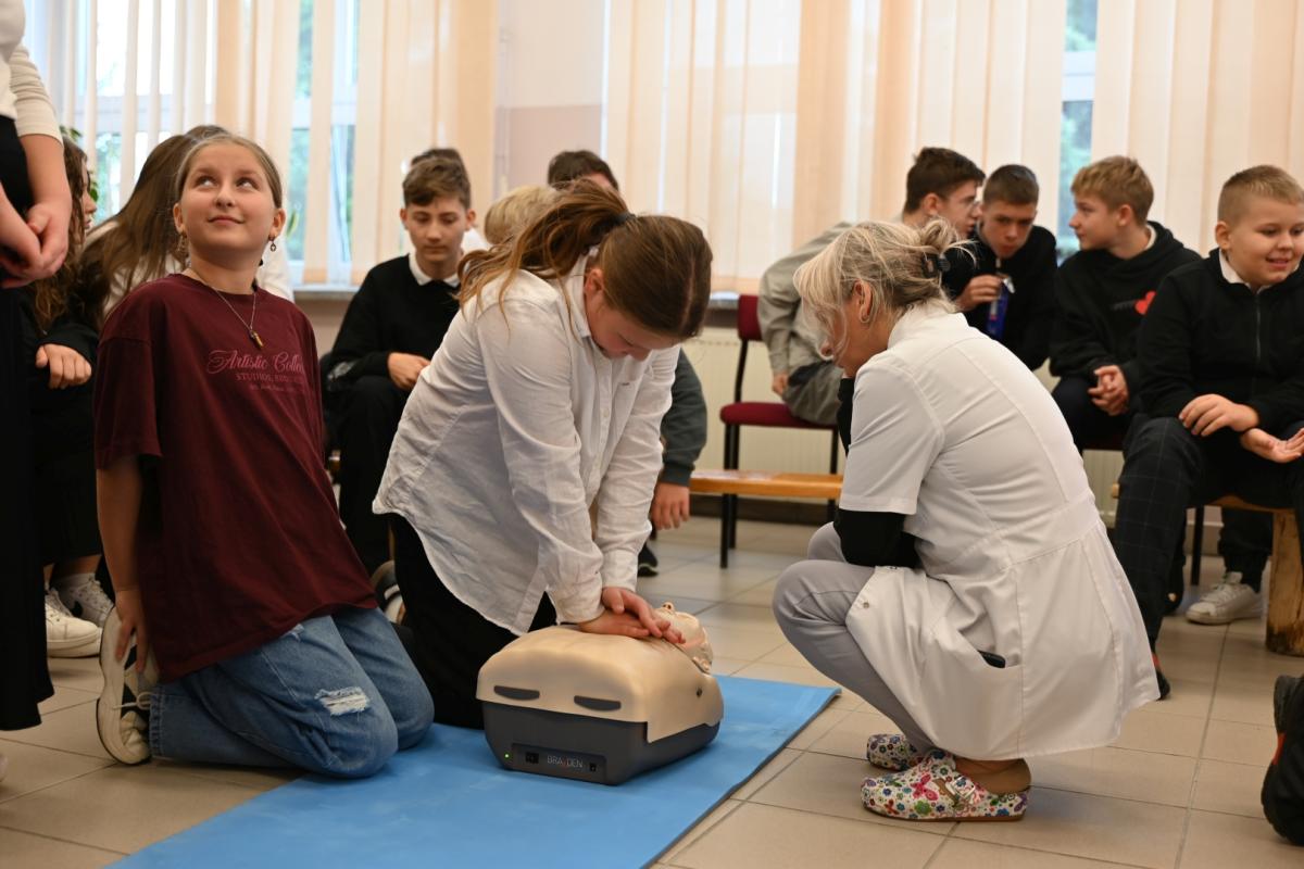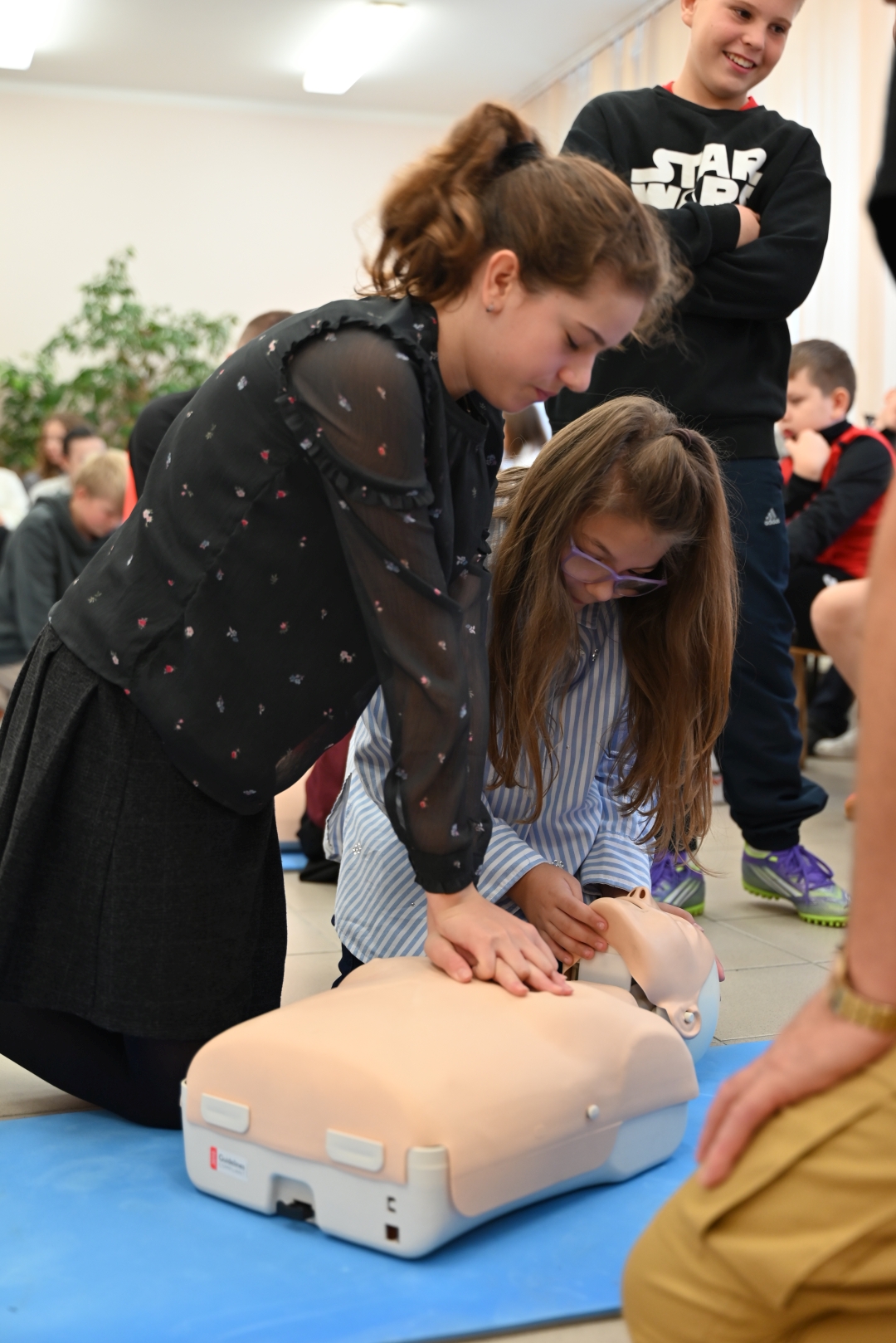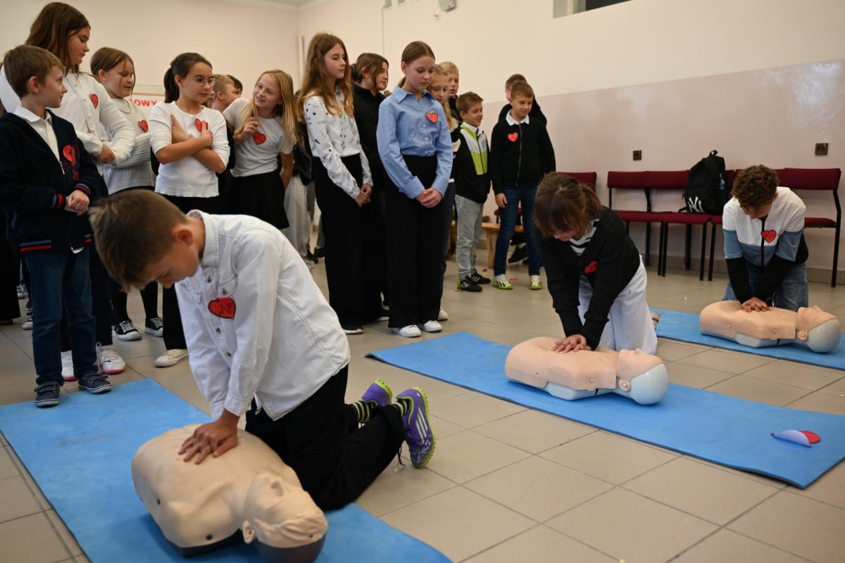 Podczas zajęć uczniowie – zarówno młodsi, jak i starsi – z ogromnym zaangażowaniem ćwiczyli resuscytację krążeniowo-oddechową (RKO) oraz prawidłowe użycie defibrylatora AED. Przypomnieli sobie, jak ważna jest pomoc drugiemu człowiekowi i że od ich reakcji może zależeć czyjeś życie.