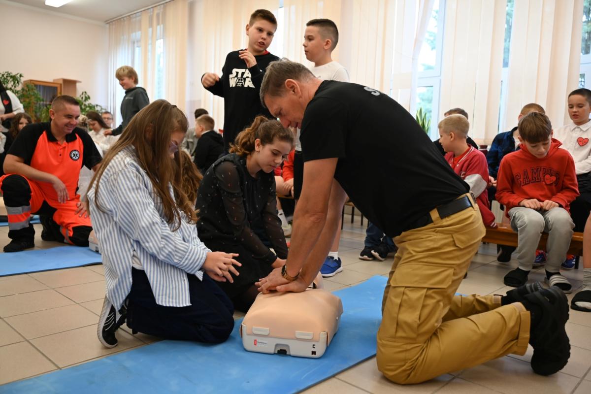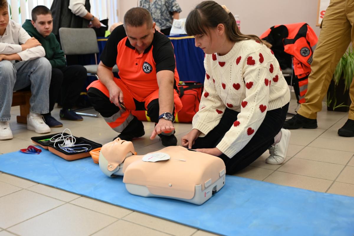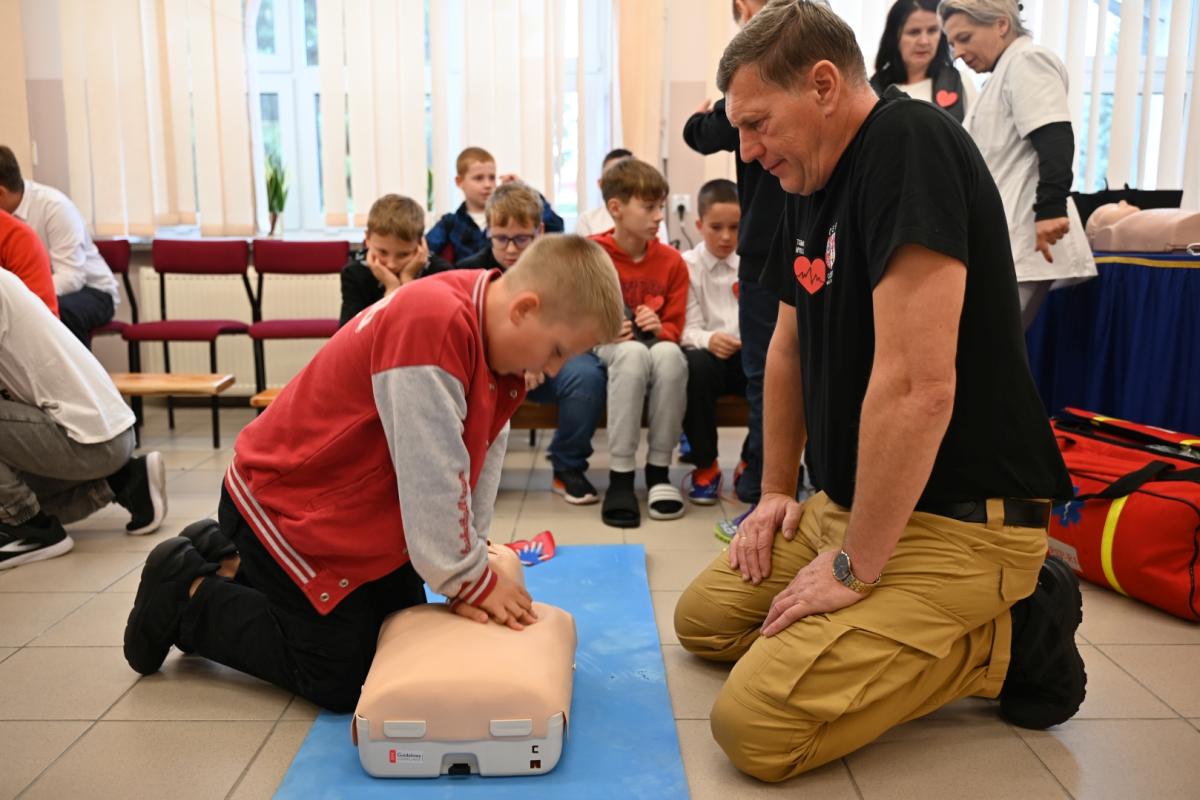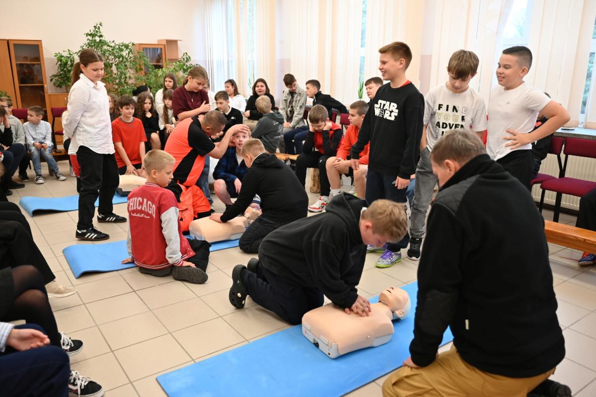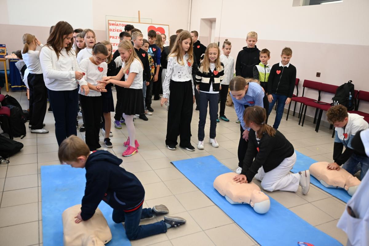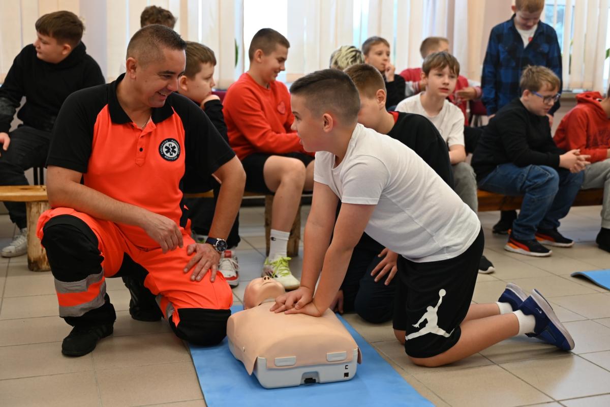 Podczas zajęć uczniowie – zarówno młodsi, jak i starsi – z ogromnym zaangażowaniem ćwiczyli resuscytację krążeniowo-oddechową (RKO) oraz prawidłowe użycie defibrylatora AED. Przypomnieli sobie, jak ważna jest pomoc drugiemu człowiekowi i że od ich reakcji może zależeć czyjeś życie.